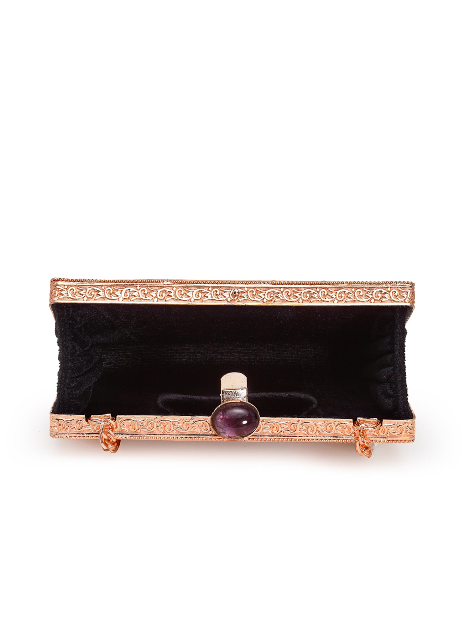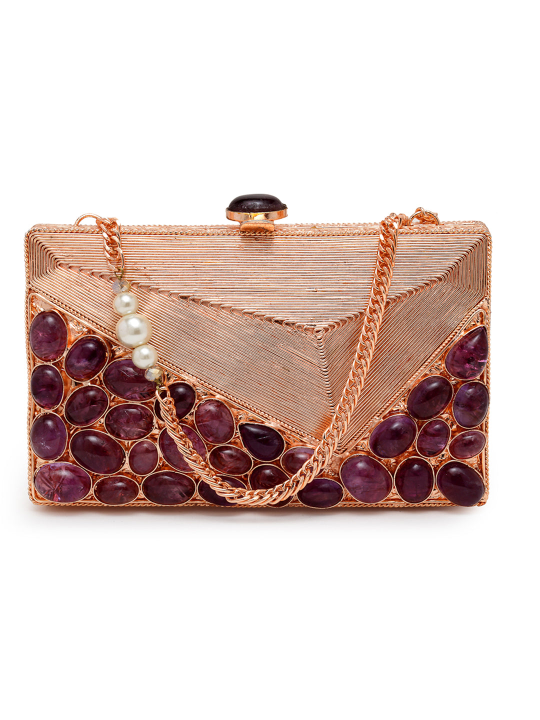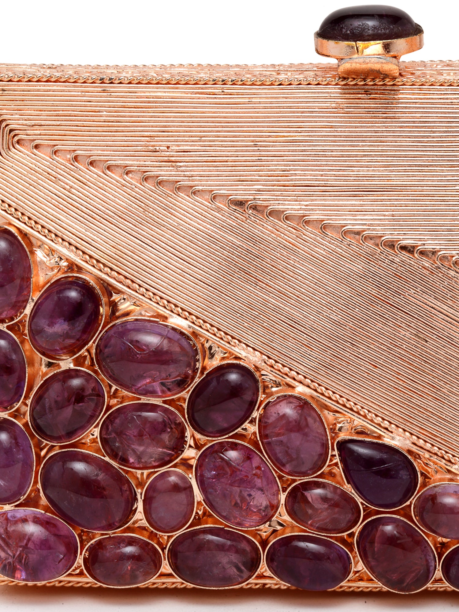 A timeless glamorous evening bag with a clutch silhouette embedded with cabochon amethysts. Inside, it offers ample space to organize your essentials. It has a detachable chain sling and the clutch provides versatile styling options, making it a must-have accessory for any chic ensemble!
