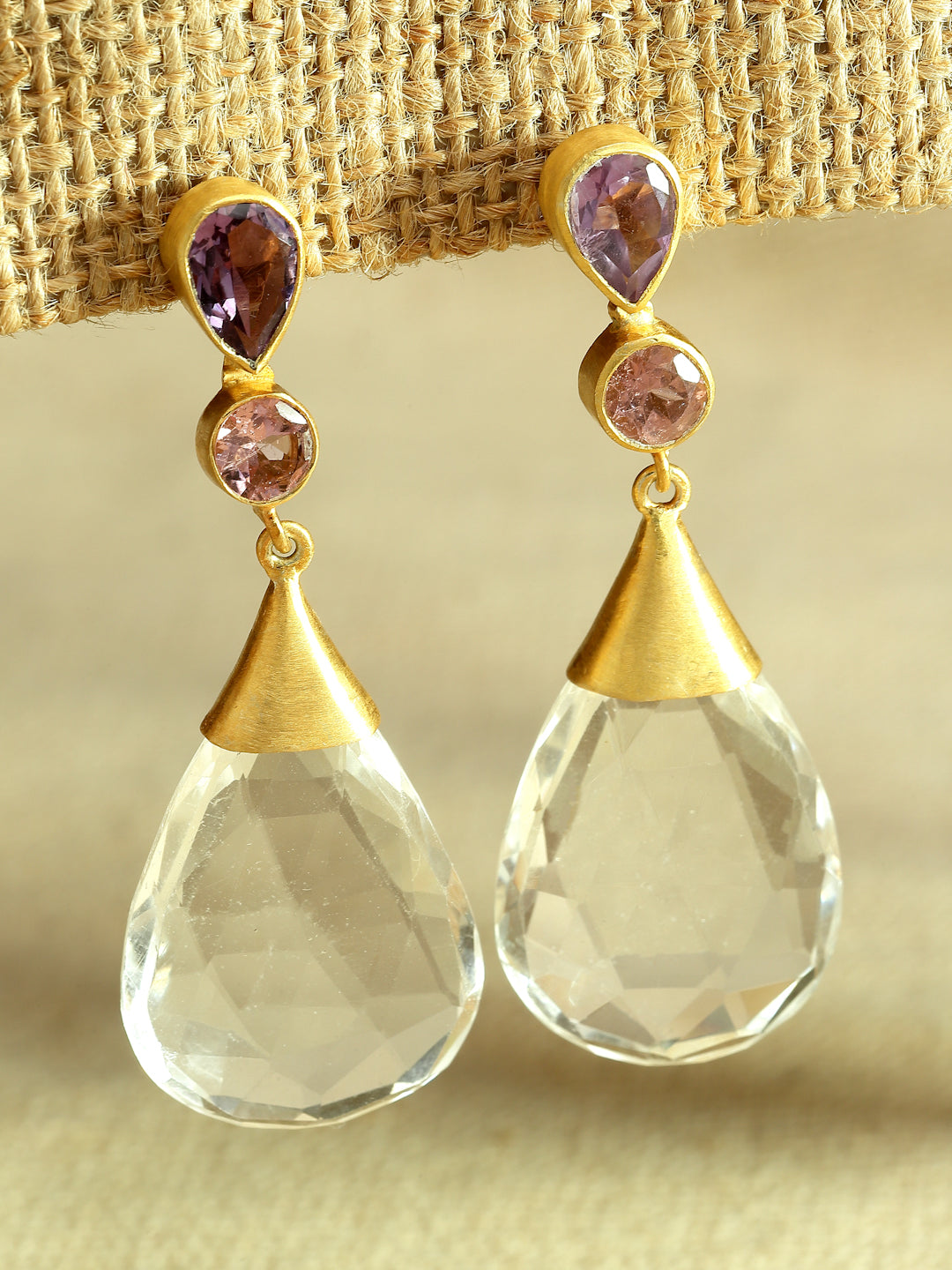 Pure hand cut crystal danglers with accents of peridot and amethyst finished in gold plated burnished silver.