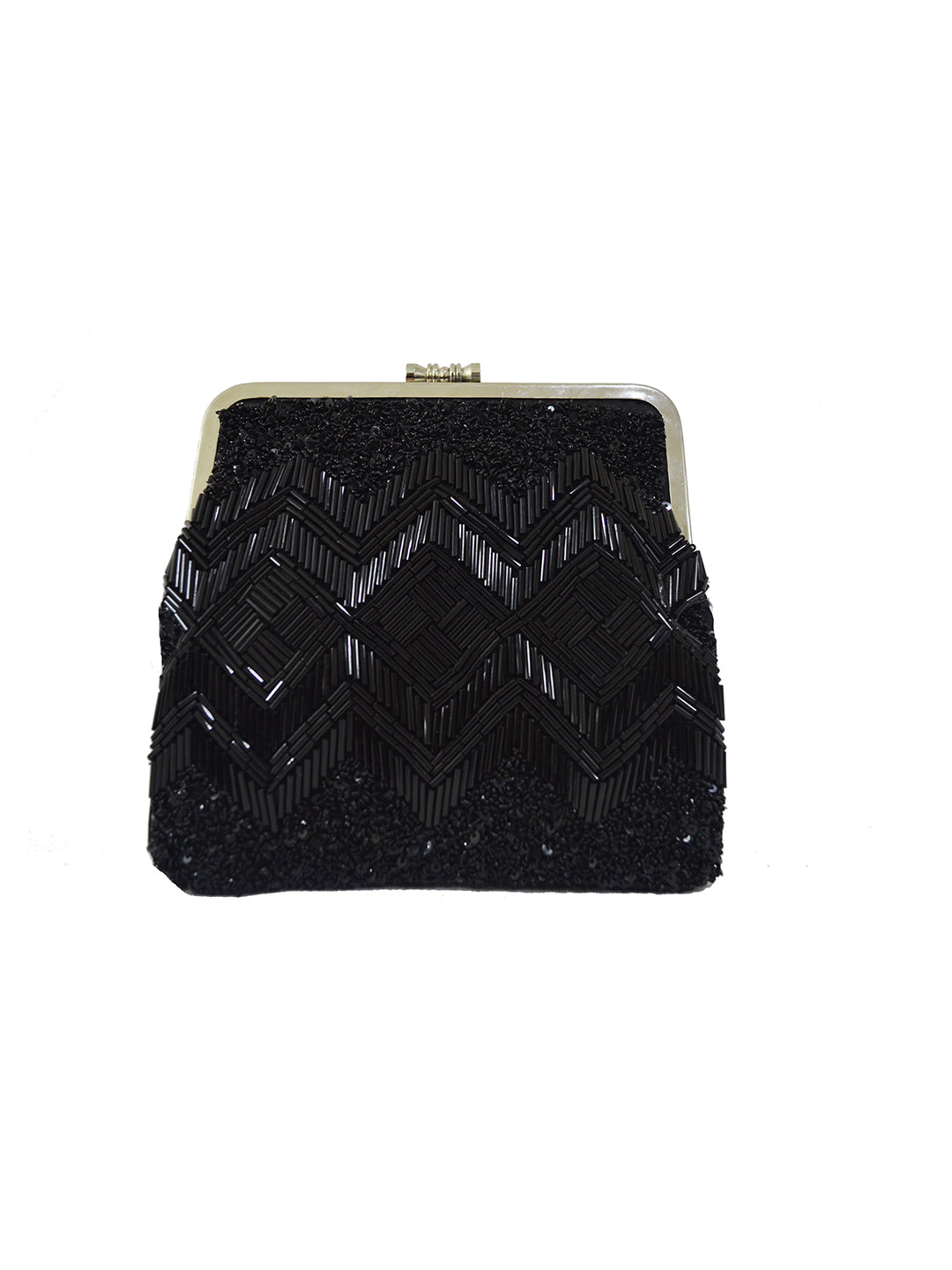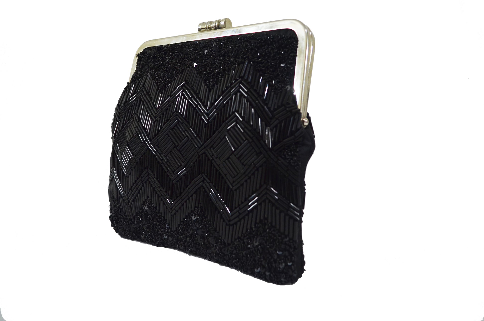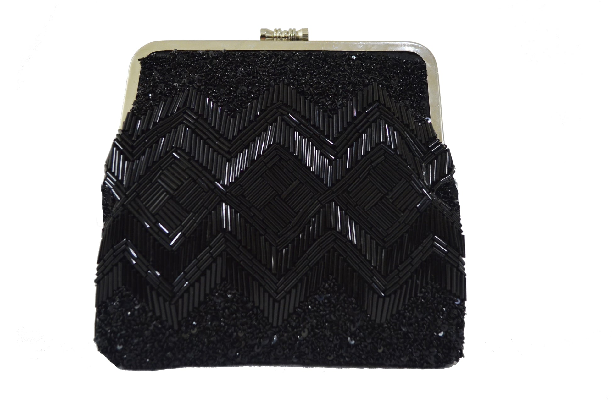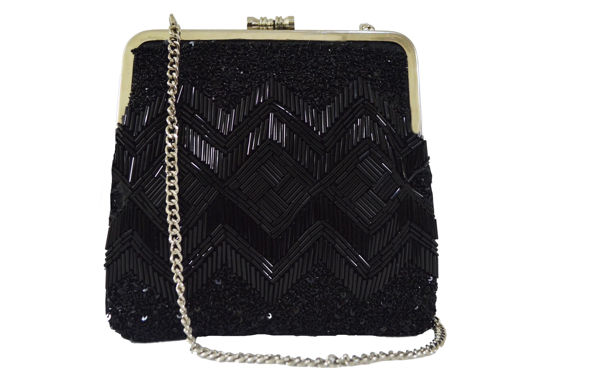 All-over Embroided stitched on an antique vintage half frame. It has a detachable chain handle.