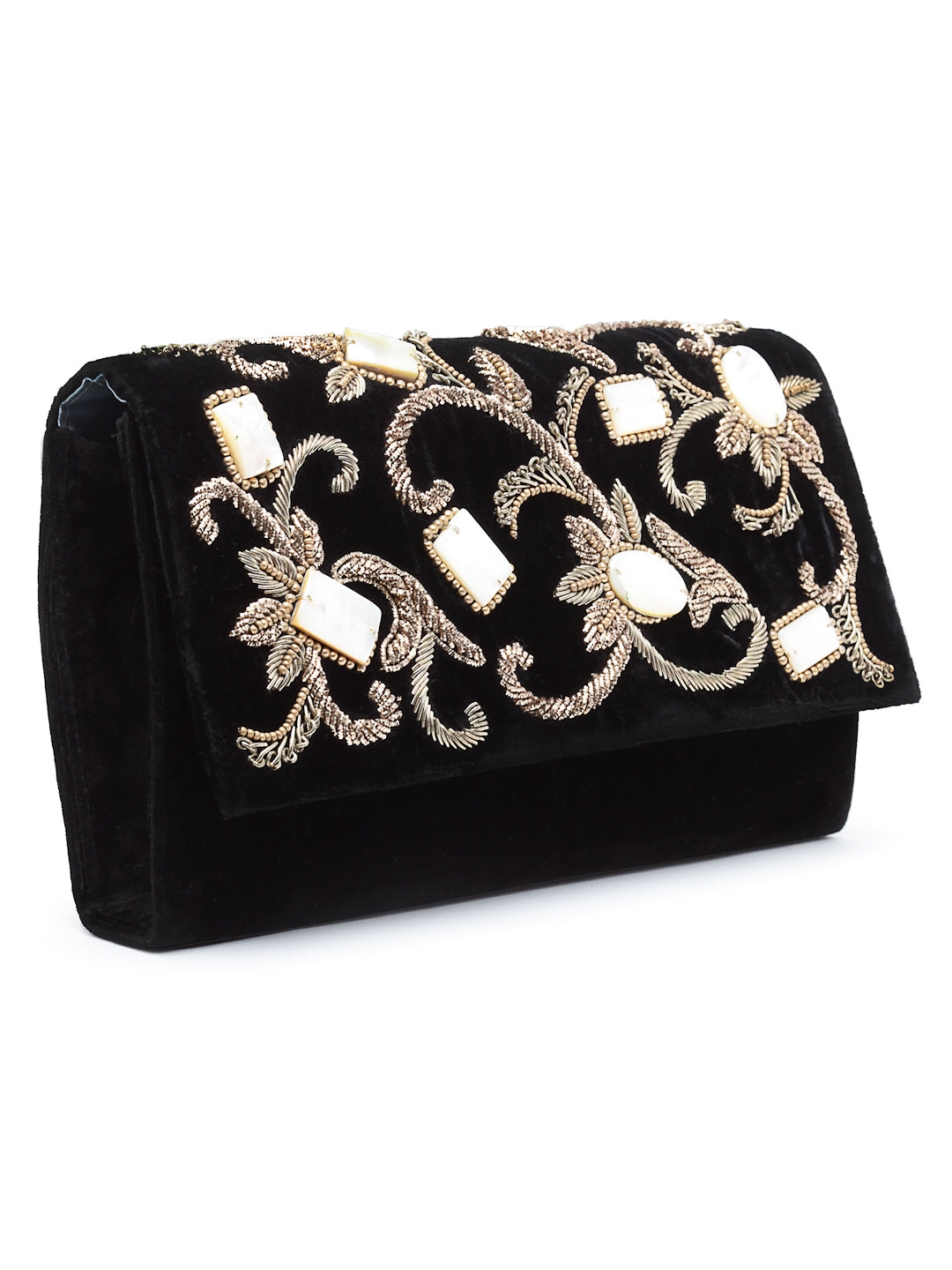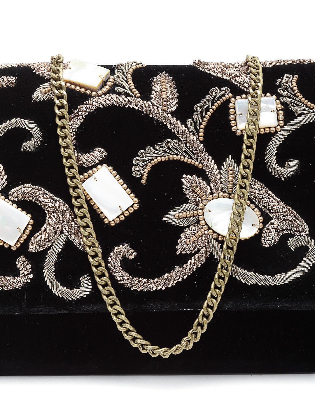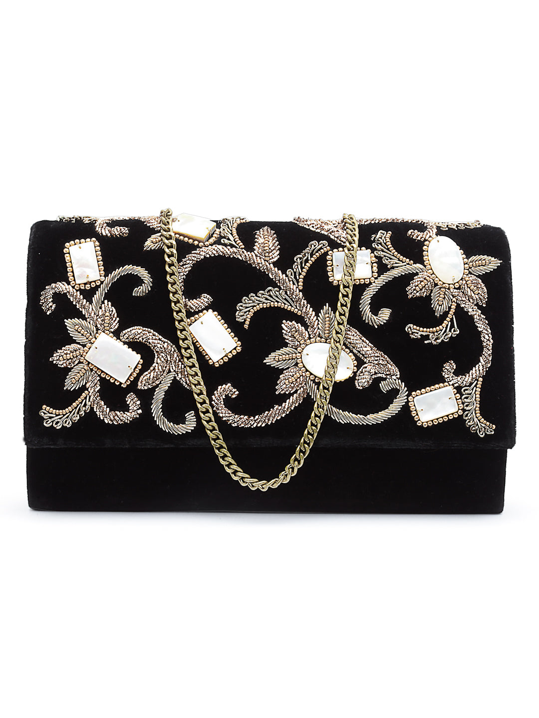 All-over embroided with mother of pearl . It has a detachable chain handle. Stitched on Velvet