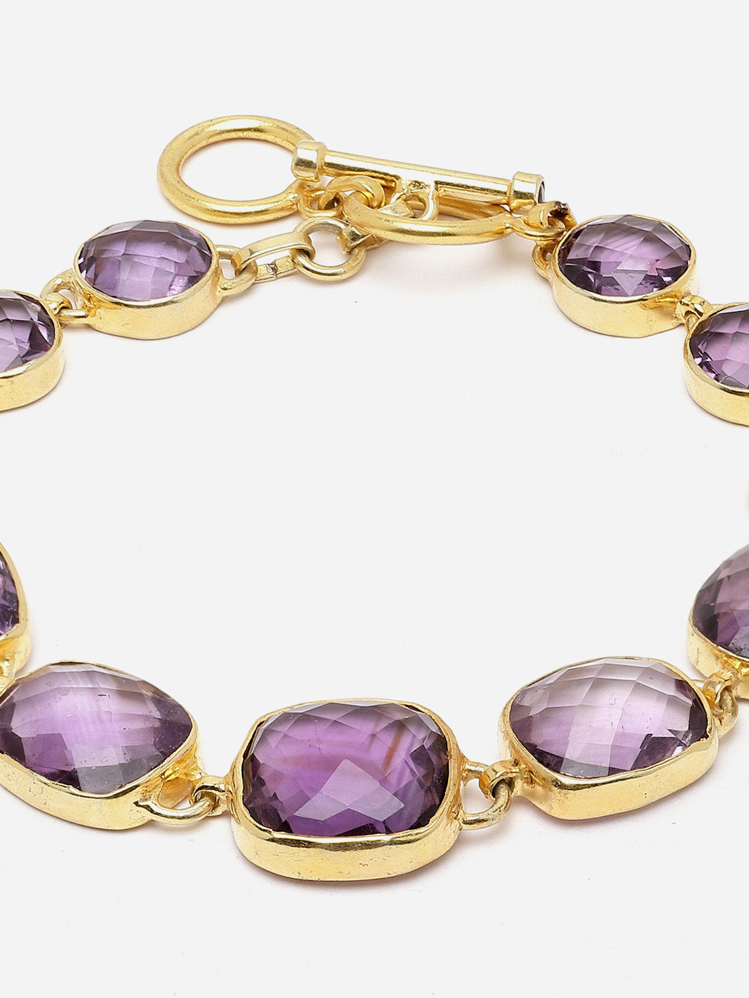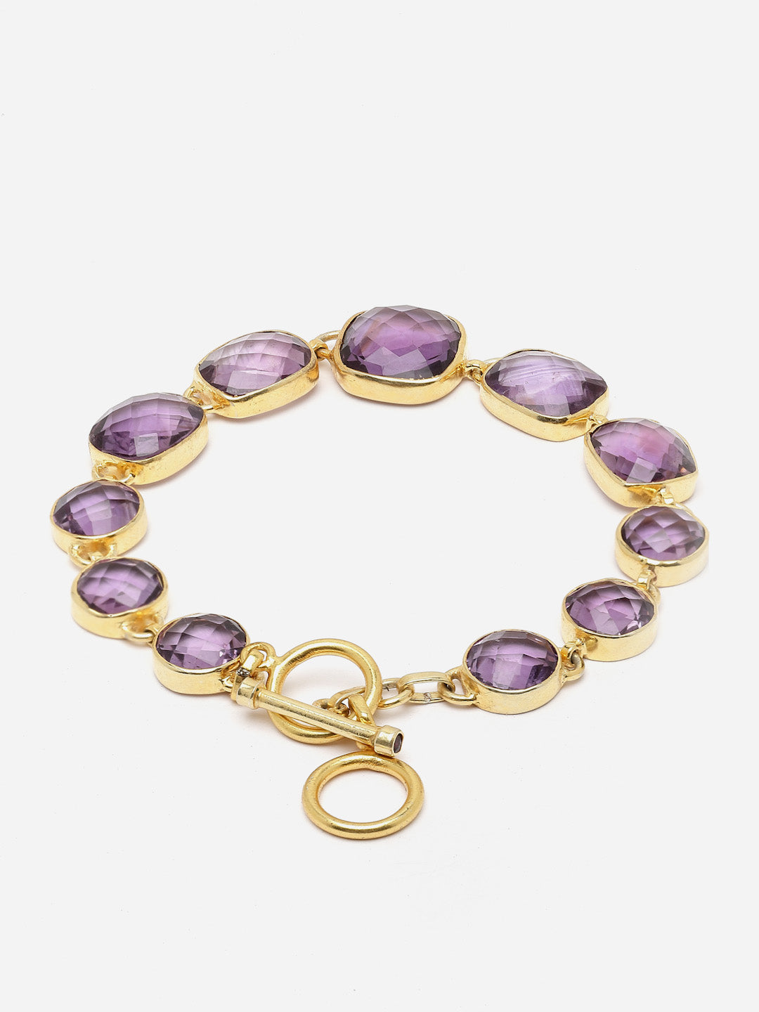 Facetted acetted cushion cut amethysts form this very pretty bracelet.Gold plated sterling silver, toggle closure.
