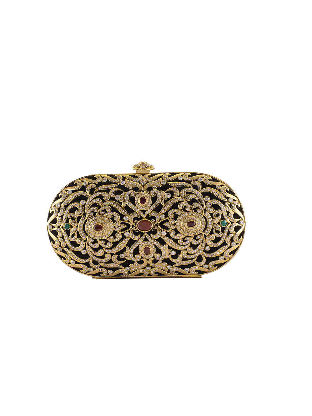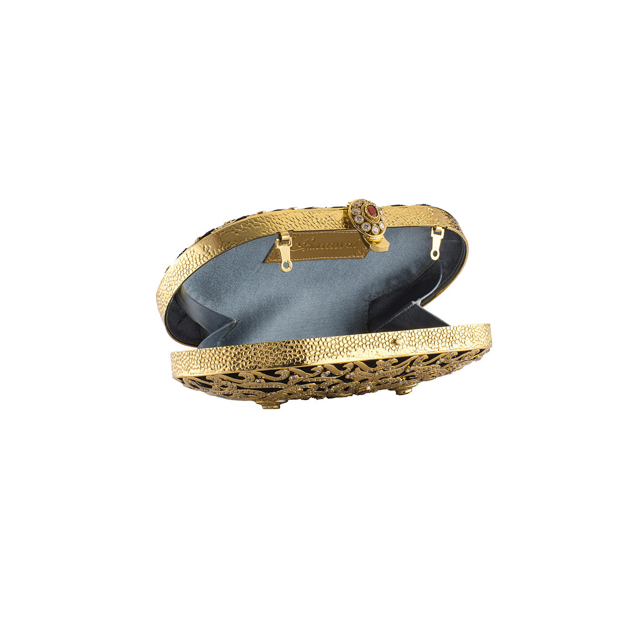 A timeless glamorous evening bag with fine filigree work and embedded with rhinestones. Inside, it offers ample space to organize your essentials. It has a detachable chain sling and the clutch provides versatile styling options, making it a must-have accessory for any chic ensemble!
