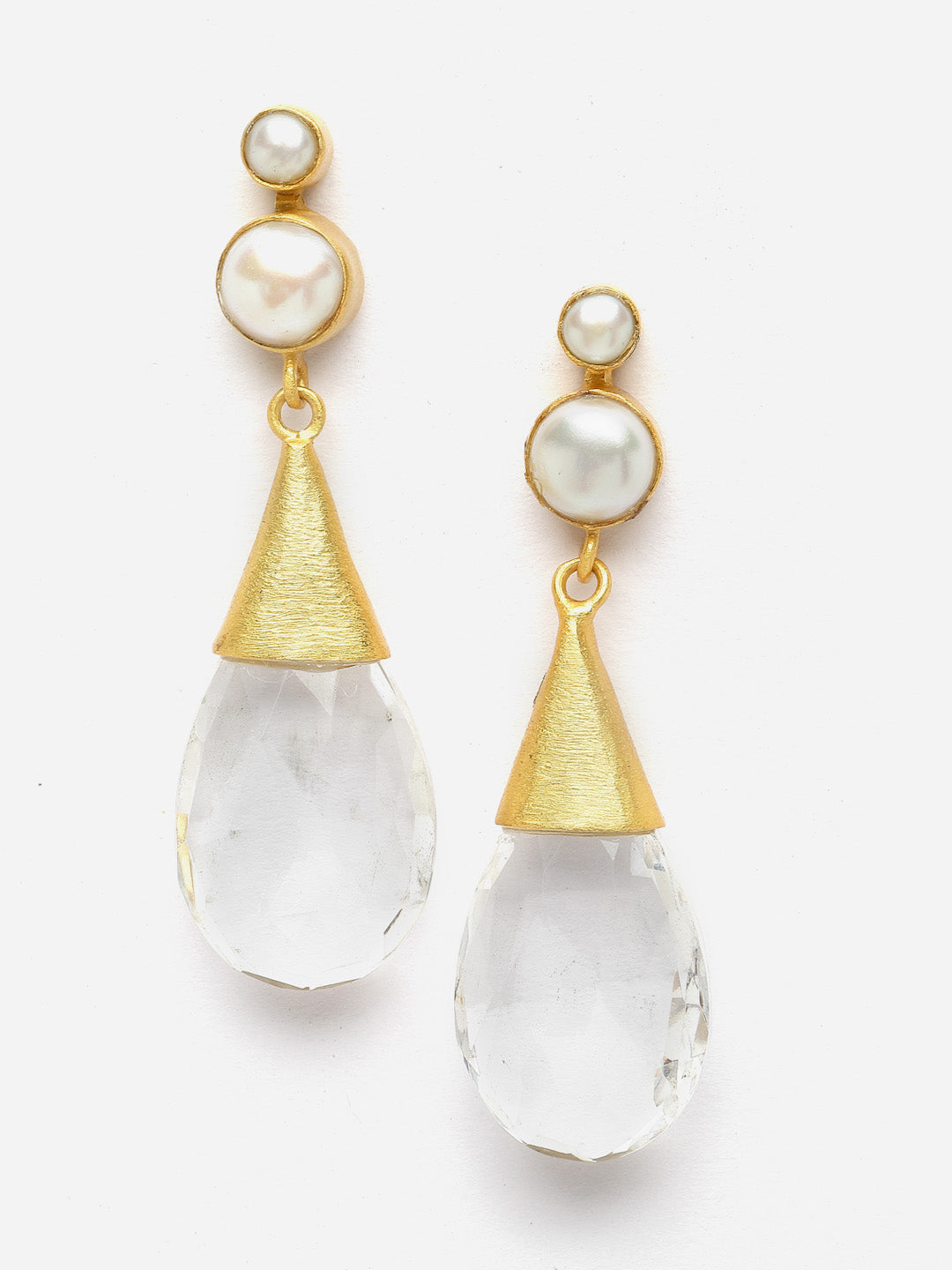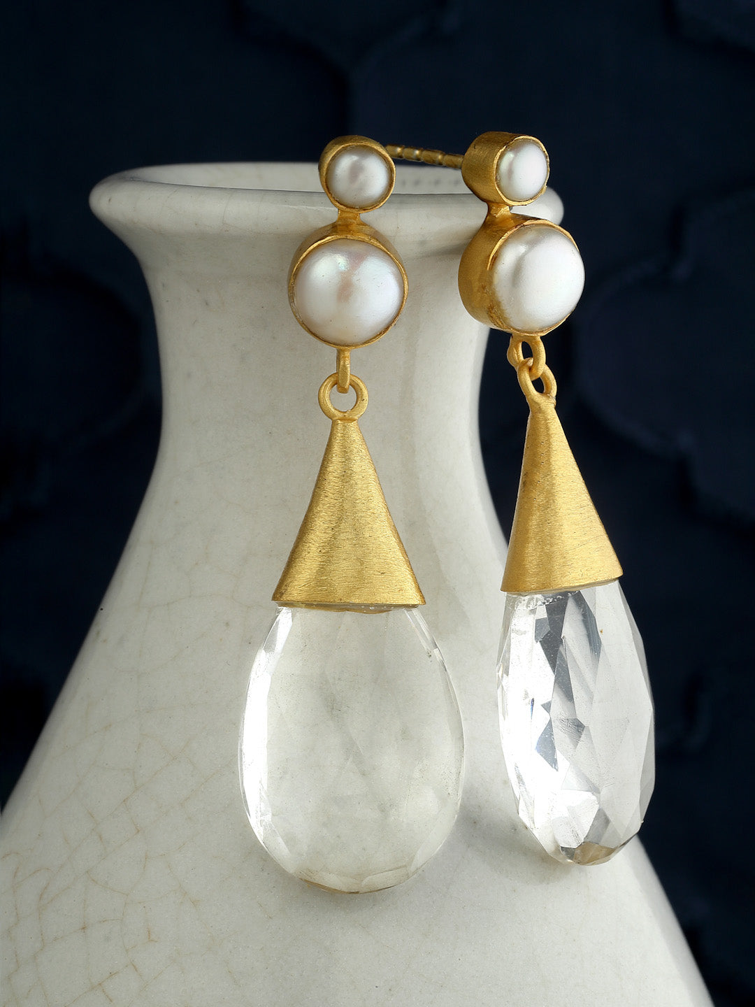 Pure hand cut crystal danglers with accents of natural pearl, finished in gold plated burnished silver.