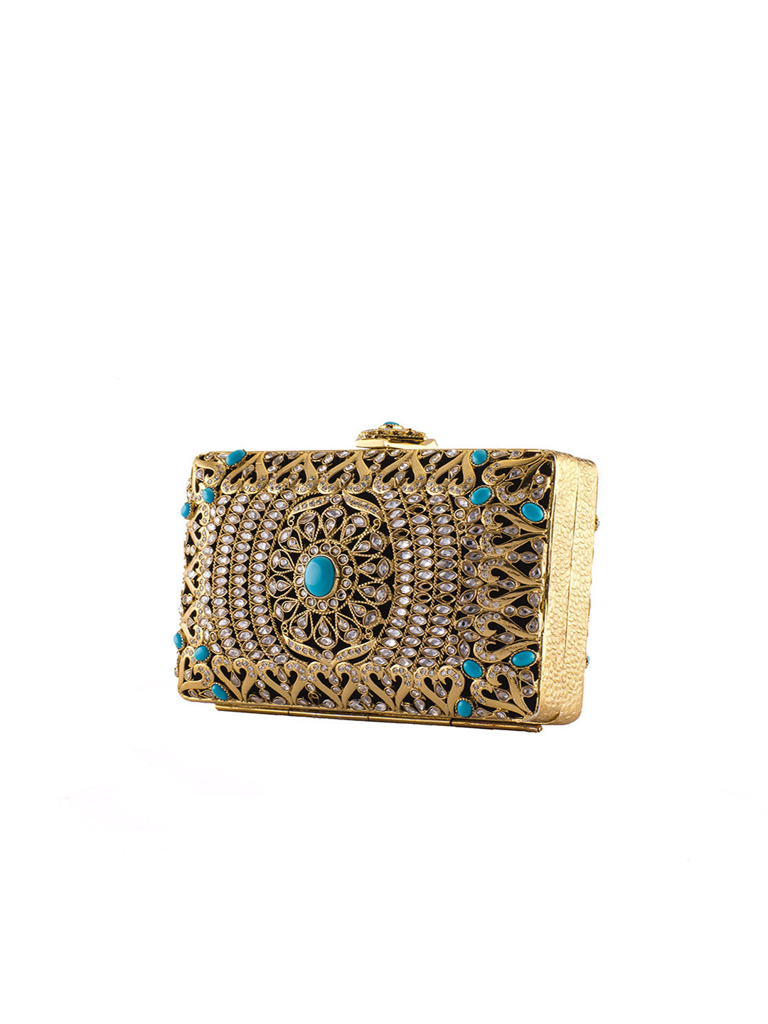 A timeless glamorous evening bag with filigree work and embedded with turquoise rhinestones. Inside, it offers ample space to organize your essentials. It has a detachable chain sling and the clutch provides versatile styling options, making it a must-have accessory for any chic ensemble!