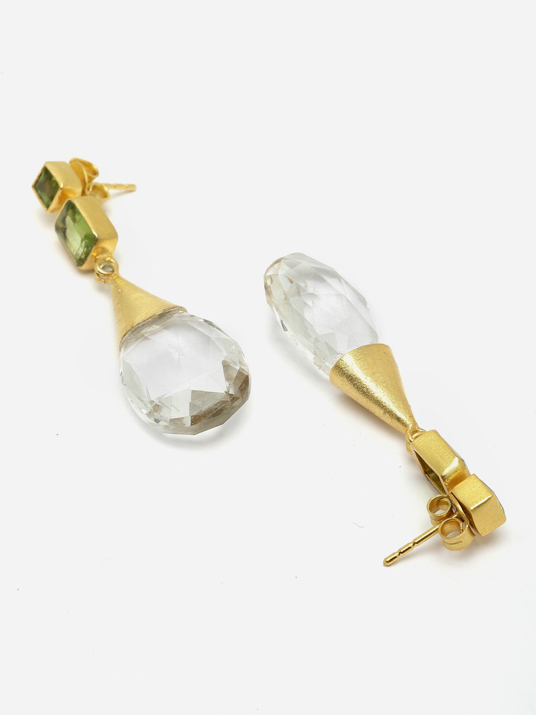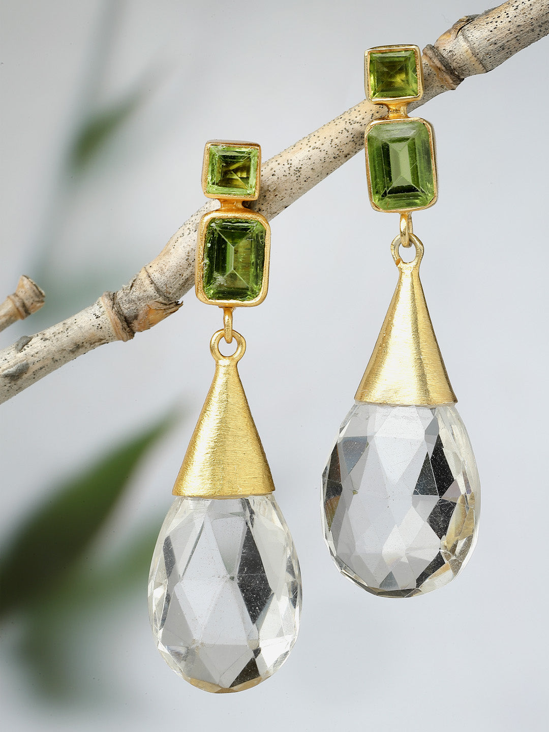Pure hand cut crystal danglers with accents of peridot and citrine finished in gold plated burnished silver