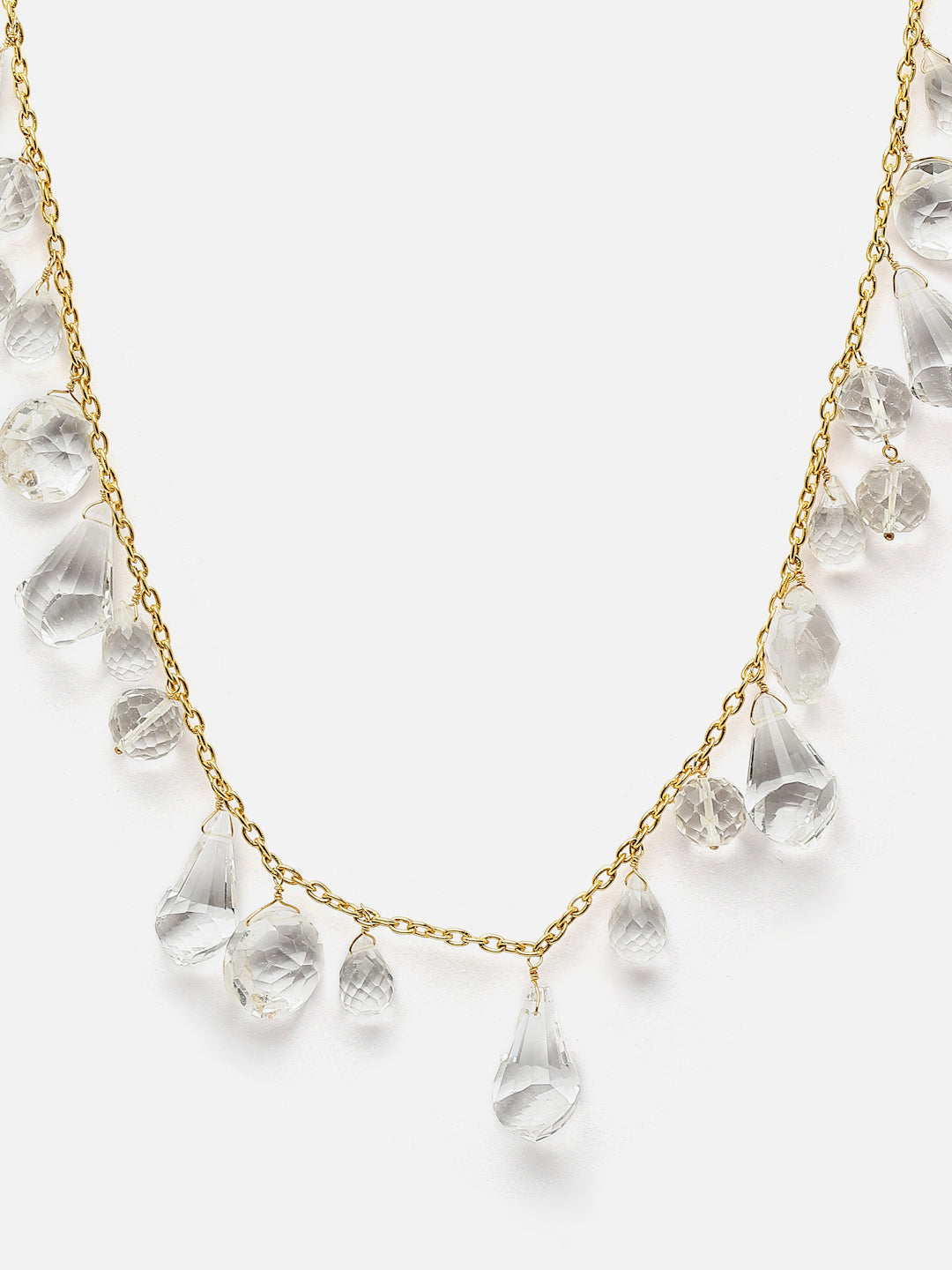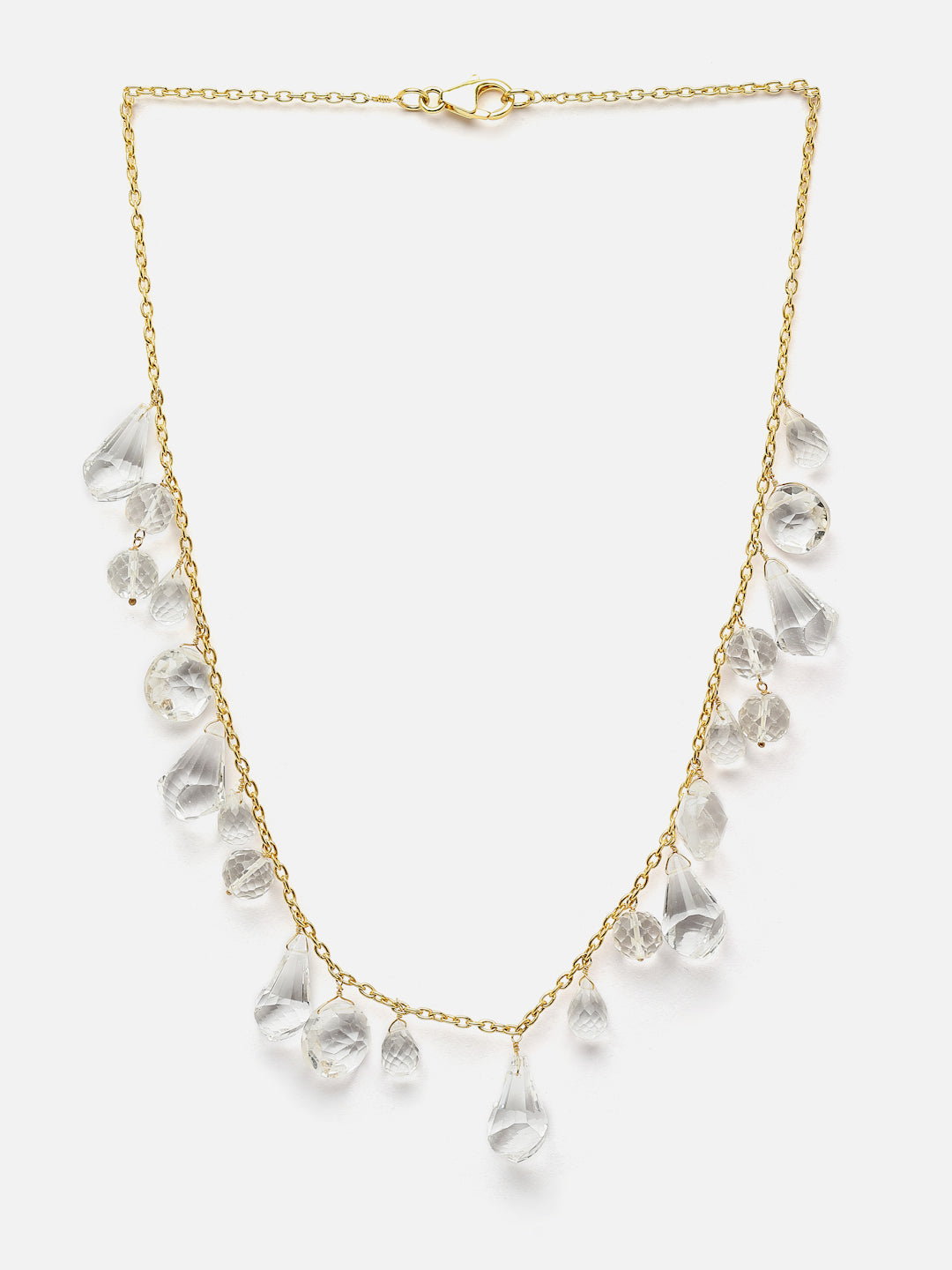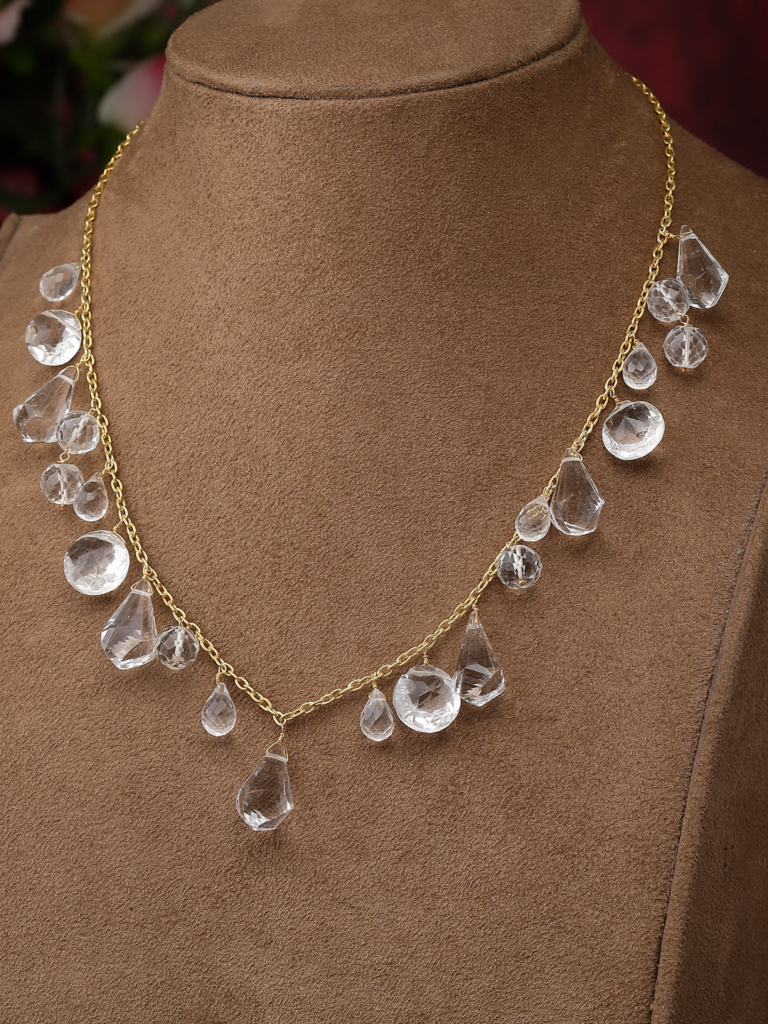 Facetted crystal drops suspended from a gold plated sterling silver chain.
