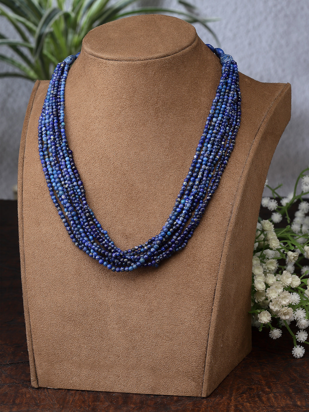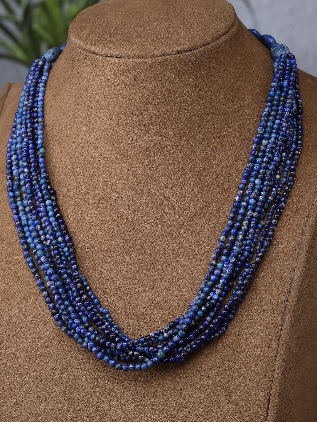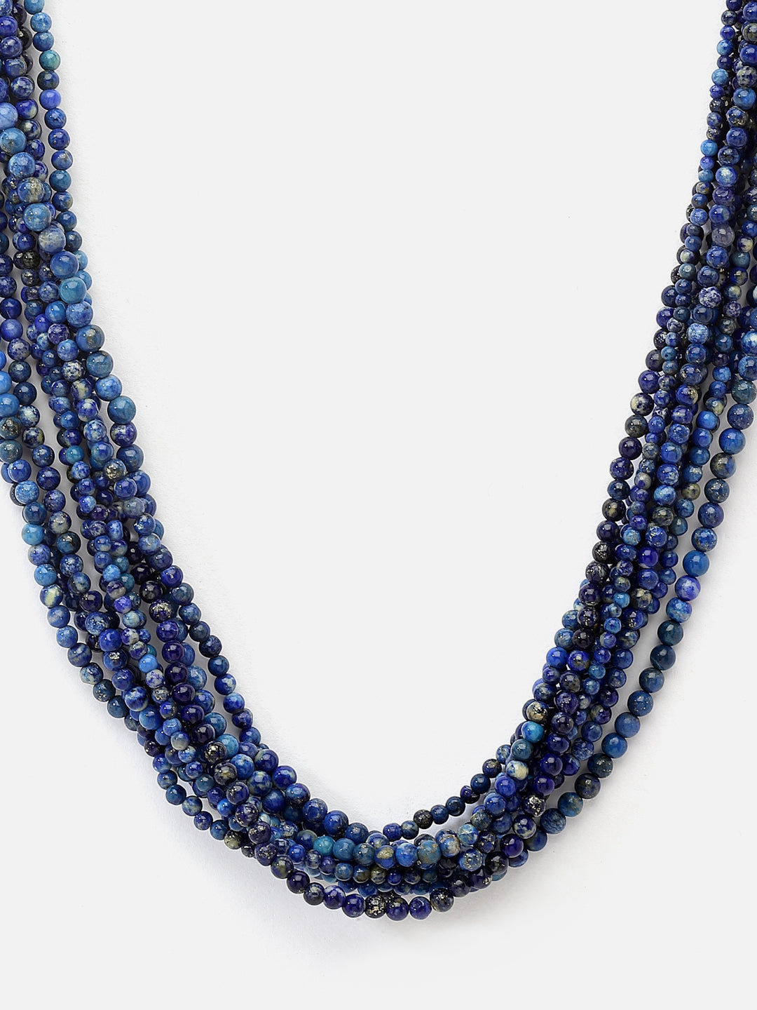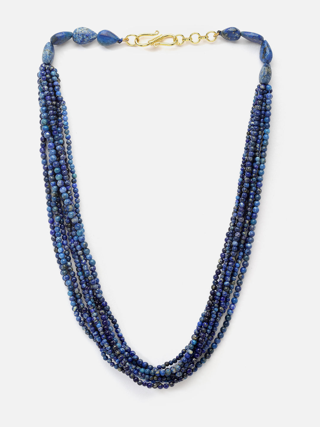 Multilayered 9 line necklace made with lapis lazuli beads, finished with flat speckled lapis and a silver S hook closure.