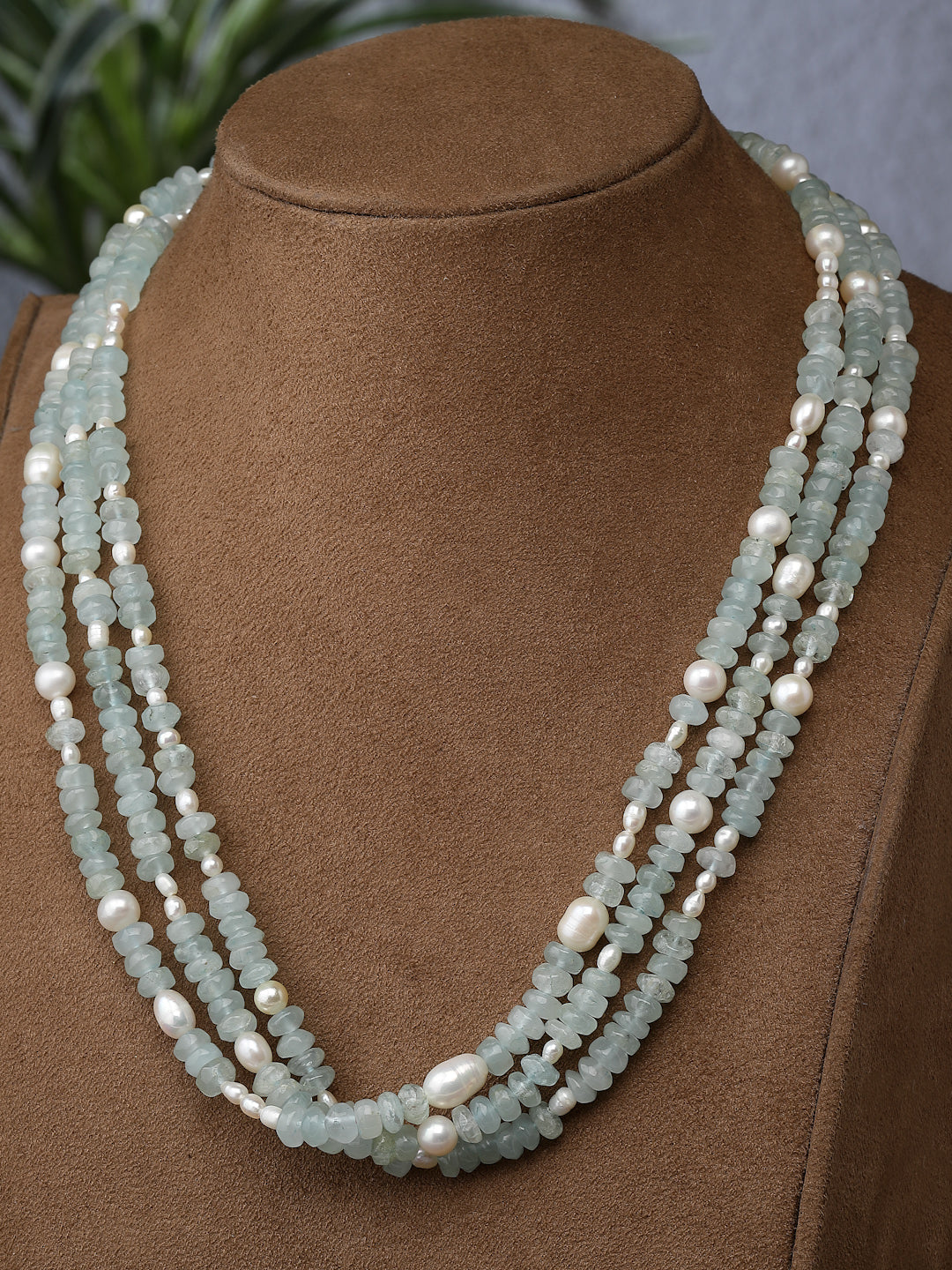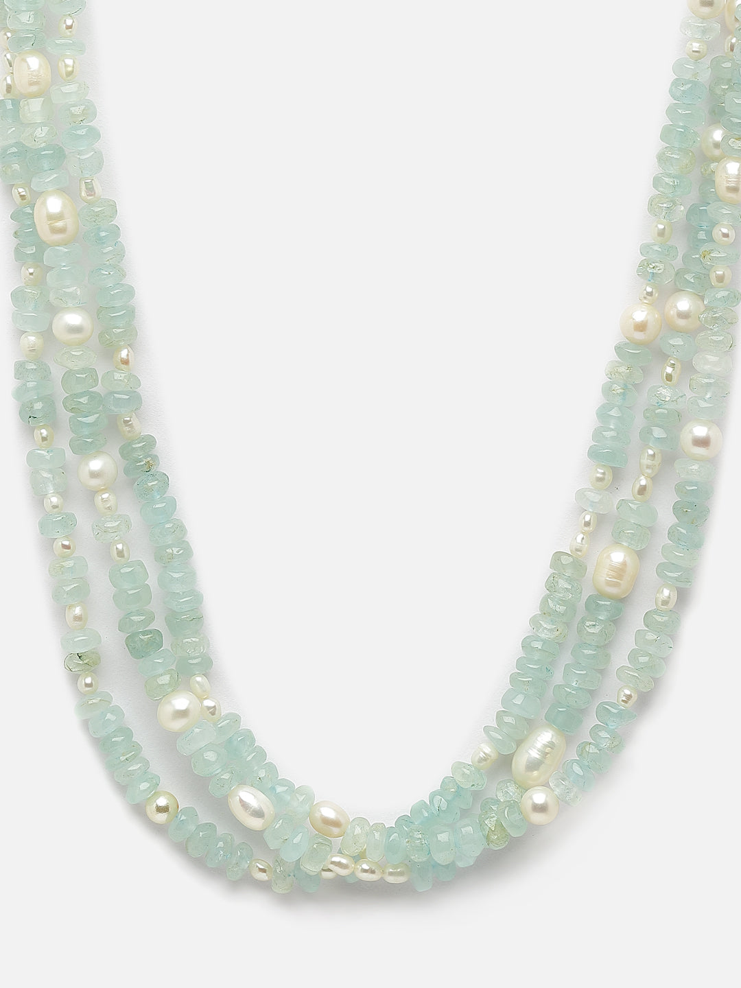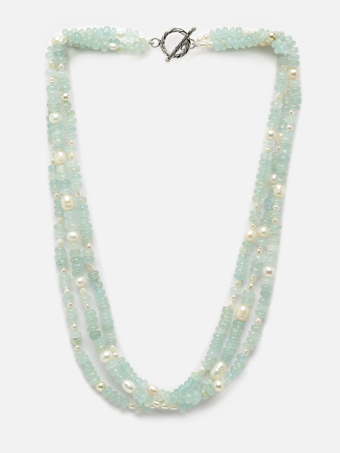 A 3 lined necklace made with cabochon aquamarine beads interspersed with natural pearls.Sterling silver toggle closure.