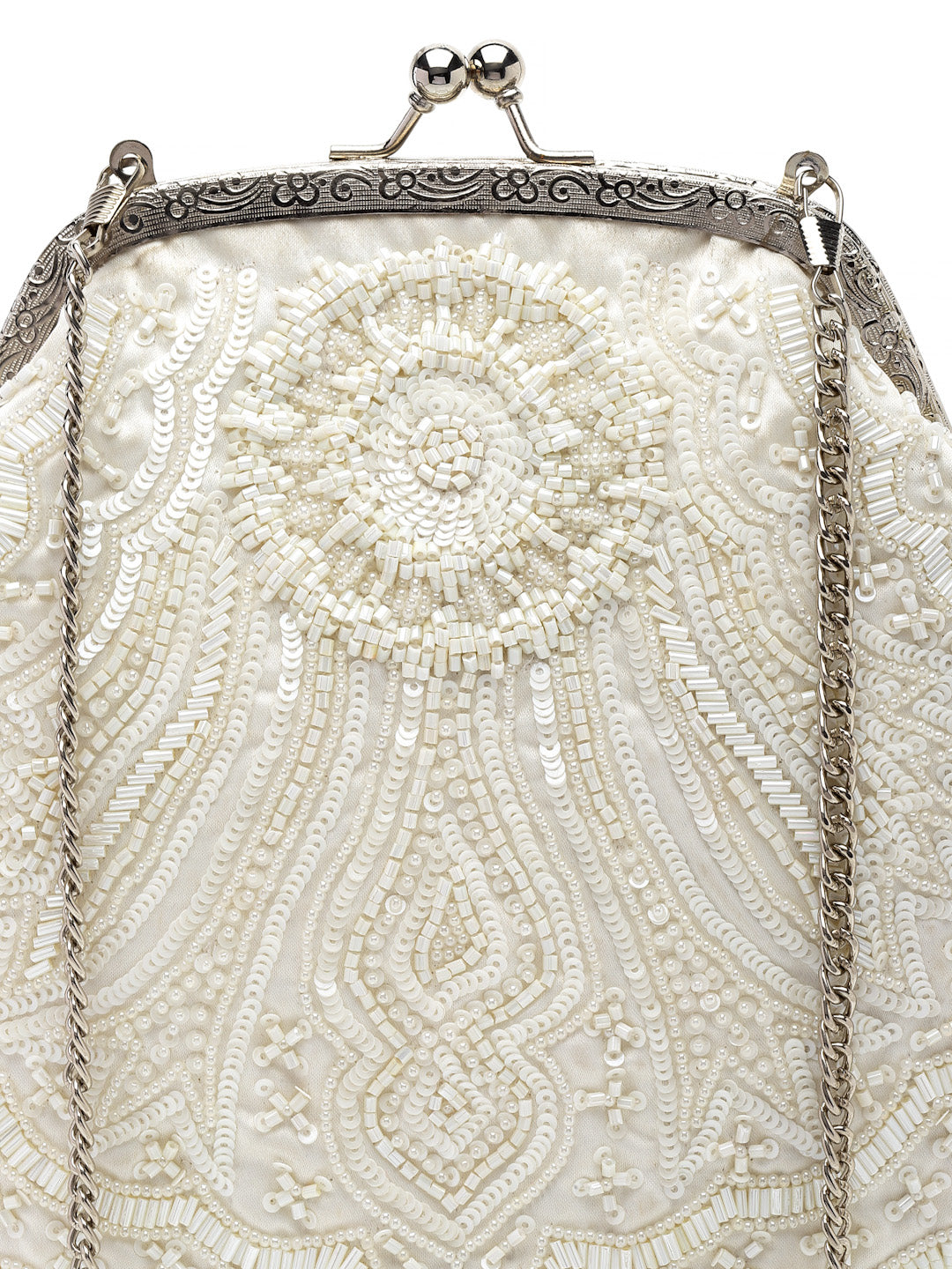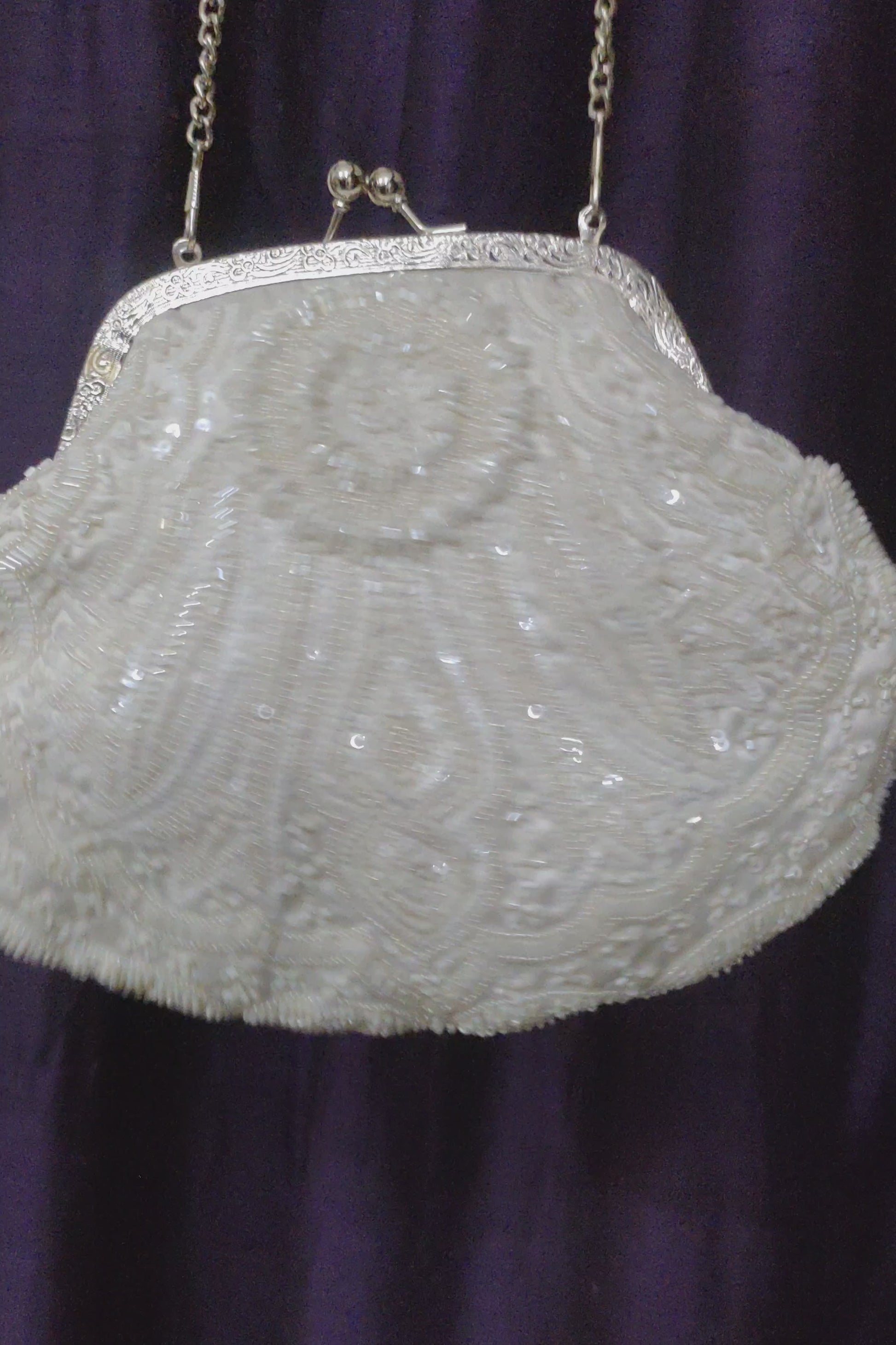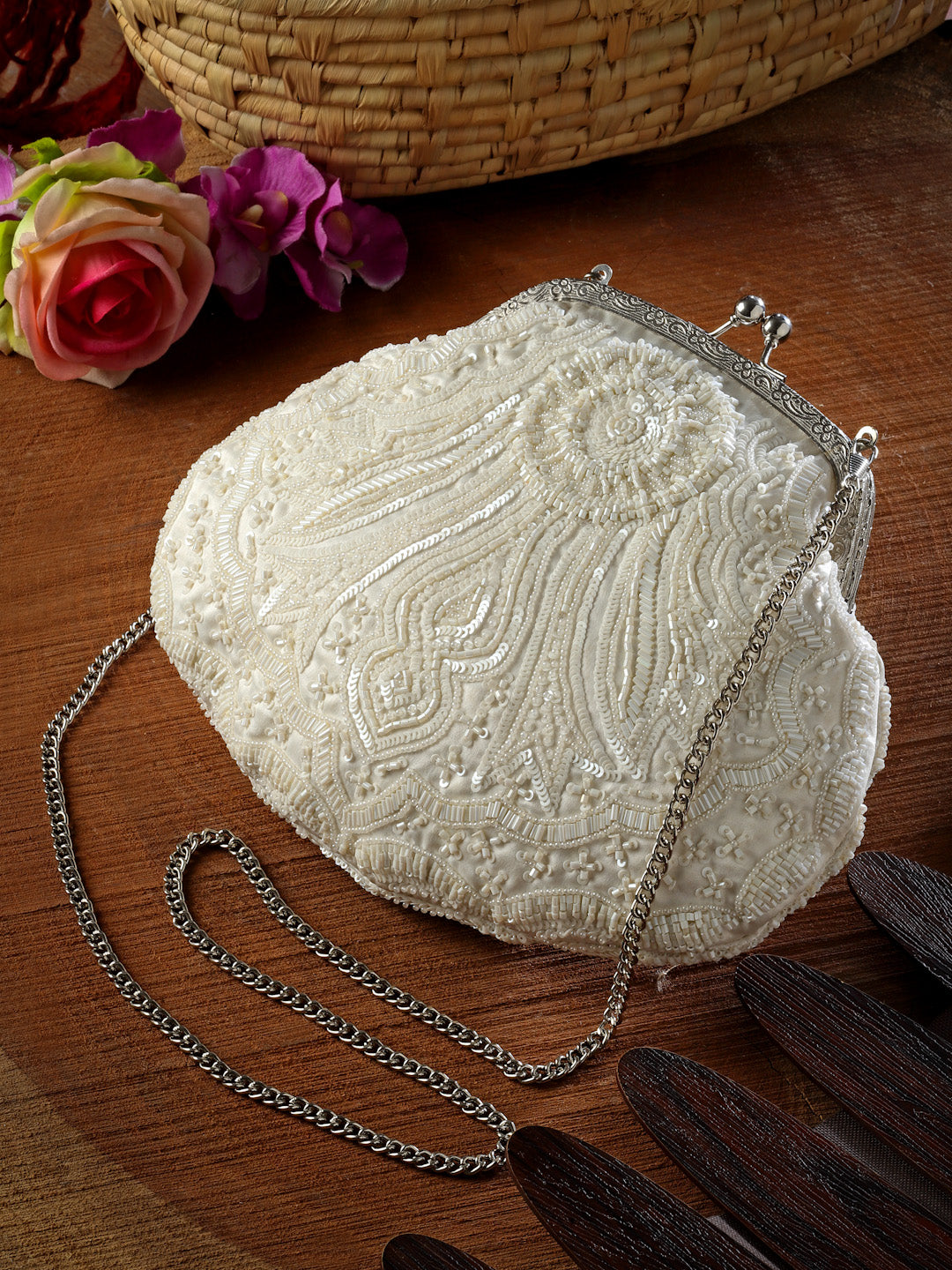 Elevate your elegance with our exquisitely crafted embroidered silk clutch bags. Each piece is adorned with intricate bead and sequin embroidery, showcasing a timeless blend of artistry and sophistication. The kiss lock half frame adds a vintage charm while ensuring your essentials are securely enclosed. Perfect for special occasions or adding a touch of luxury to your everyday ensemble.It has a detachable chain handle.