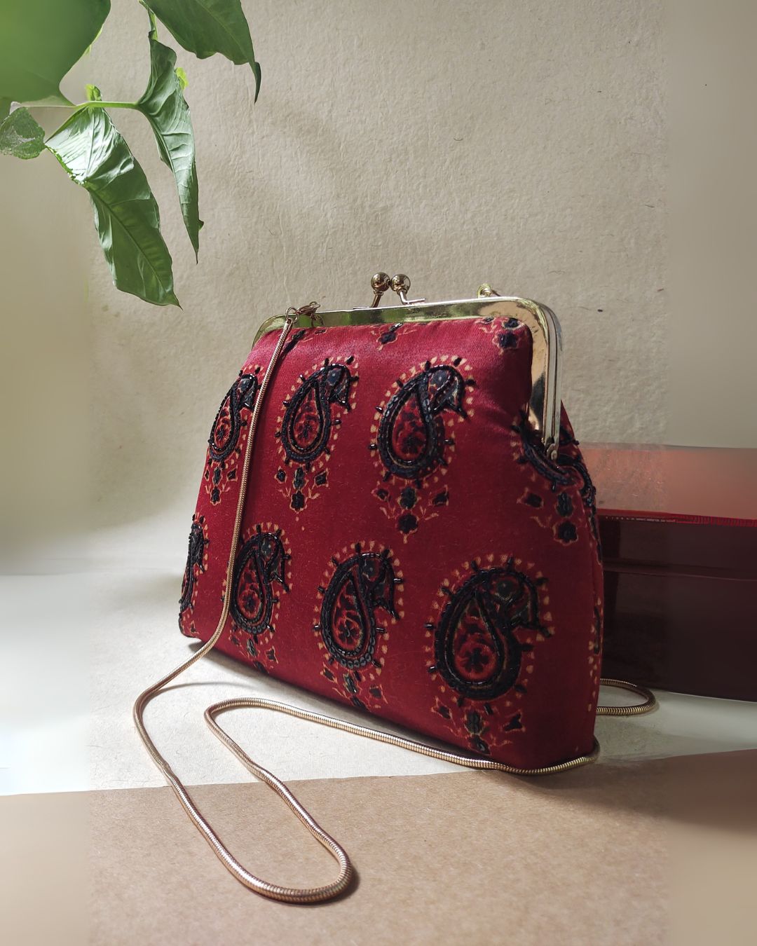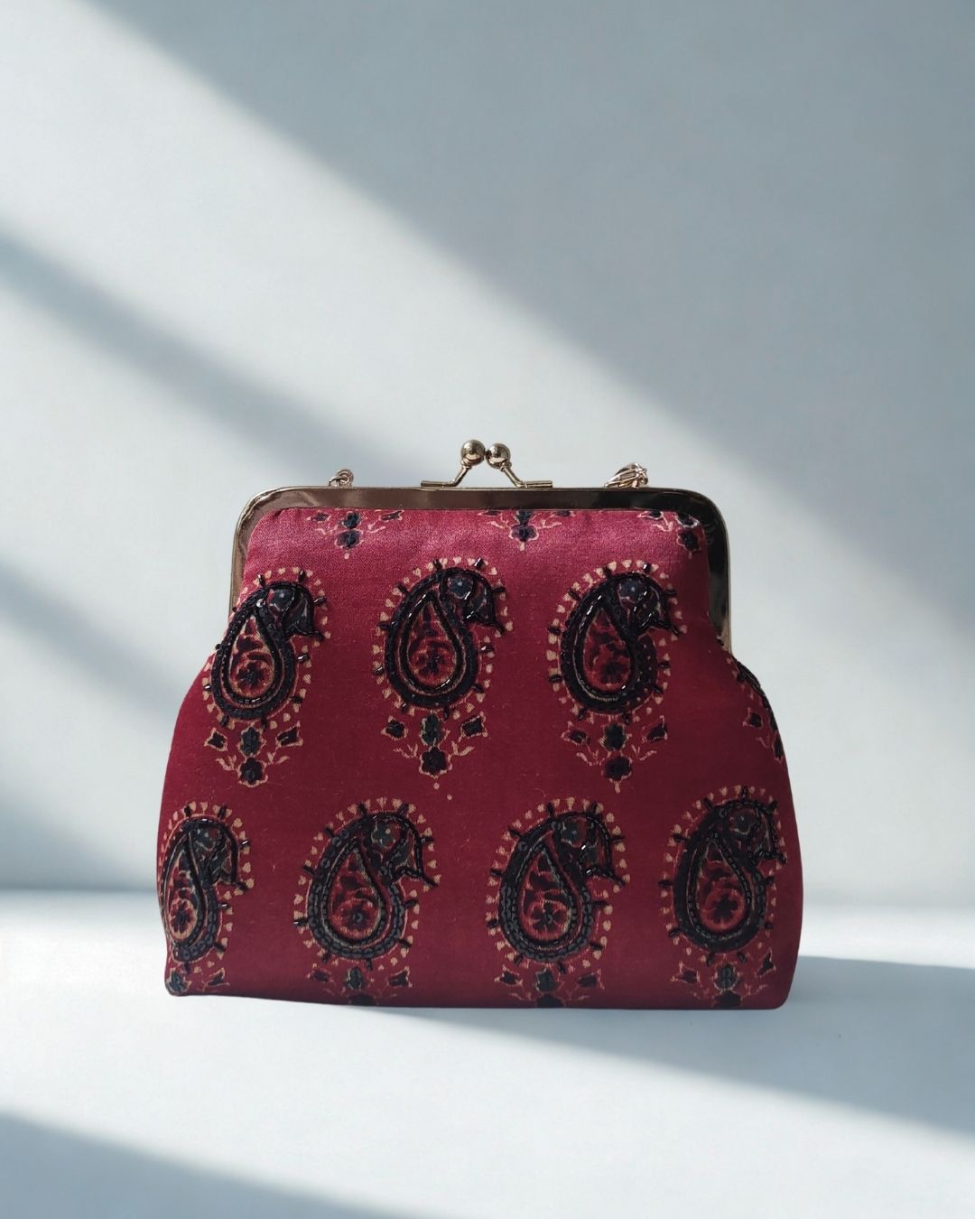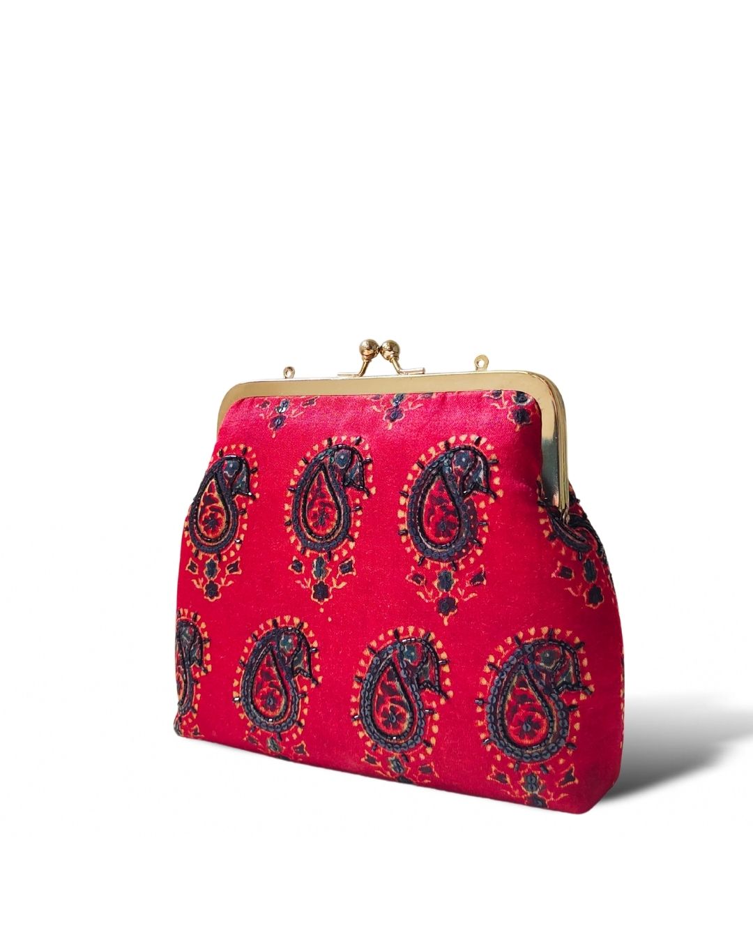 Elevate your ethnic ensemble with this handcrafted frame clutch, featuring intricate paisley motifs printed on rich red brocade. Inspired by traditional Ajrakh patterns, the clutch blends timeless artistry with functional elegance. The antique gold metal clasp adds a vintage charm, making it an ideal accessory for festive gatherings, weddings, and cultural events.