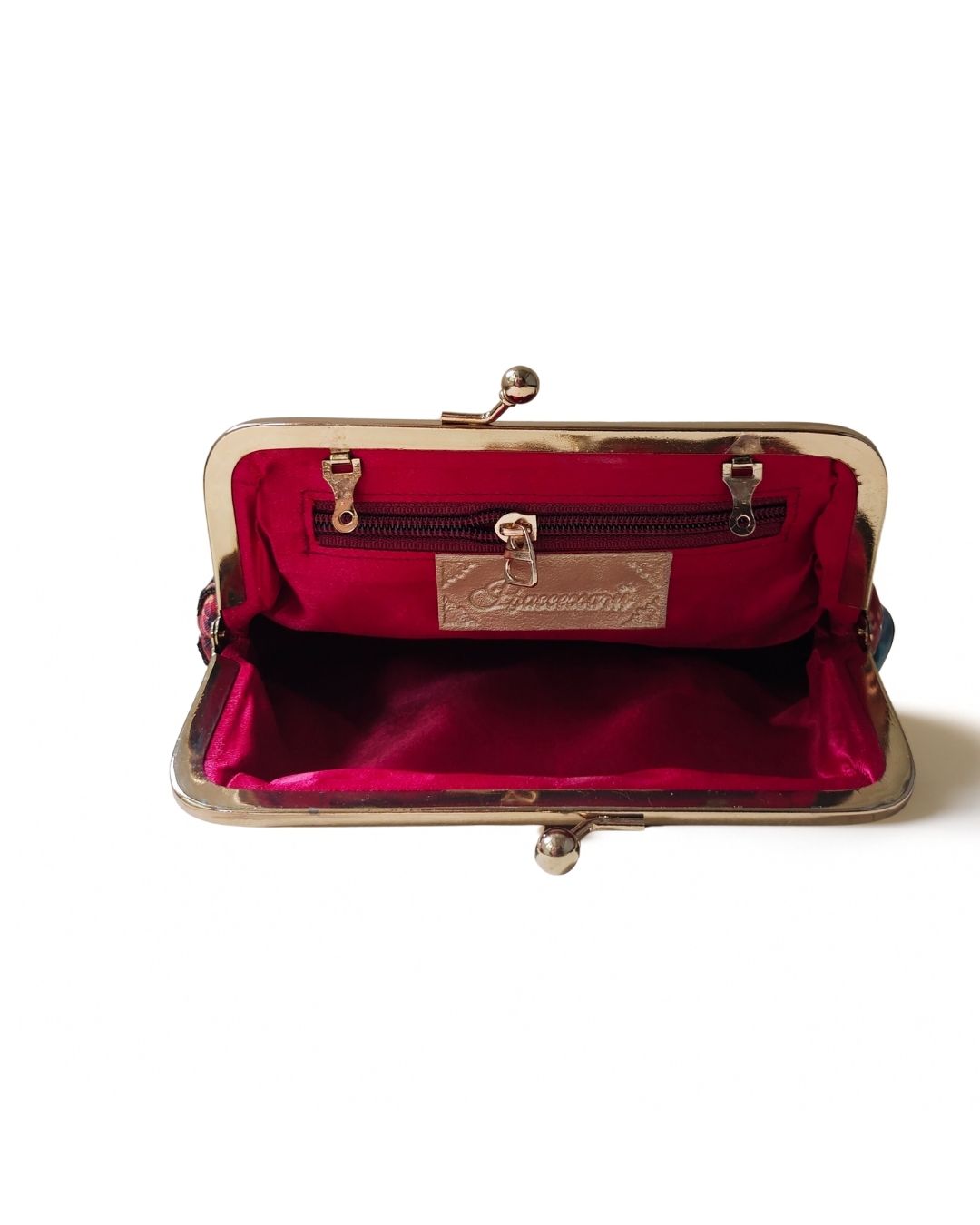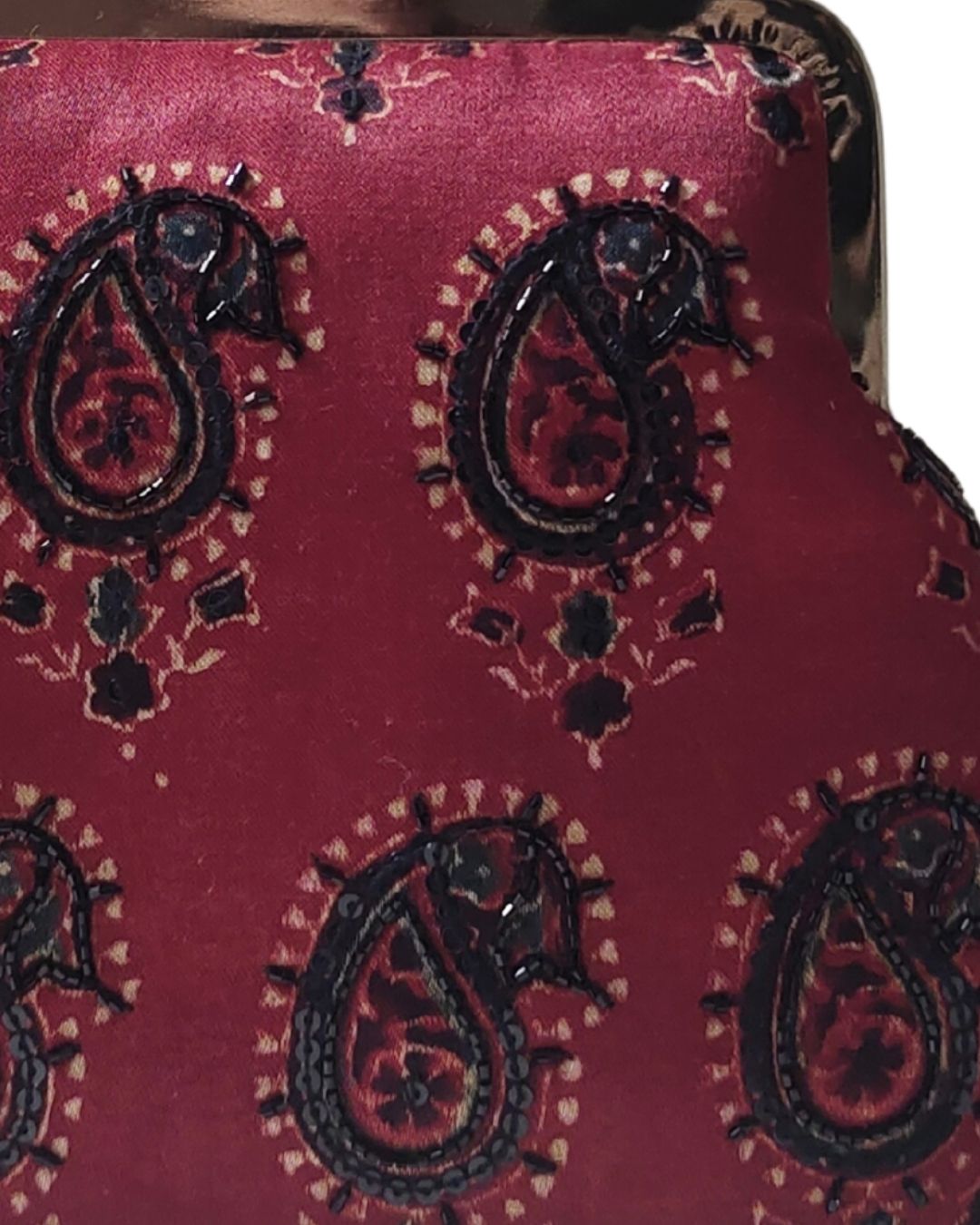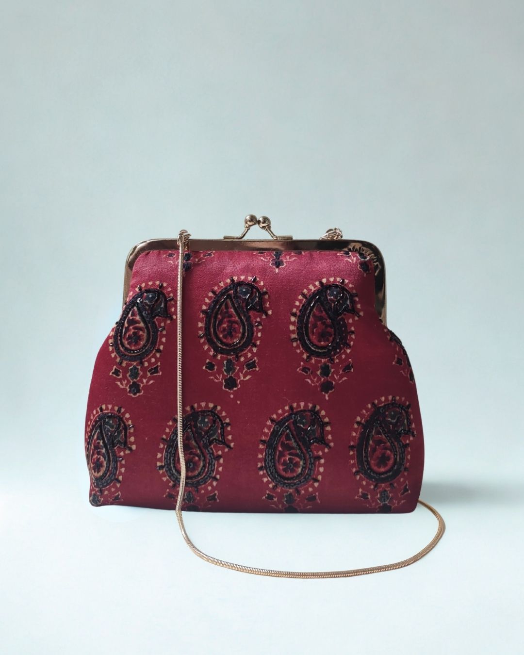 Elevate your ethnic ensemble with this handcrafted frame clutch, featuring intricate paisley motifs printed on rich red brocade. Inspired by traditional Ajrakh patterns, the clutch blends timeless artistry with functional elegance. The antique gold metal clasp adds a vintage charm, making it an ideal accessory for festive gatherings, weddings, and cultural events.