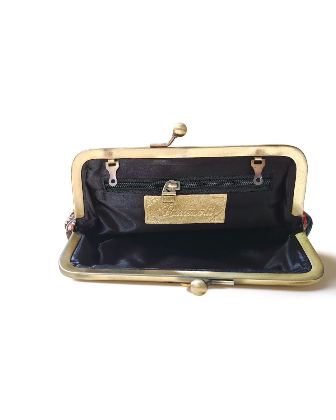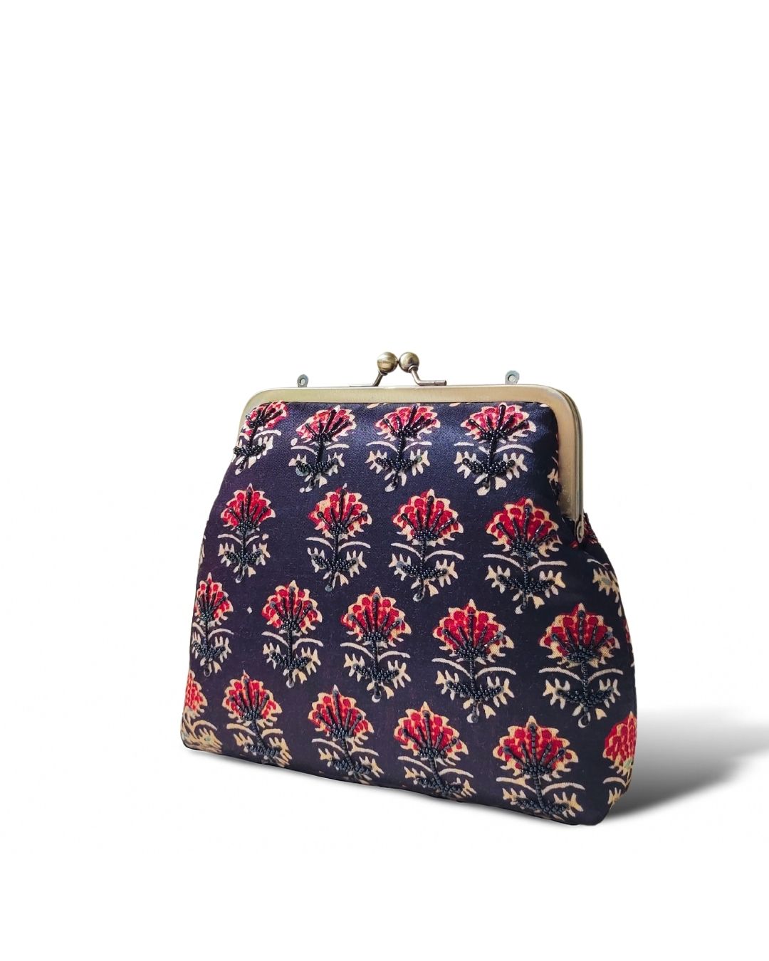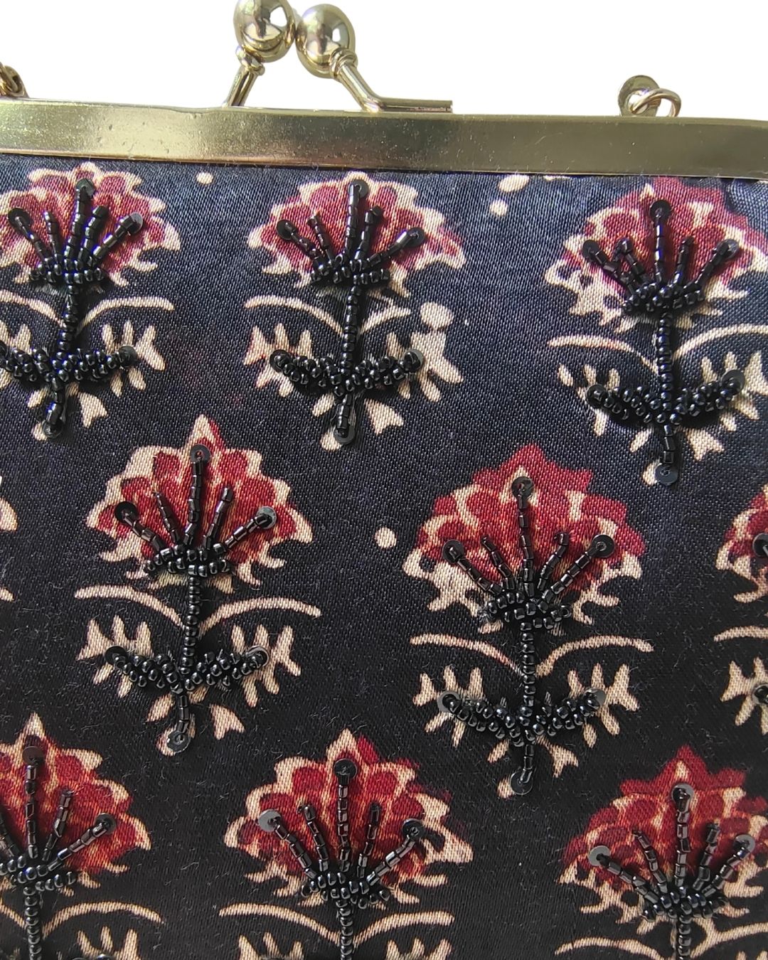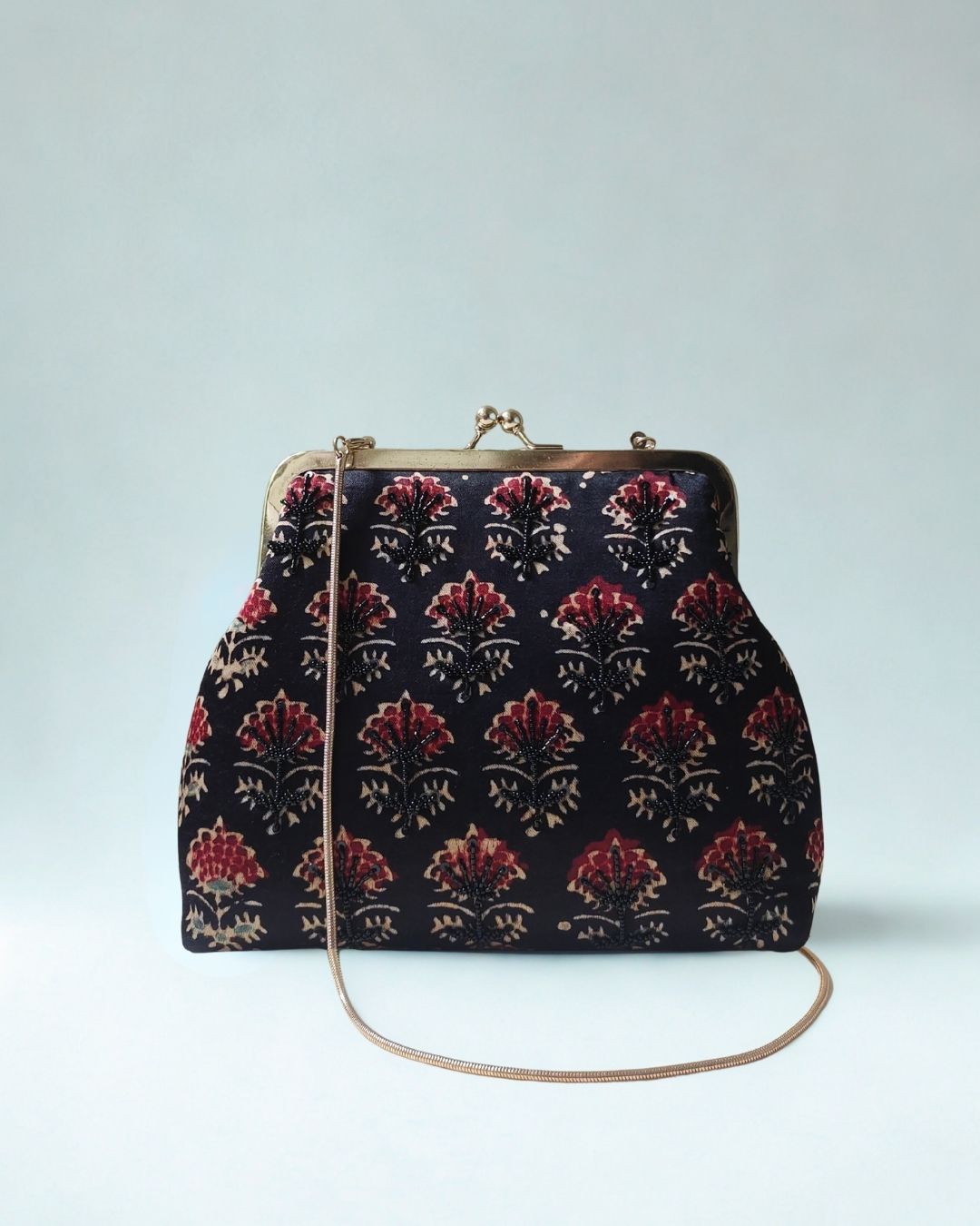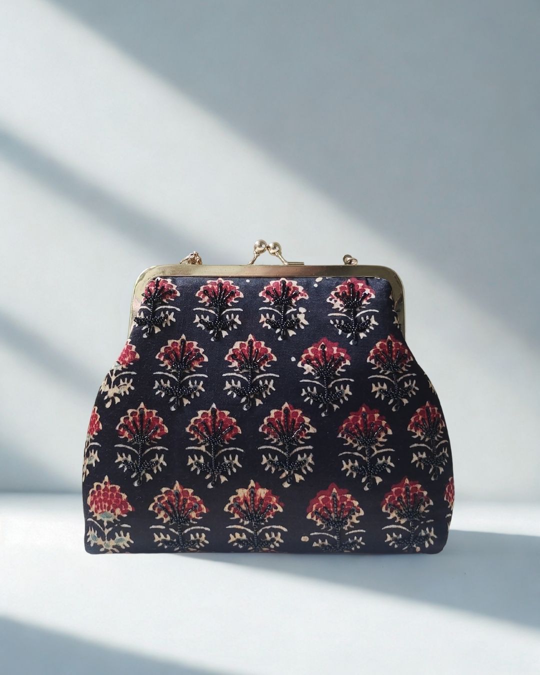 Showcase timeless tradition with this stunning handcrafted Ajrak clutch, featuring a repeating floral boota motif in rich shades of red, beige, and off-white on a deep black base. The detailed block-print-inspired design is elegantly paired with a vintage-style metallic clasp frame, making it an ideal accessory for festive occasions and traditional outfits.