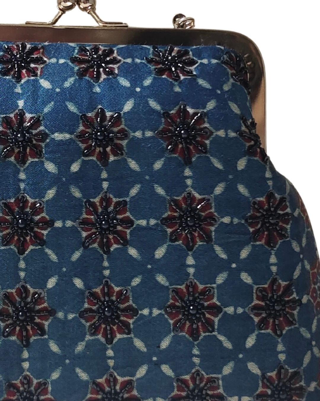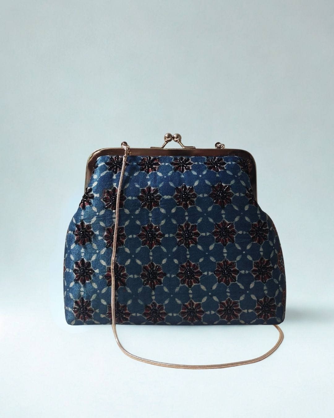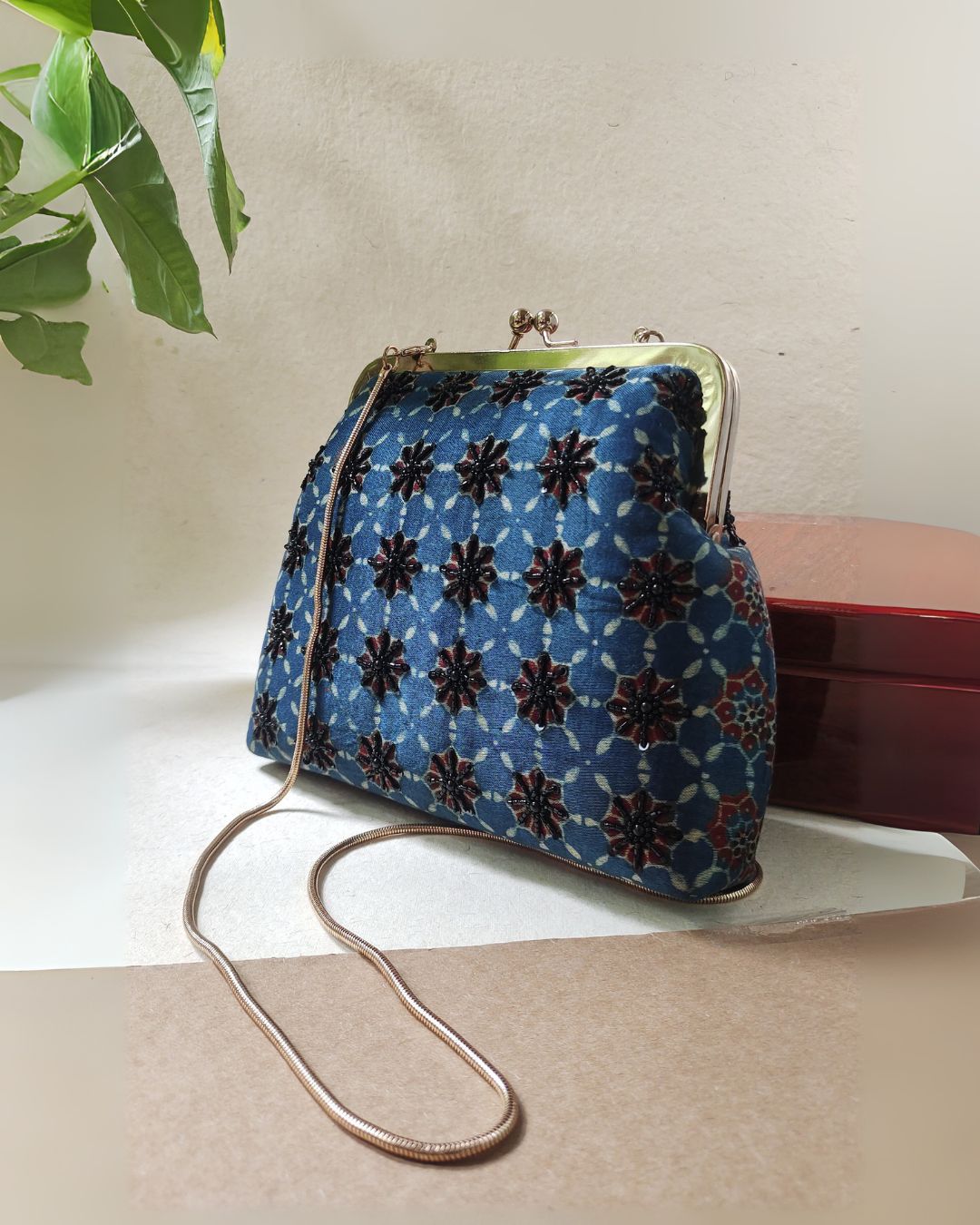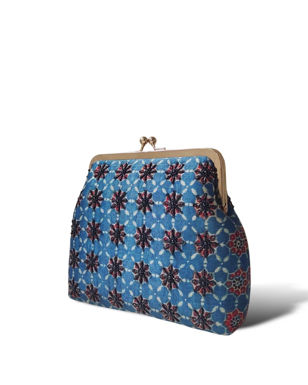 Grace your traditional look with this charming blue Ajrak brocade clutch. Featuring a symmetrical floral motif pattern in rust and white on a rich blue base, this handcrafted piece exudes subtle elegance. The soft padded body is paired with a gold-toned metal clasp frame, making it both stylish and functional for festive events or ethnic gatherings.