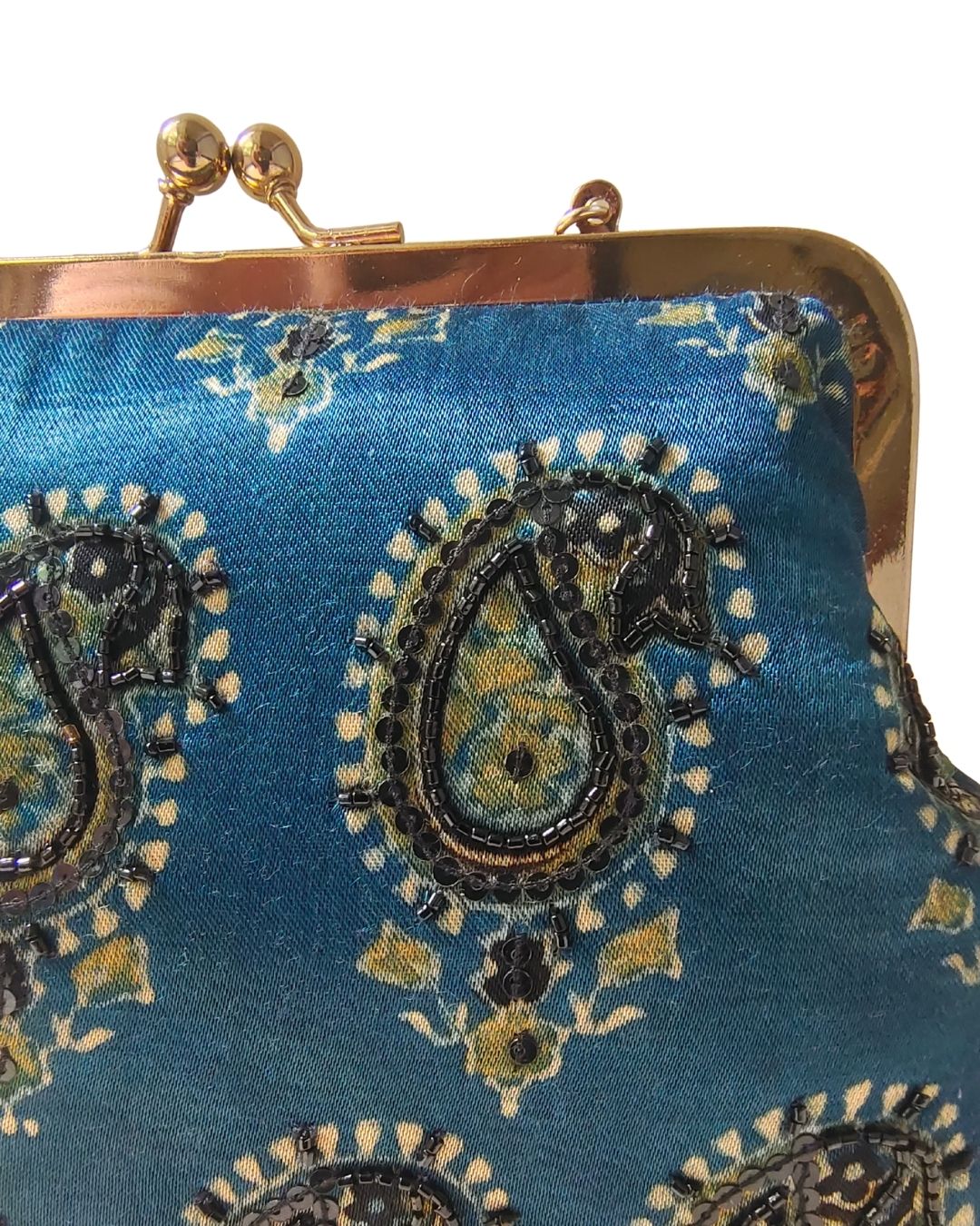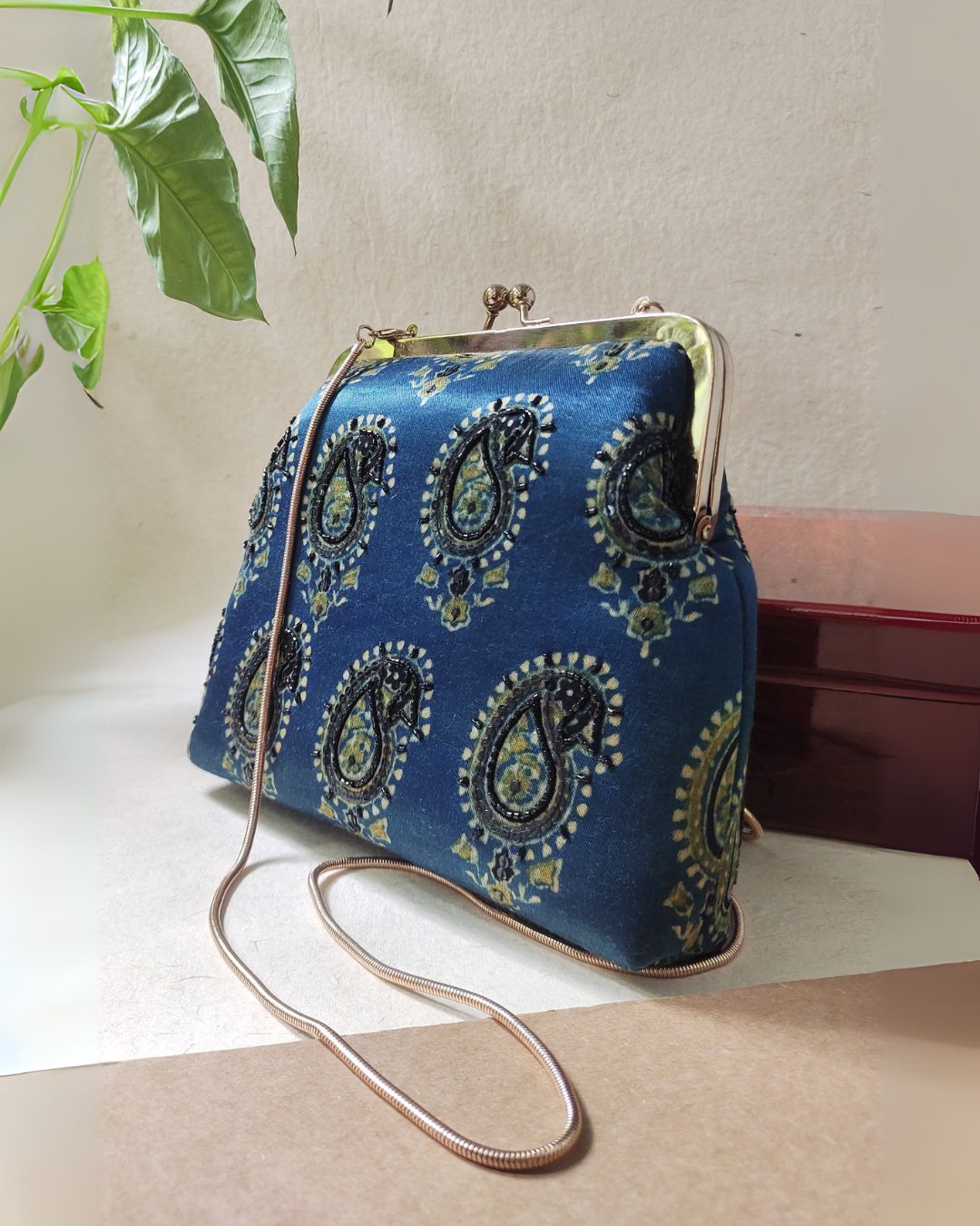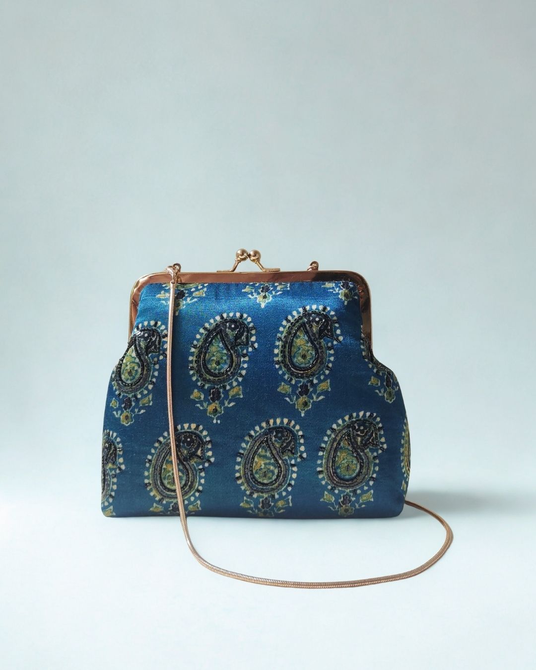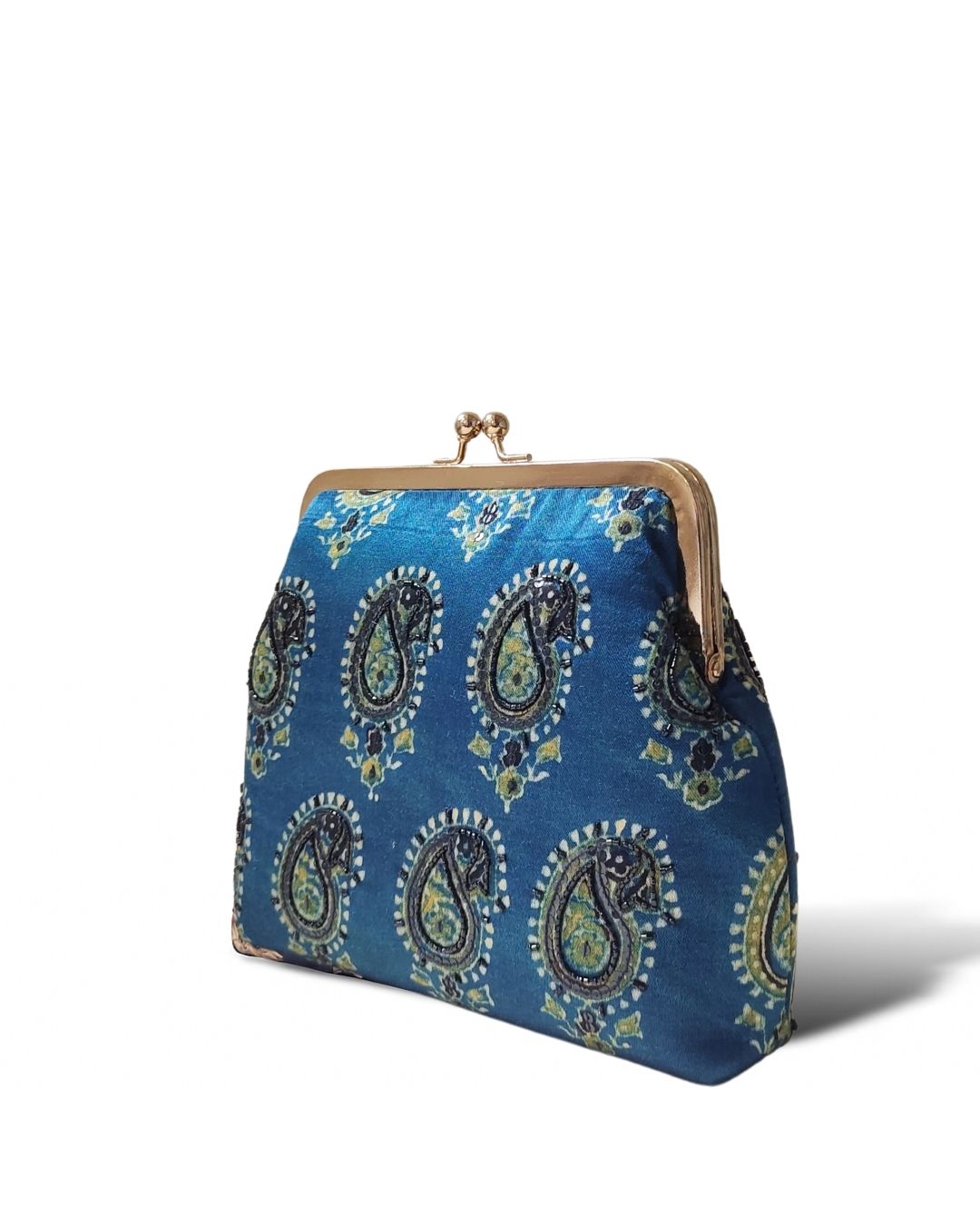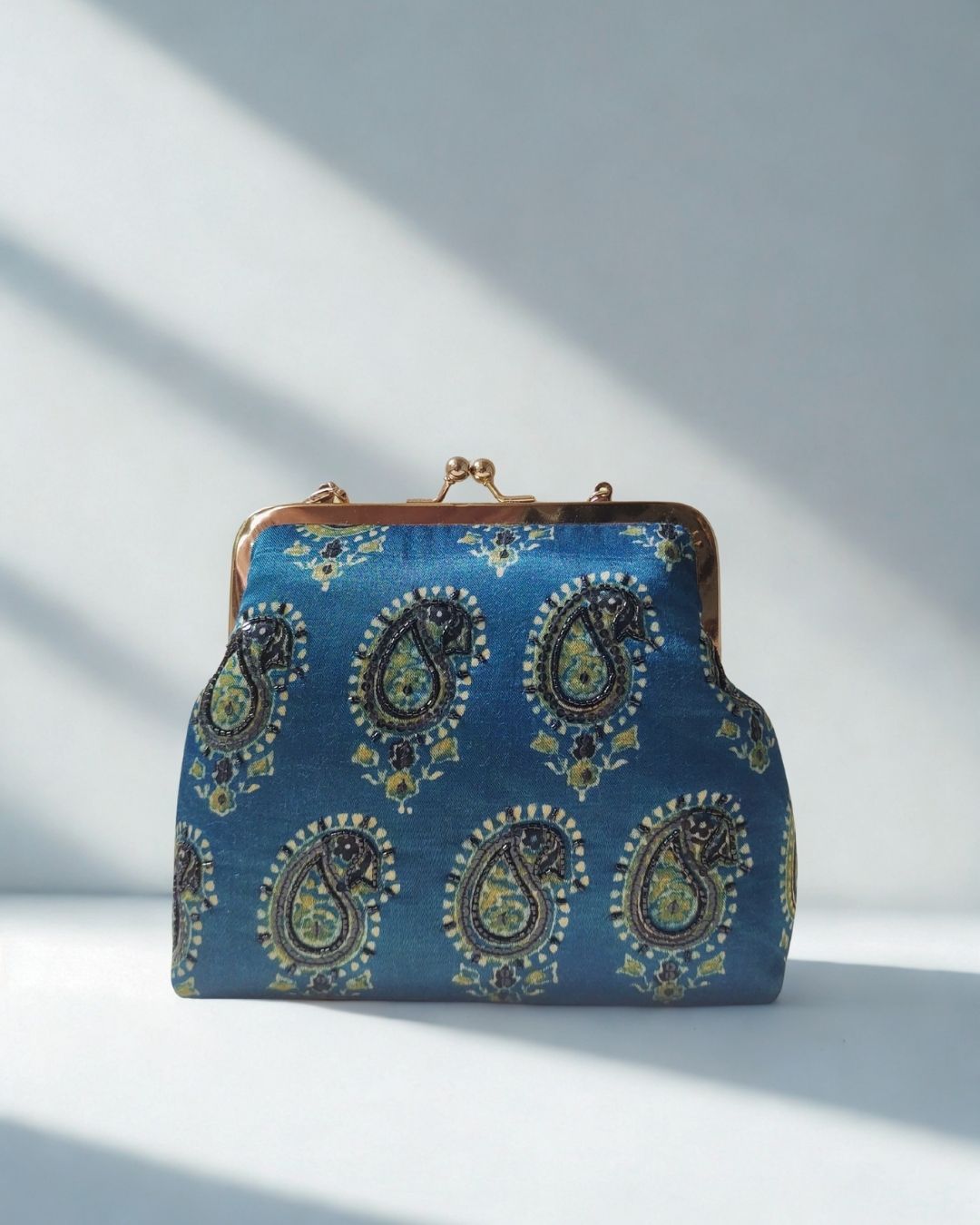 This handcrafted teal Ajrak clutch features a repeating paisley motif in elegant tones of lime green, black, and cream—highlighting a perfect blend of tradition and style. The intricate design stands out beautifully against the rich teal base. Finished with a metallic gold clasp frame, this clutch adds a graceful touch to any ethnic ensemble.
