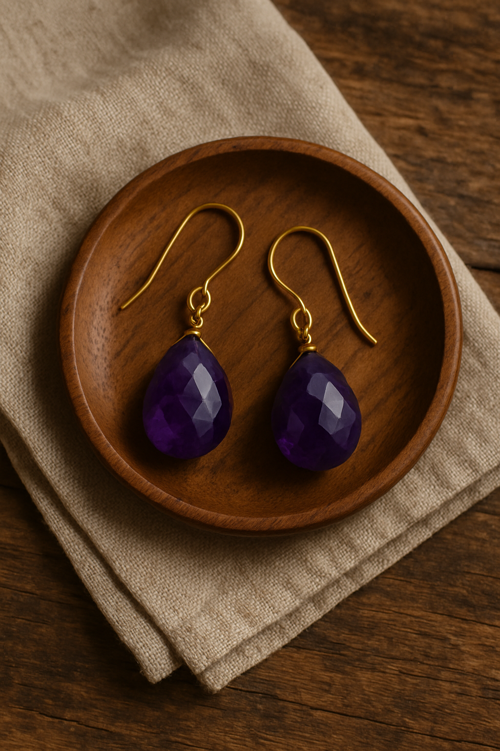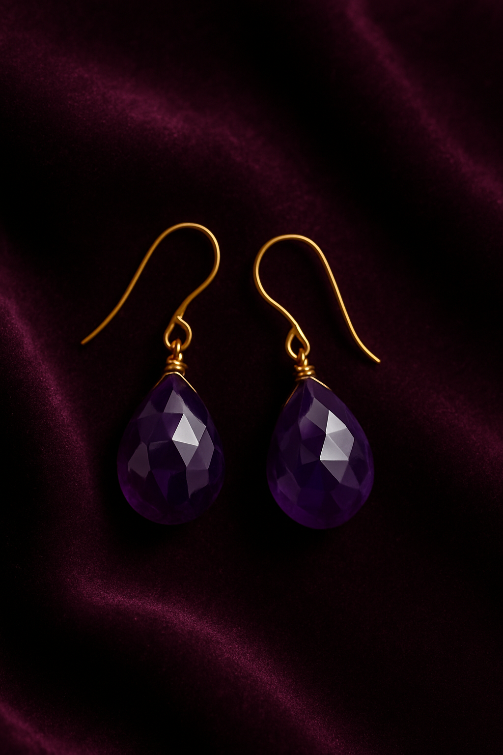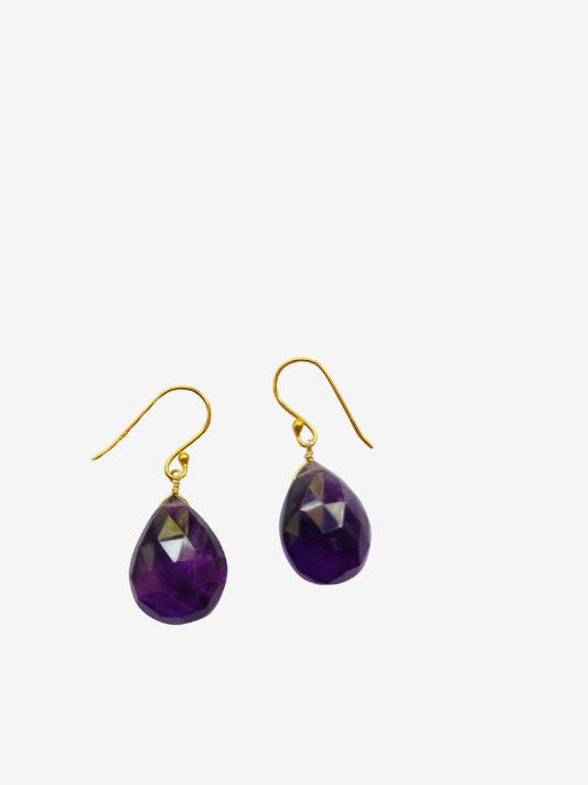 Add a touch of regal elegance to your jewelry collection with these stunning faceted amethyst drop earrings. Each earring features a teardrop-shaped amethyst, hand-cut to highlight its natural brilliance and rich purple hue. Set on silver gold-plated hooks, the design is both timeless and lightweight—perfect for effortless day-to-evening wear. A beautiful choice for gifting or adding a refined pop of colour to your ensemble.