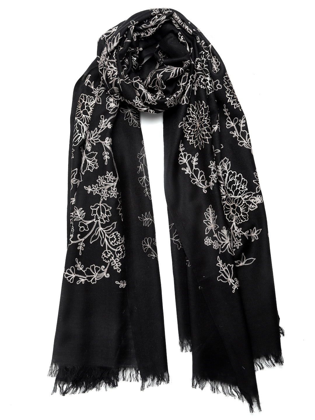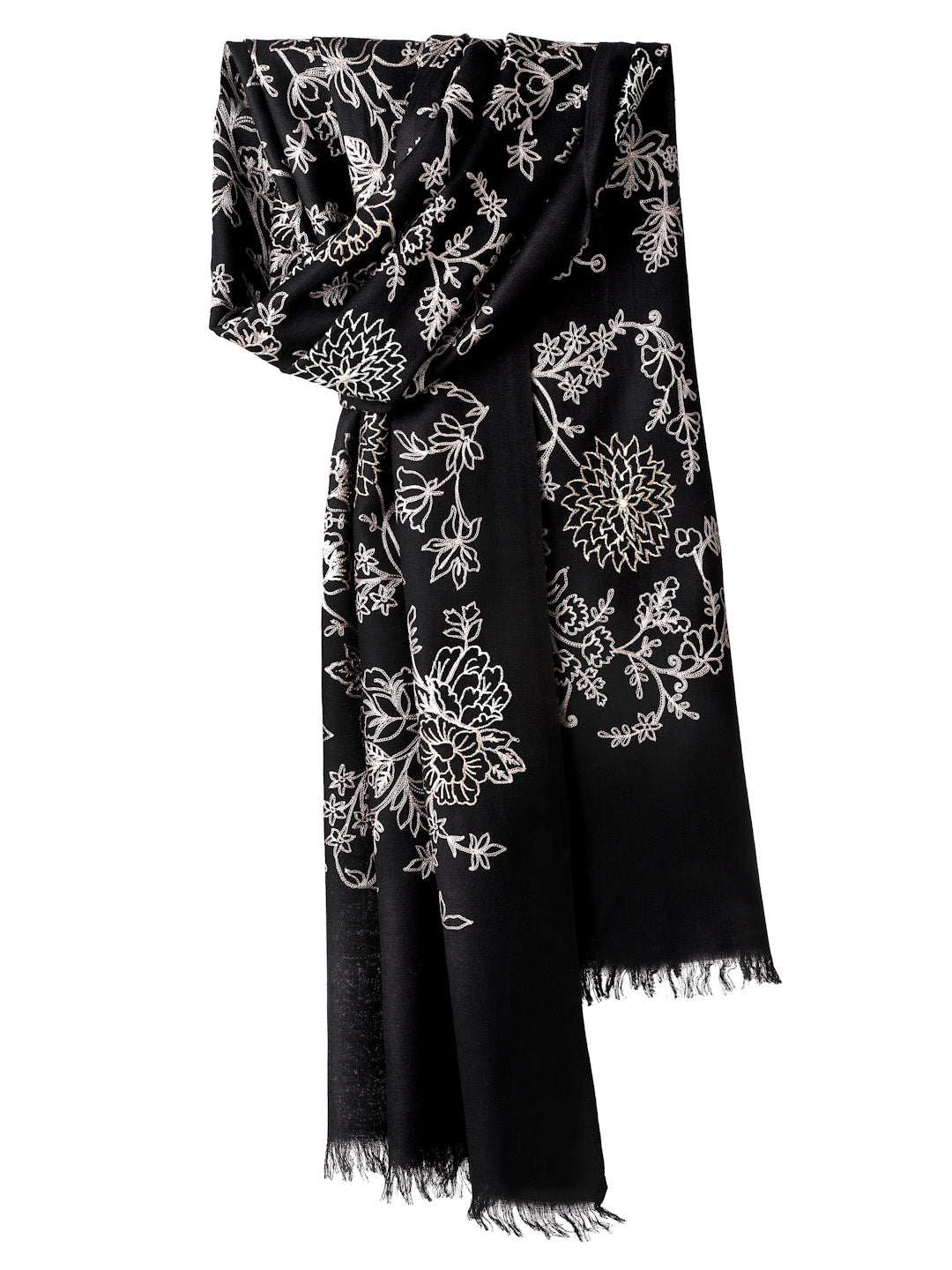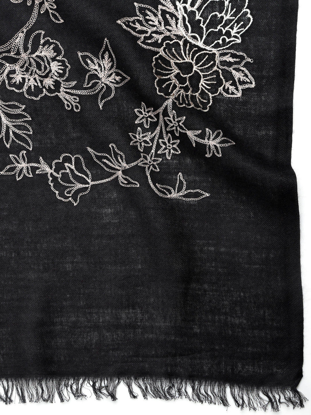 Fine wool stole in a soft, elegant shade. The fabric is lightweight yet warm, with a gentle drape that feels smooth against the skin.Fine embroidery all over with cream, silver and gold threads. This stole is a perfect accessory for adding a touch of sophistication to any outfit.