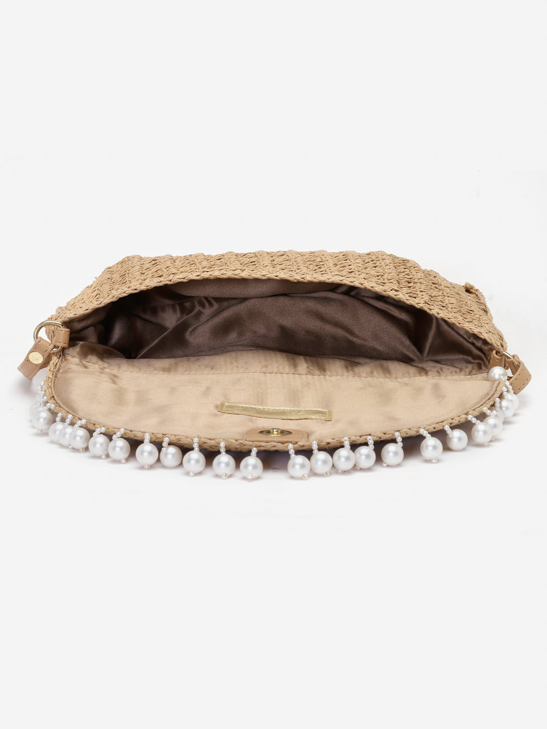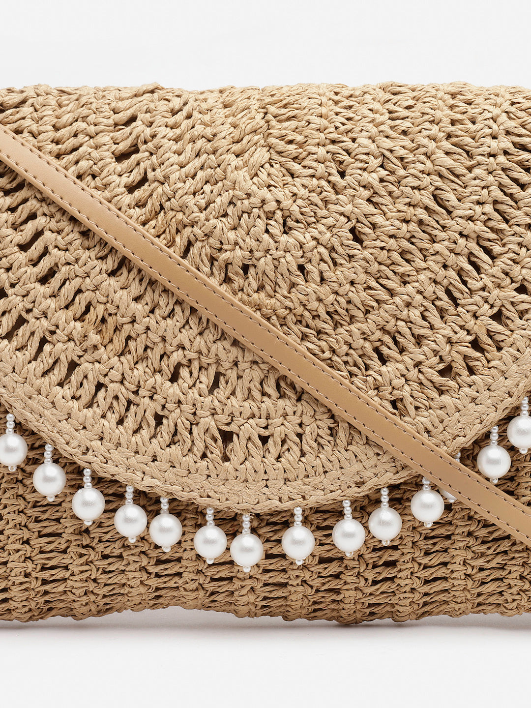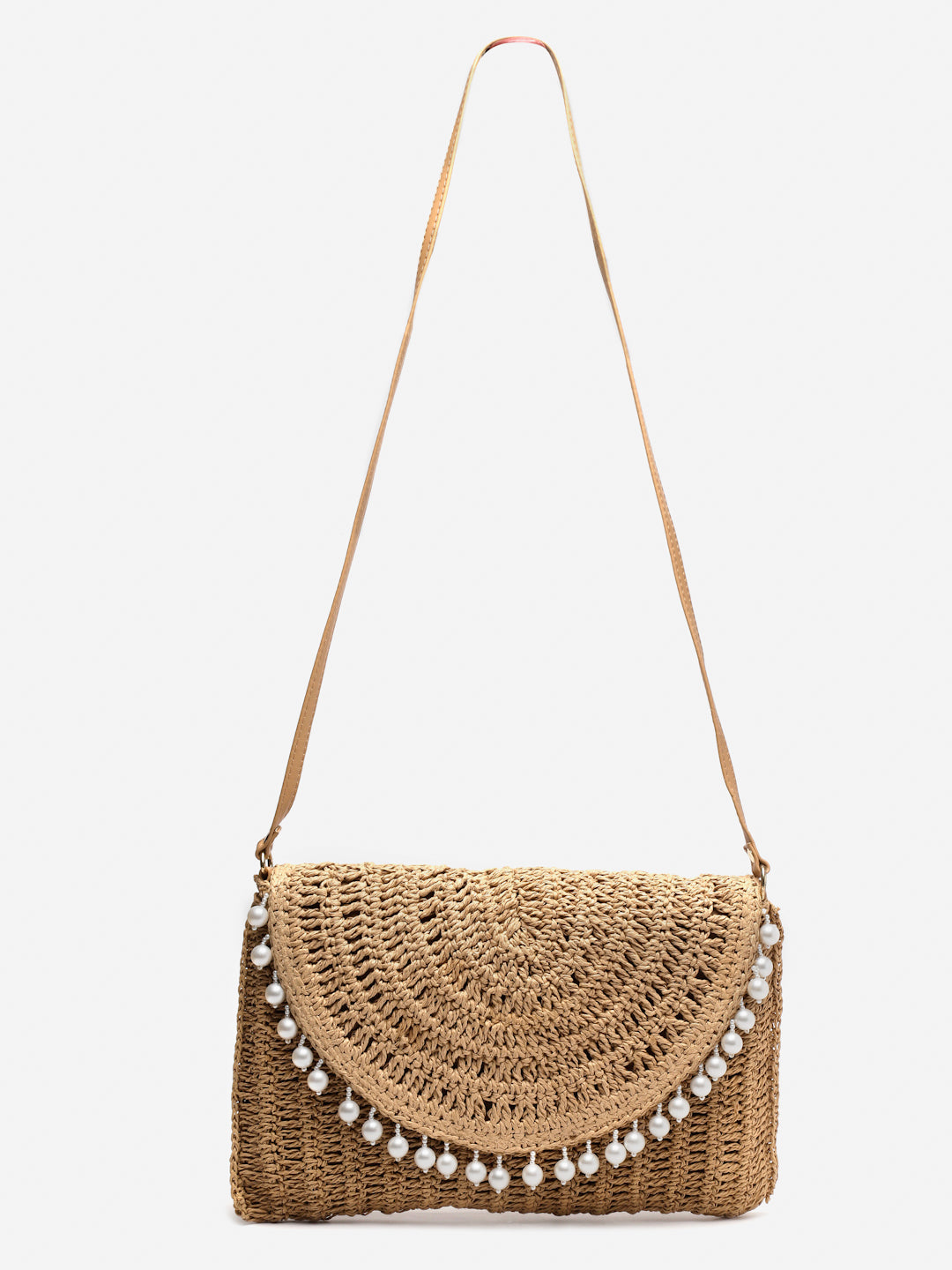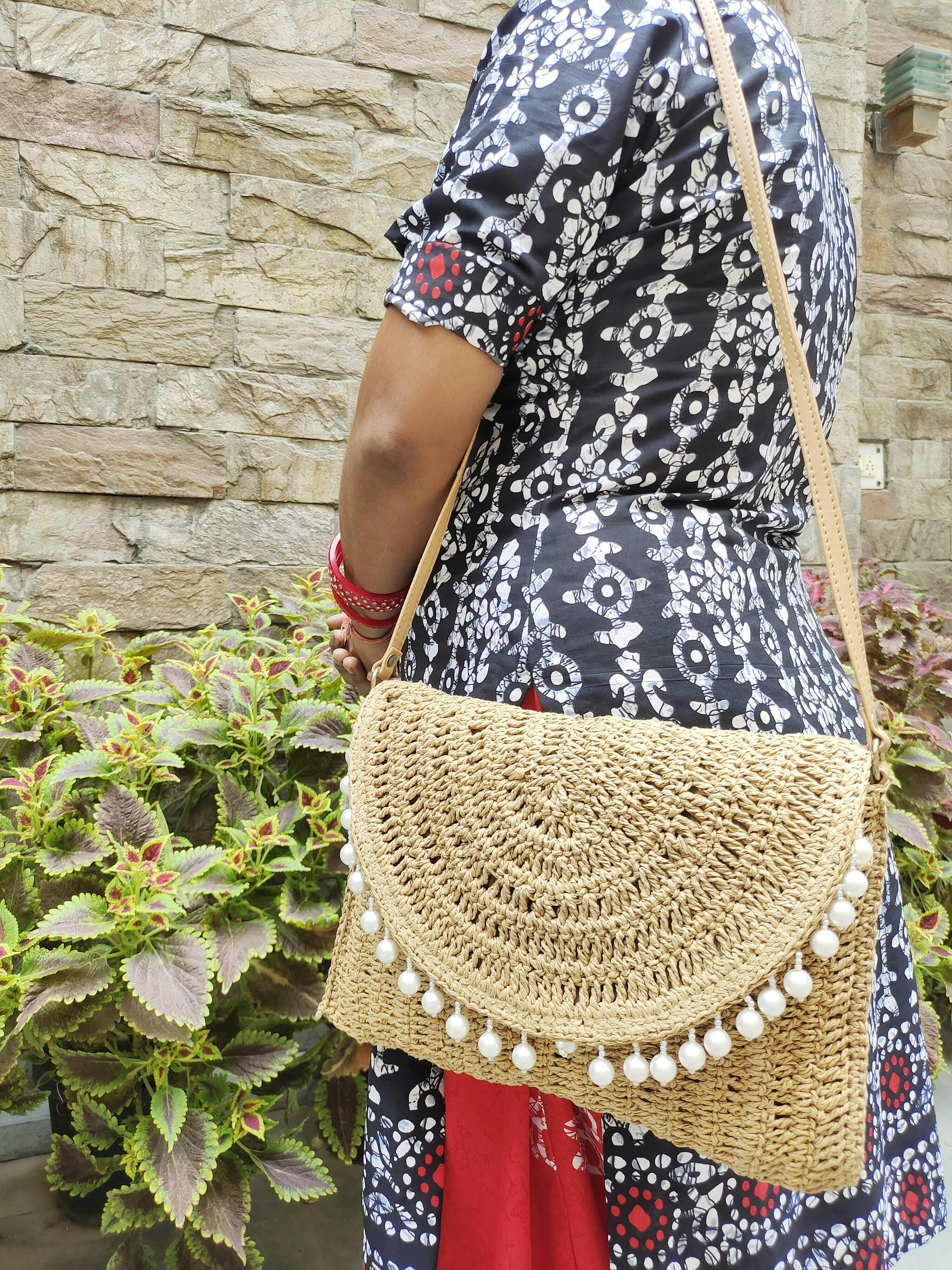 Natural raffia woven bag with pearl detailing. Magnetic closure. PU leather handle, crossbody