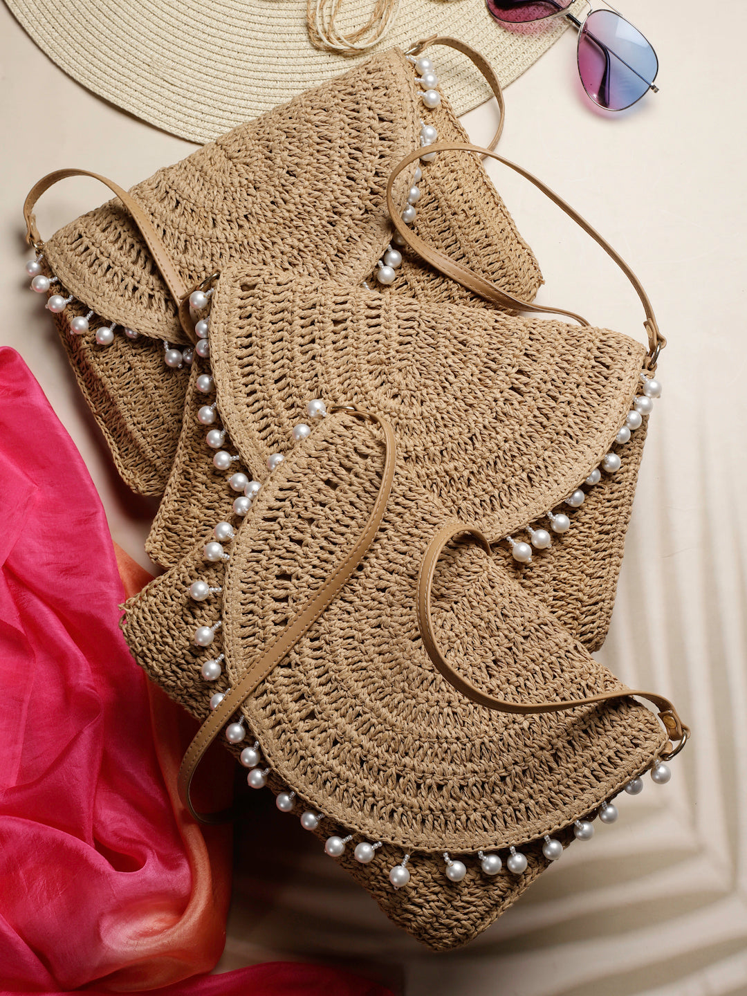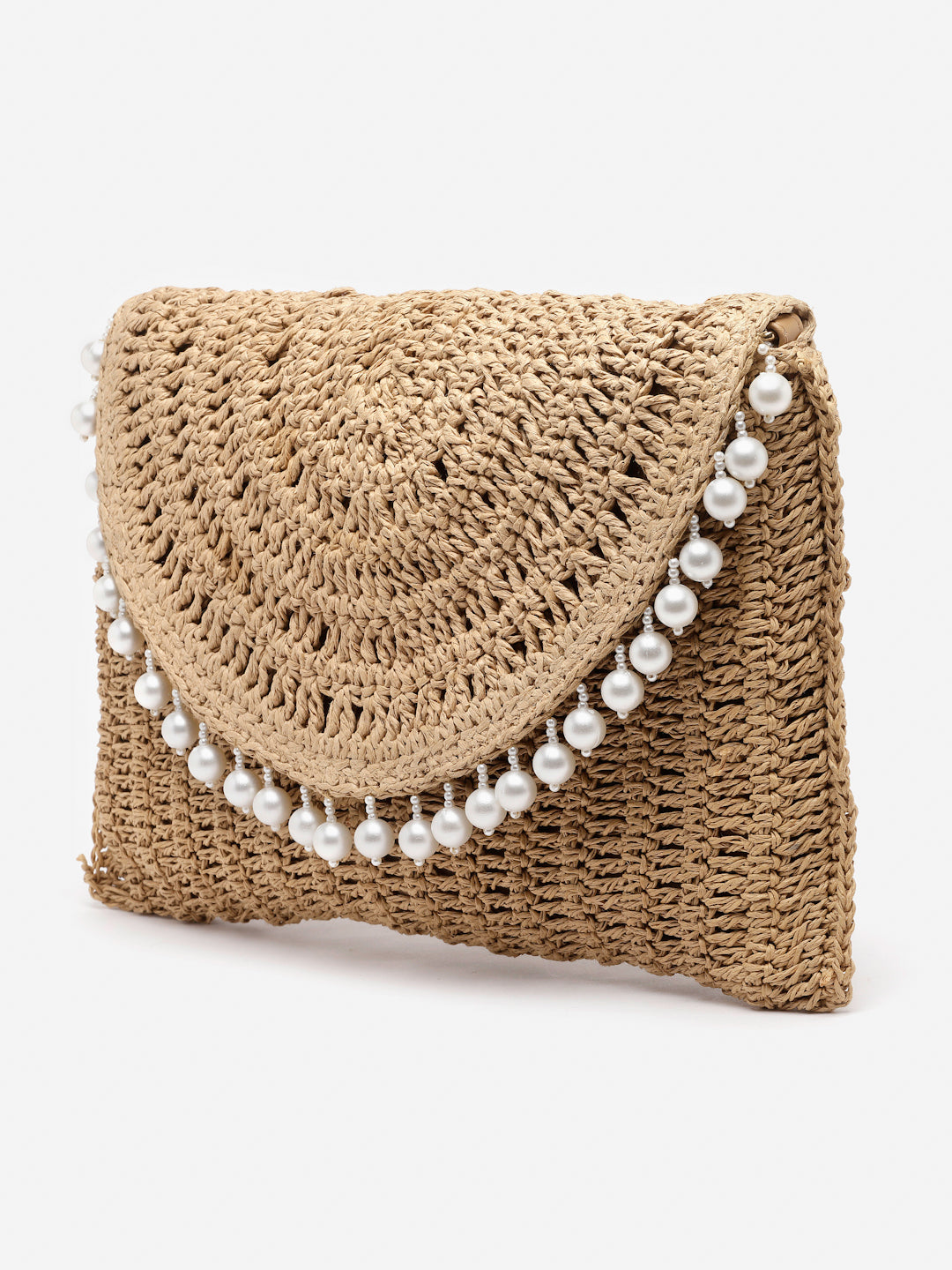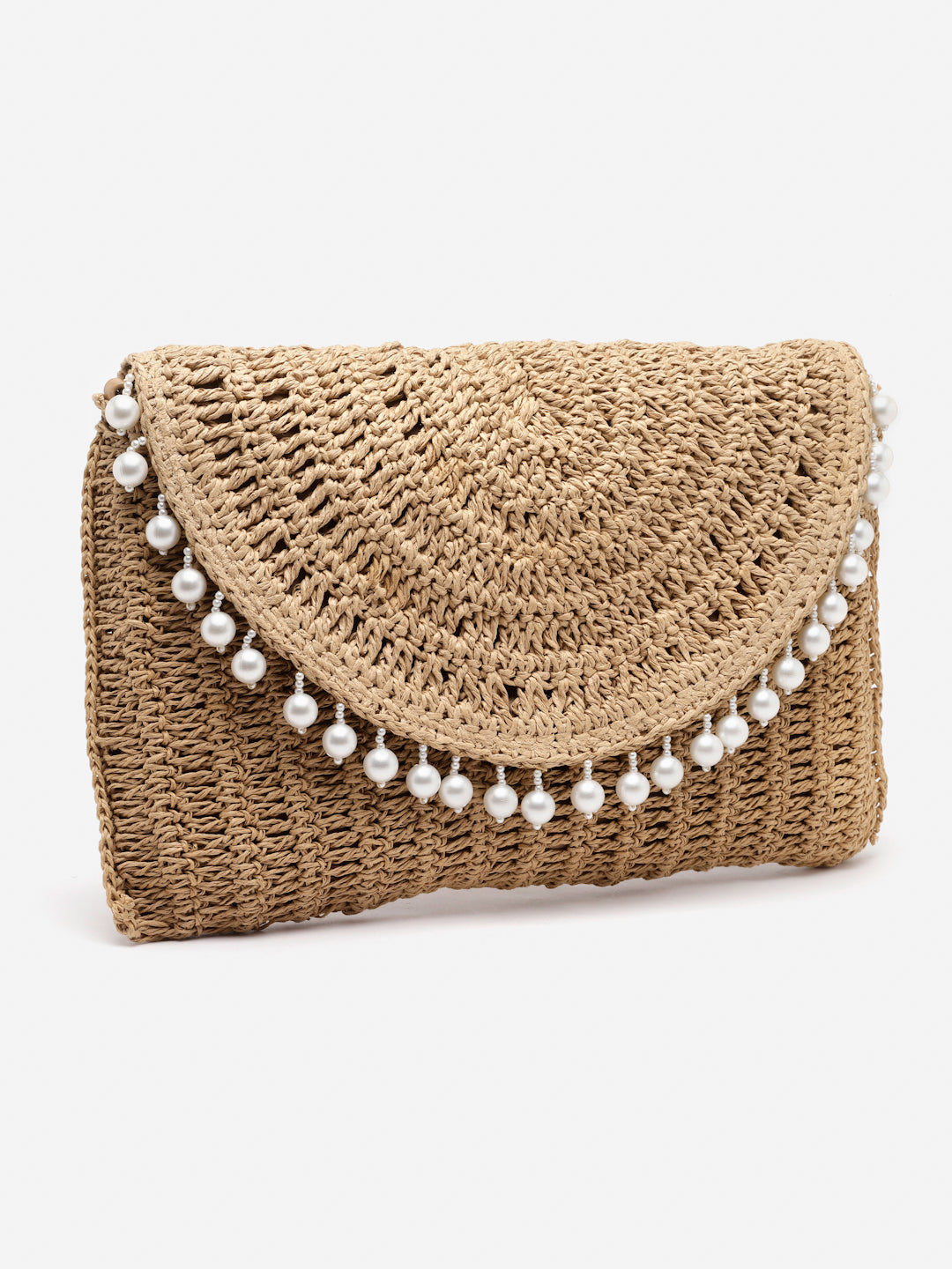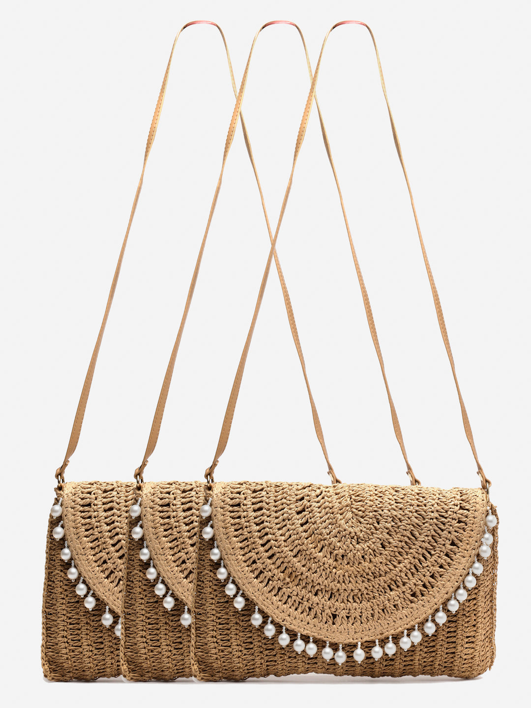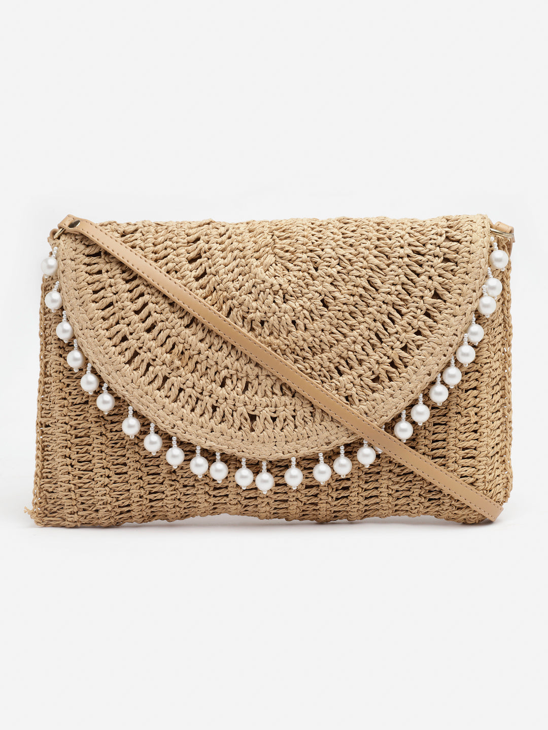 Natural raffia woven bag with pearl detailing. Magnetic closure. PU leather handle, crossbody