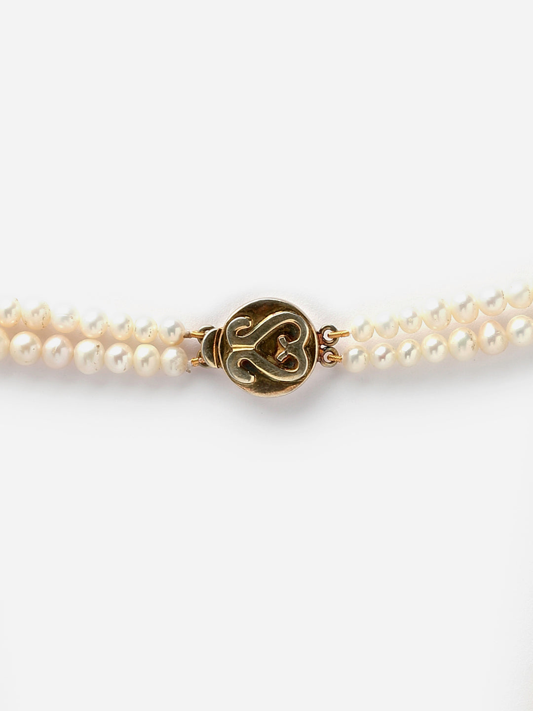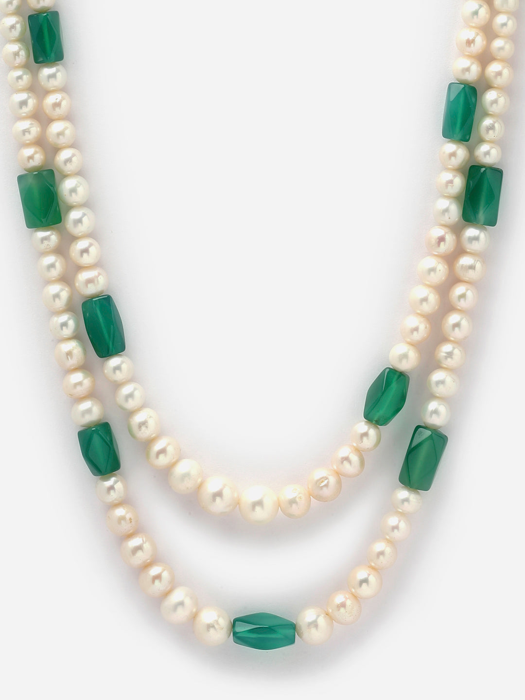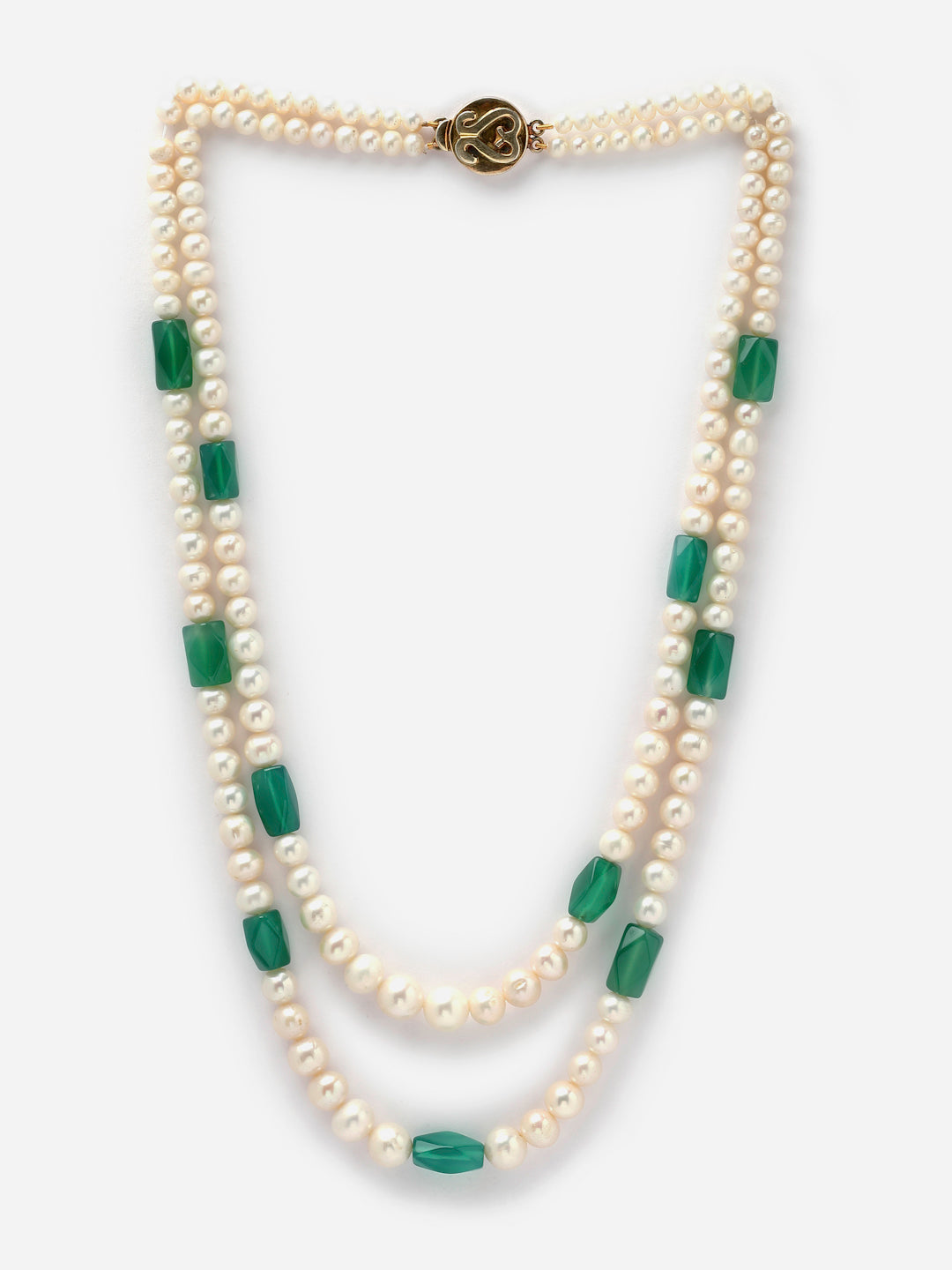 Double stranded natural pearls accentuated with facetted green onyx.Gold plated sterling silver clasp.