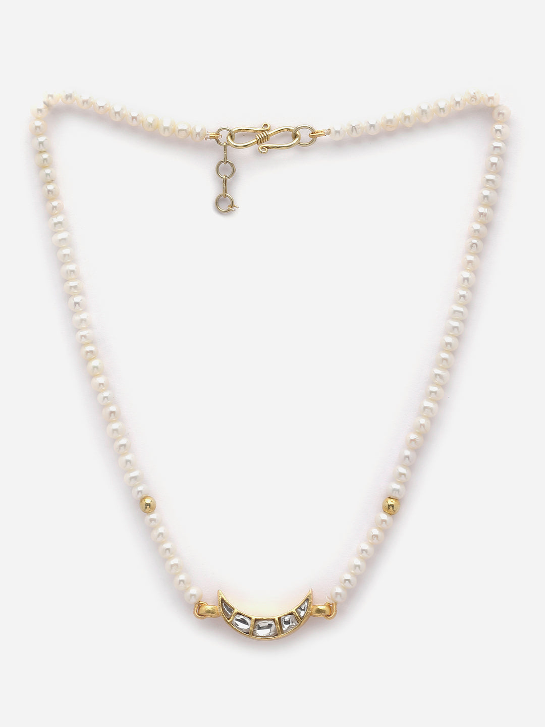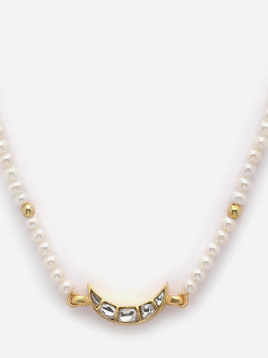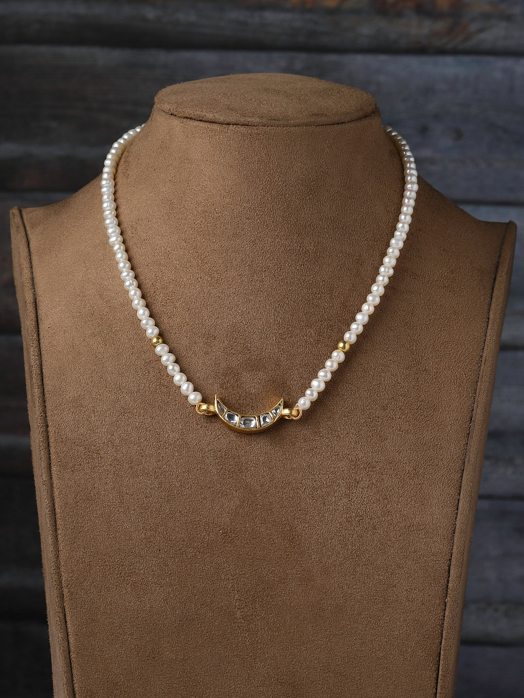 Cresent shaped white kundan embedded silver pendant on a pearl string.S hook closure.