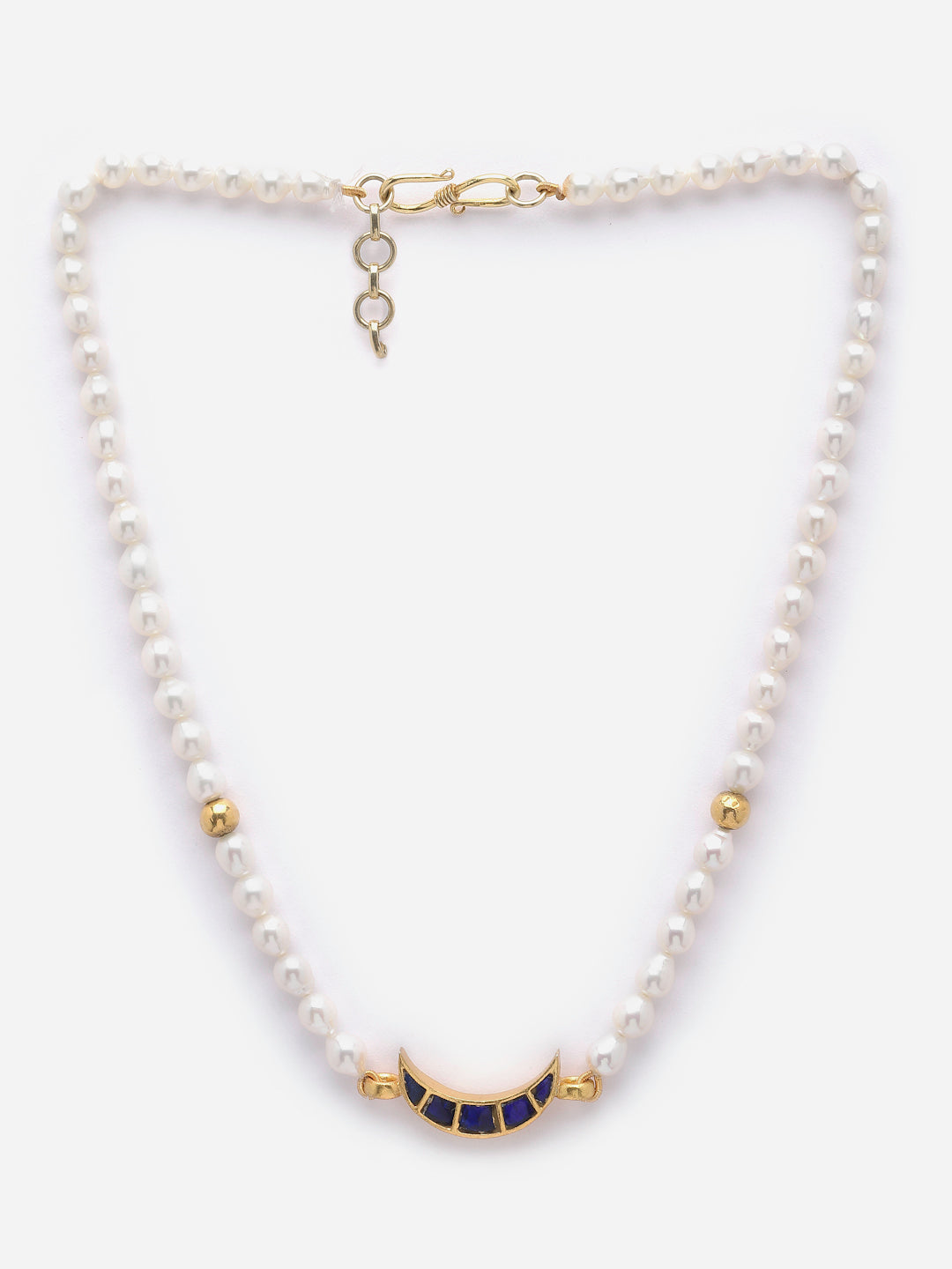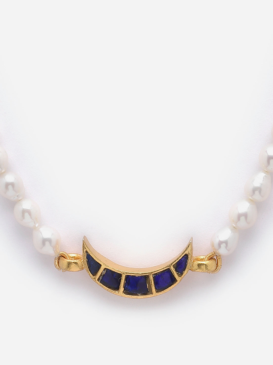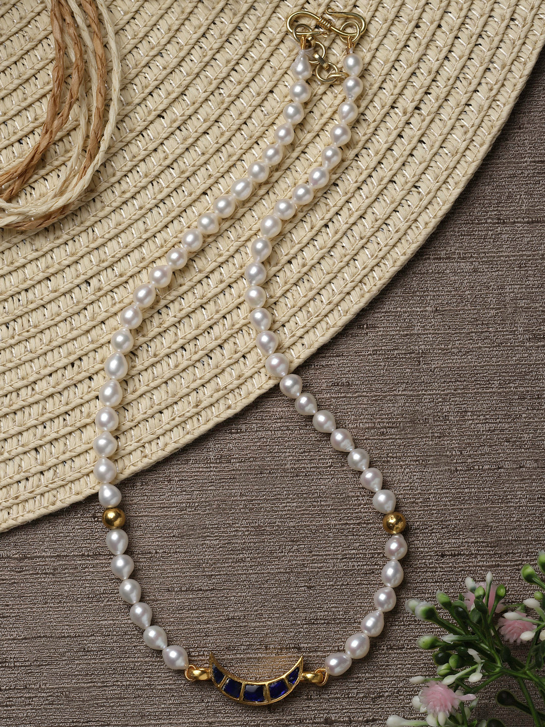 Single string natural pearl with crescent-shaped pendant studded with blue stone. Gold-plated silver S hook closure.