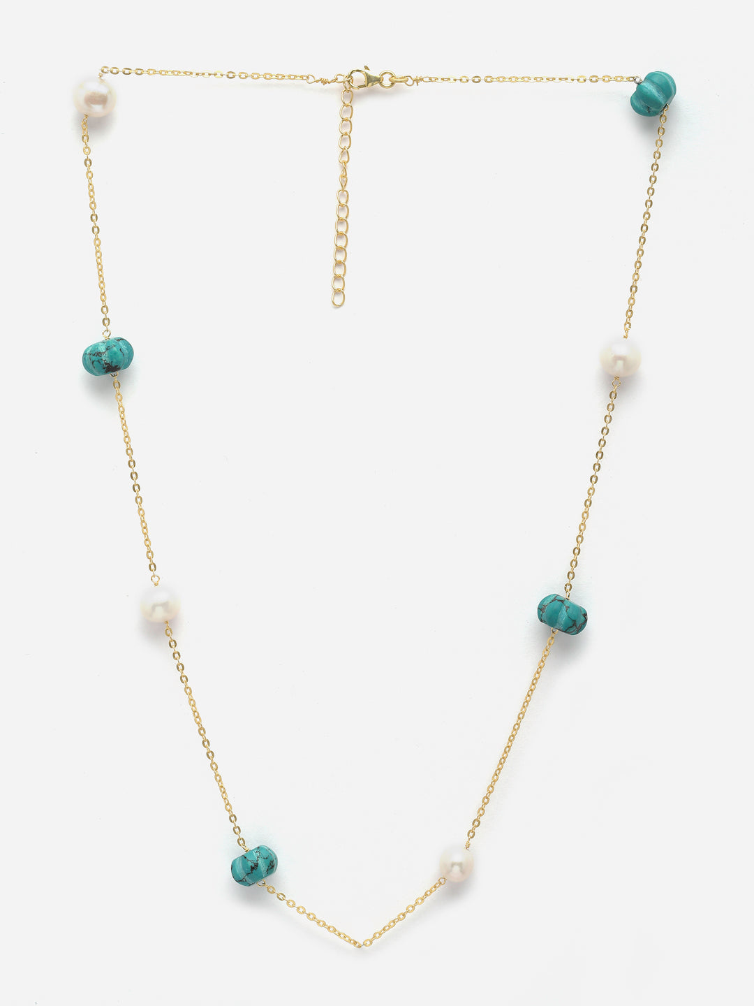 Reconstituted turquoise melon balls and natural pearls on a gold-plated silver chain, Silver lobster closure.