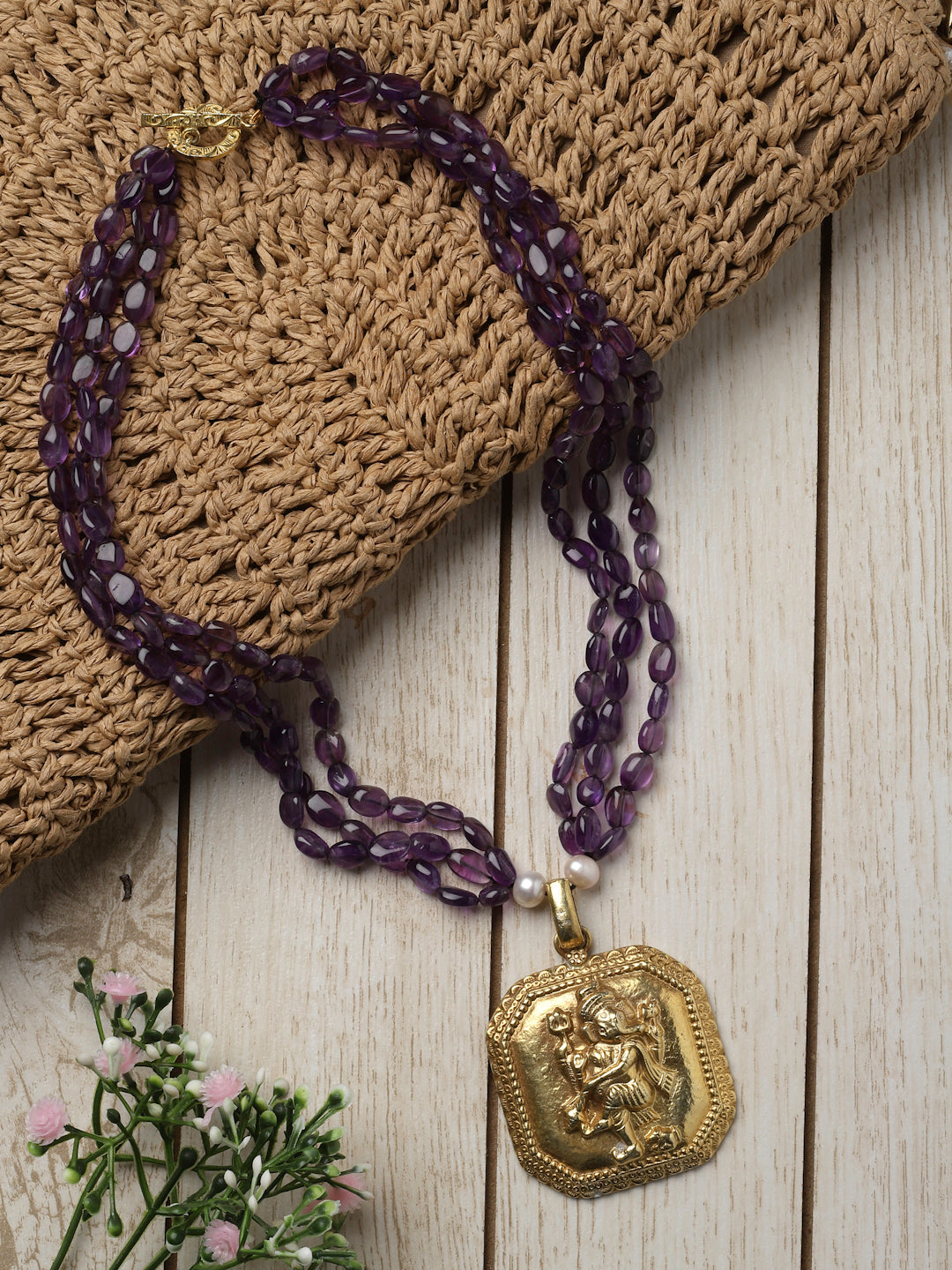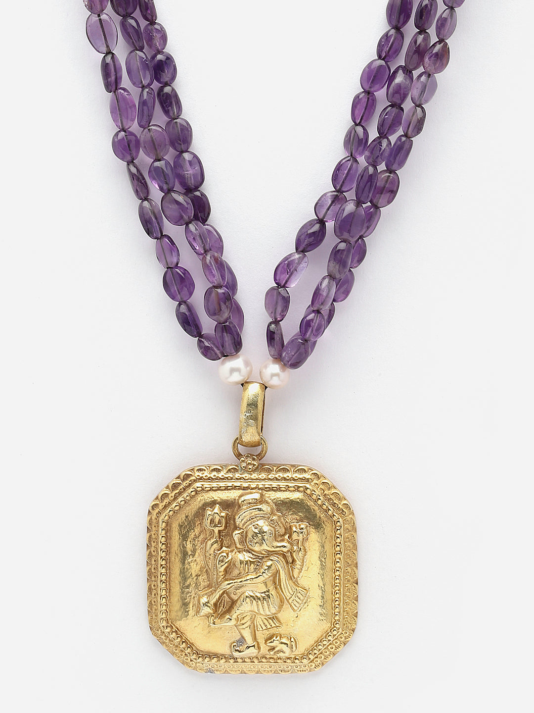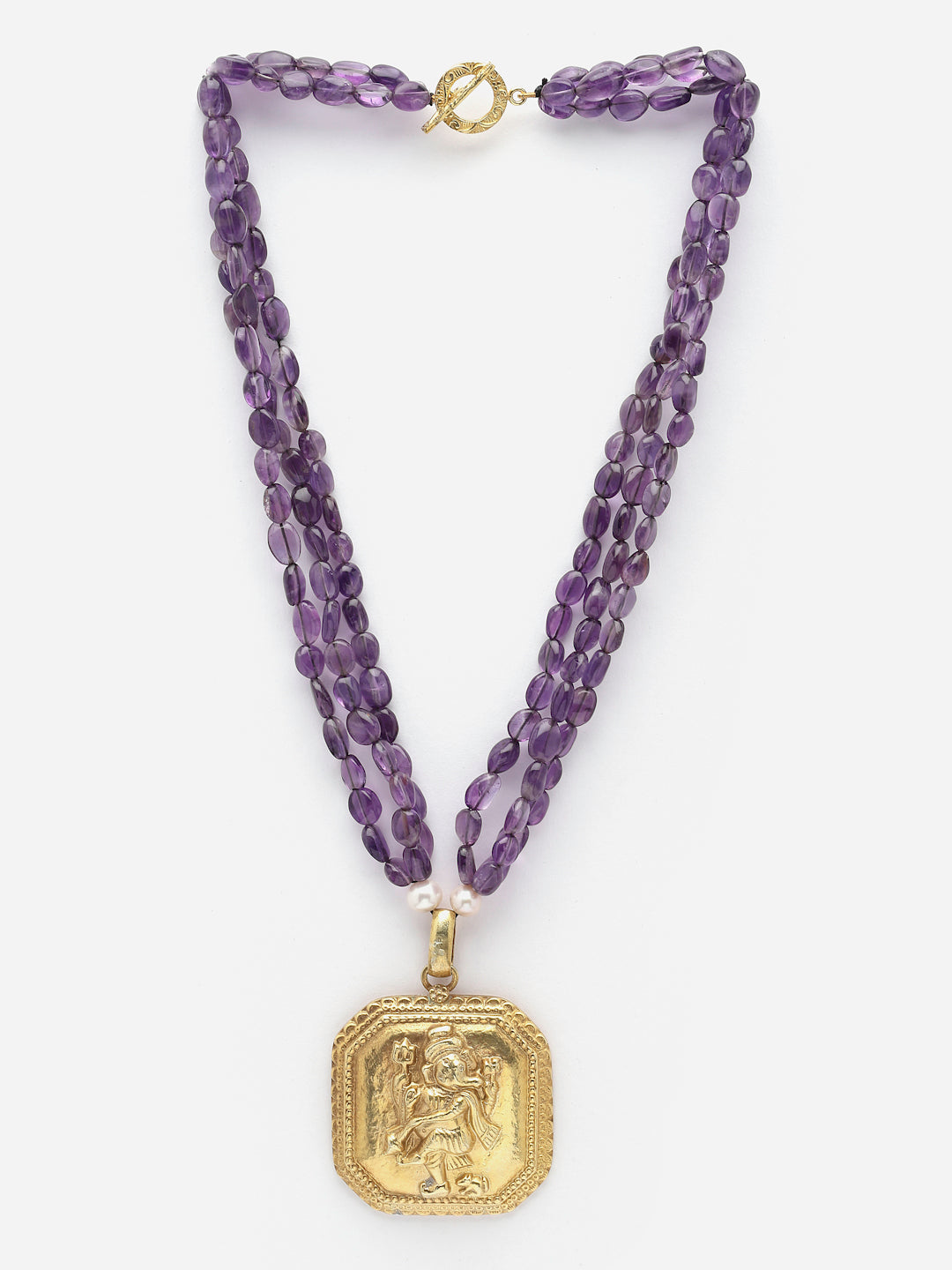 Triple-line amethyst cabochon strings with a gold-plated silver Ganesha pendant.Silver toggle closure.