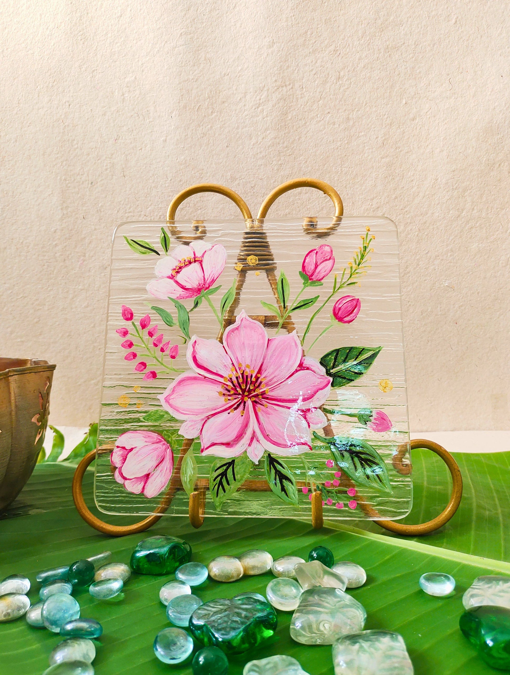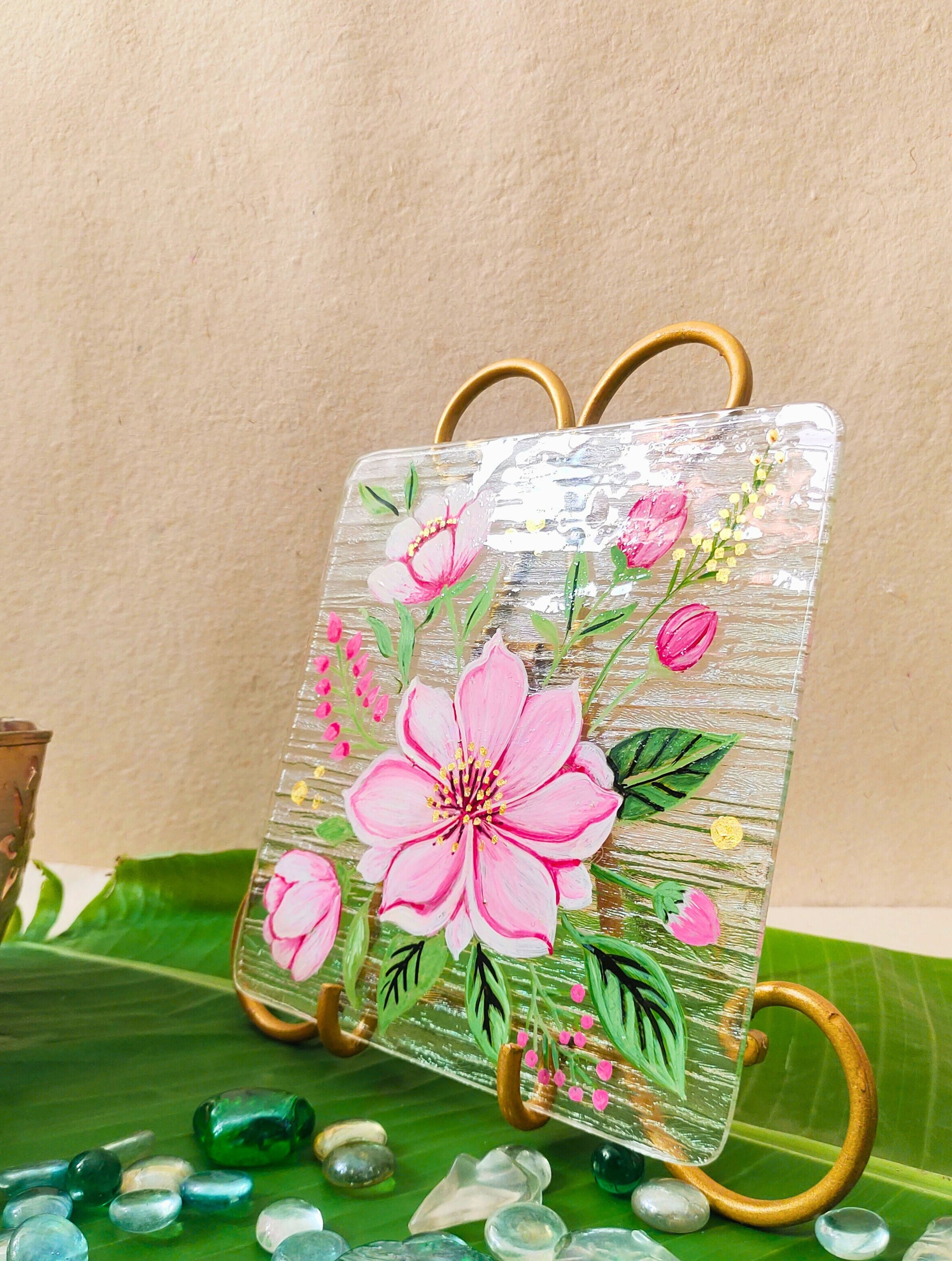 hand-painted glass décor captures the charm of watercolor florals with soft strokes and vibrant detail. Each bloom is carefully painted by hand, making every piece unique. Sealed with a lacquer finish for durability, it reflects light beautifully and adds an elegant touch to any space. Paired with a gold-toned easel, it’s perfect for a corner table, mantle, or as a thoughtful gift that carries the warmth of handcrafted artistry.
