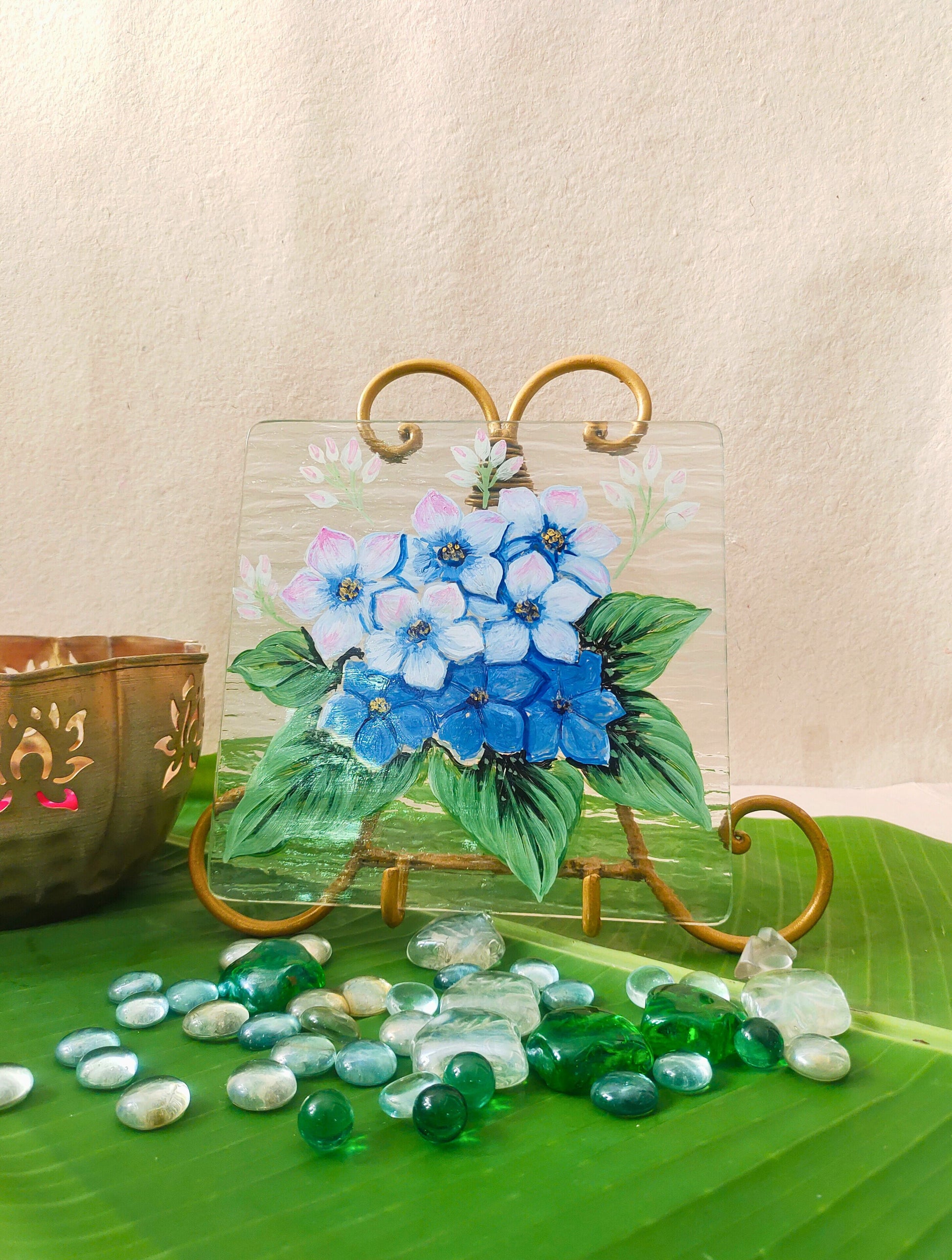 A timeless piece of art, this hand-painted glass décor captures the charm of watercolor florals with soft strokes and vibrant detail. Each bloom is carefully painted by hand, making every piece unique. Sealed with a lacquer finish for durability, it reflects light beautifully and adds an elegant touch to any space. Paired with a gold-toned easel, it’s perfect for a corner table, mantle, or as a thoughtful gift that carries the warmth of handcrafted artistry.