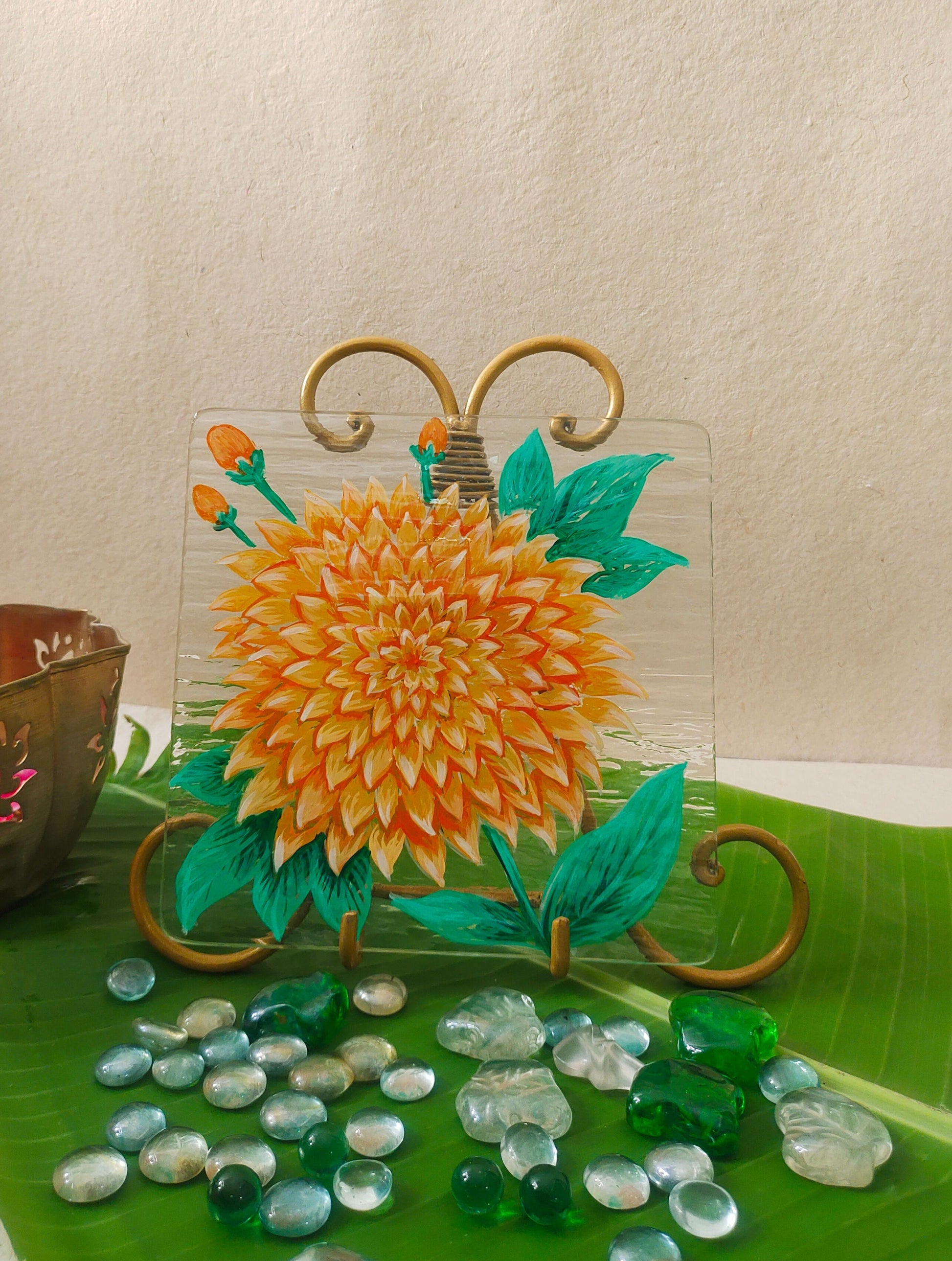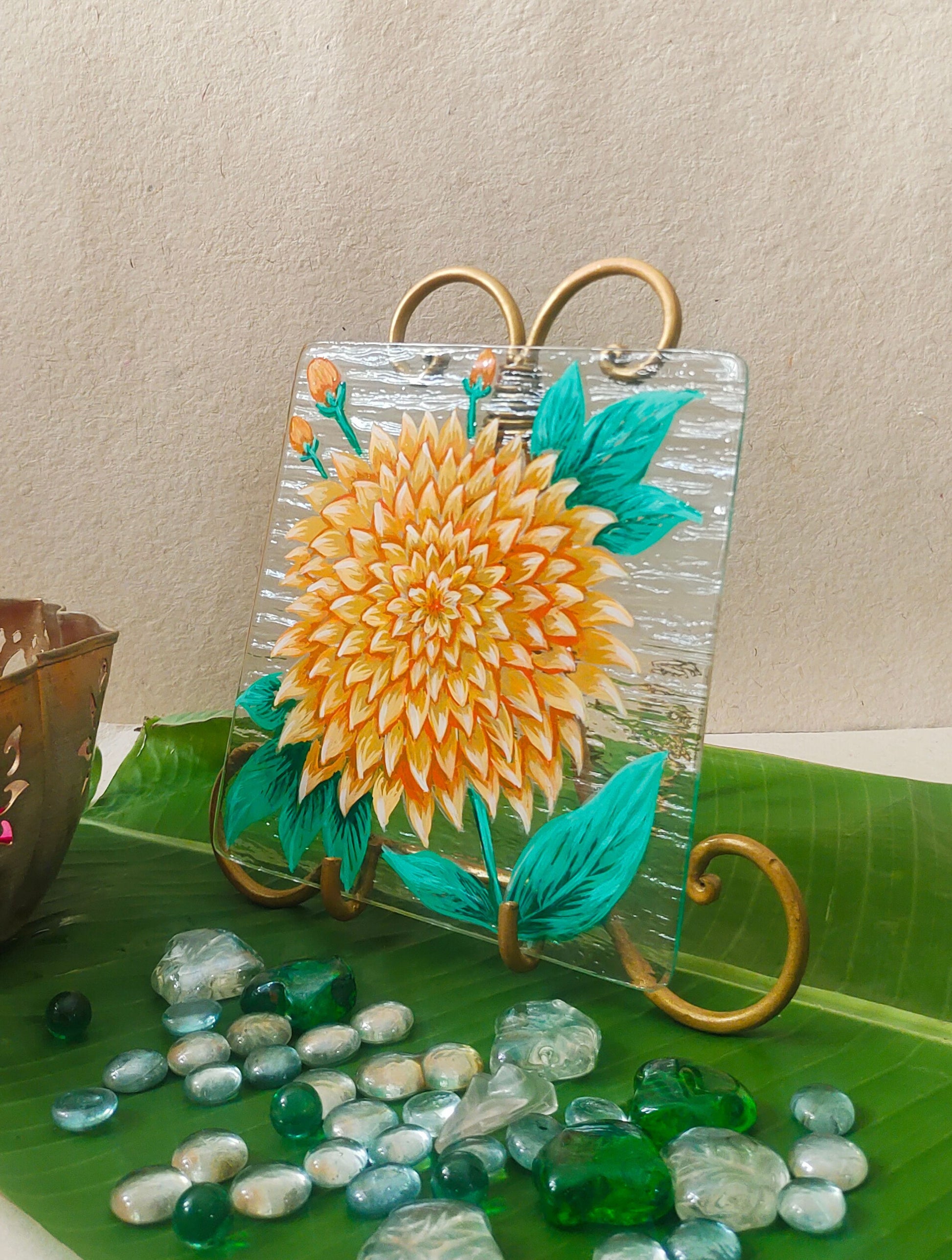 hand-painted glass décor captures the charm of watercolor florals with soft strokes and vibrant detail. Each bloom is carefully painted by hand, making every piece unique. Sealed with a lacquer finish for durability, it reflects light beautifully and adds an elegant touch to any space. Paired with a gold-toned easel, it’s perfect for a corner table, mantle, or as a thoughtful gift that carries the warmth of handcrafted artistry.