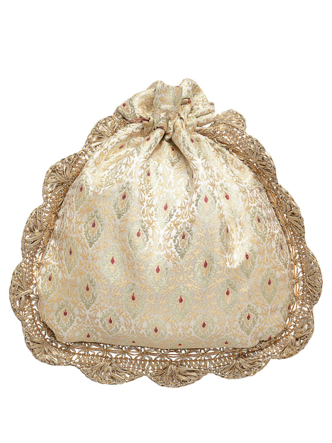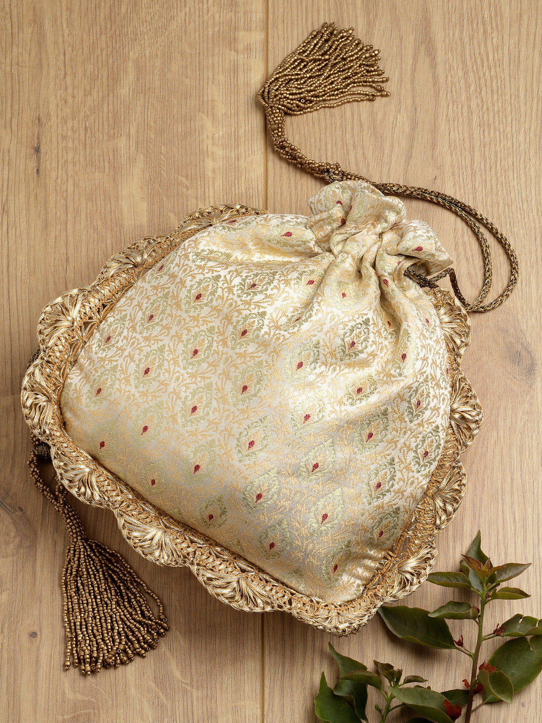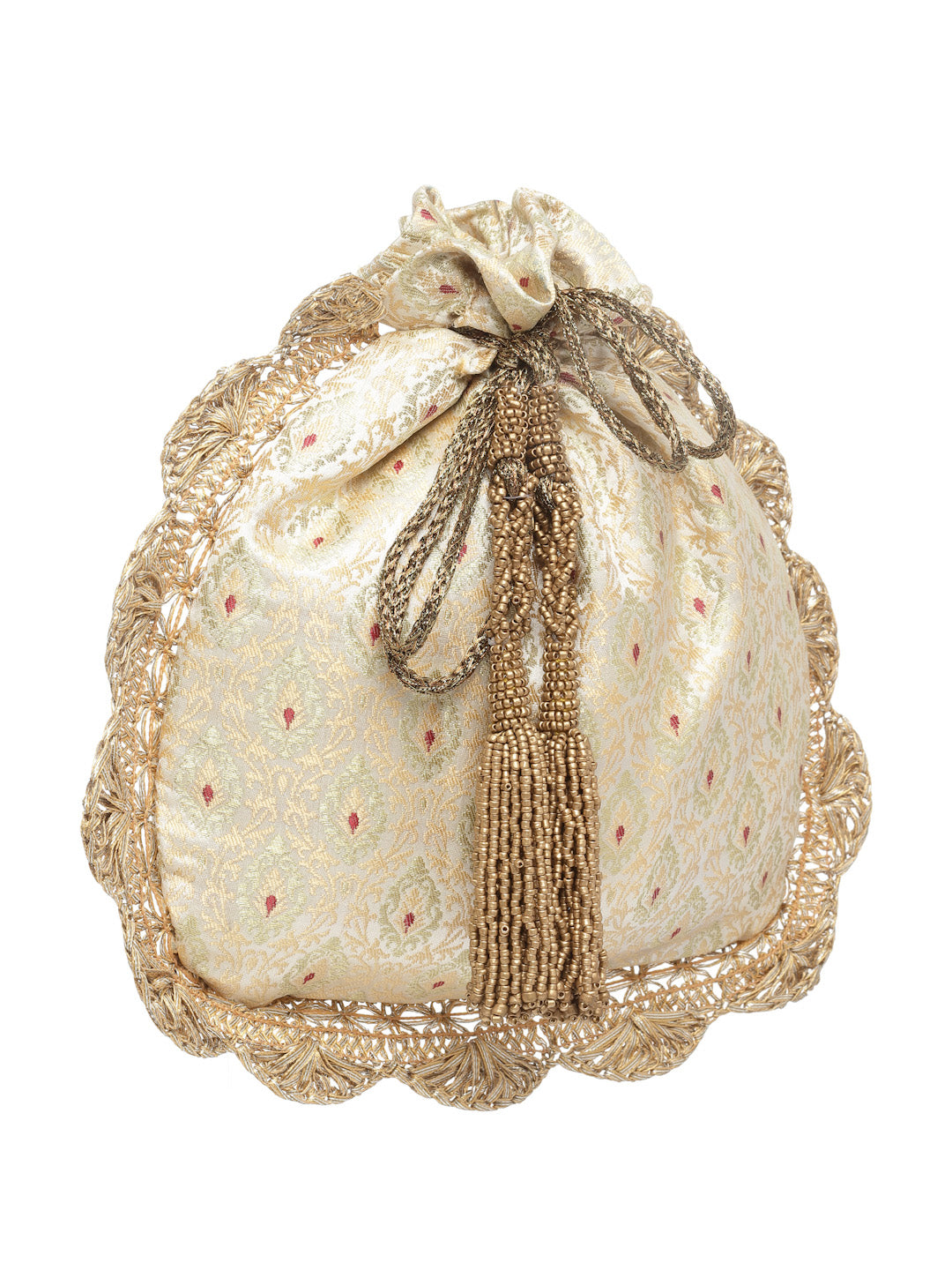 All over floral arabesque pure silk brocade,with golden lace detailing and hand made beaded tassles.