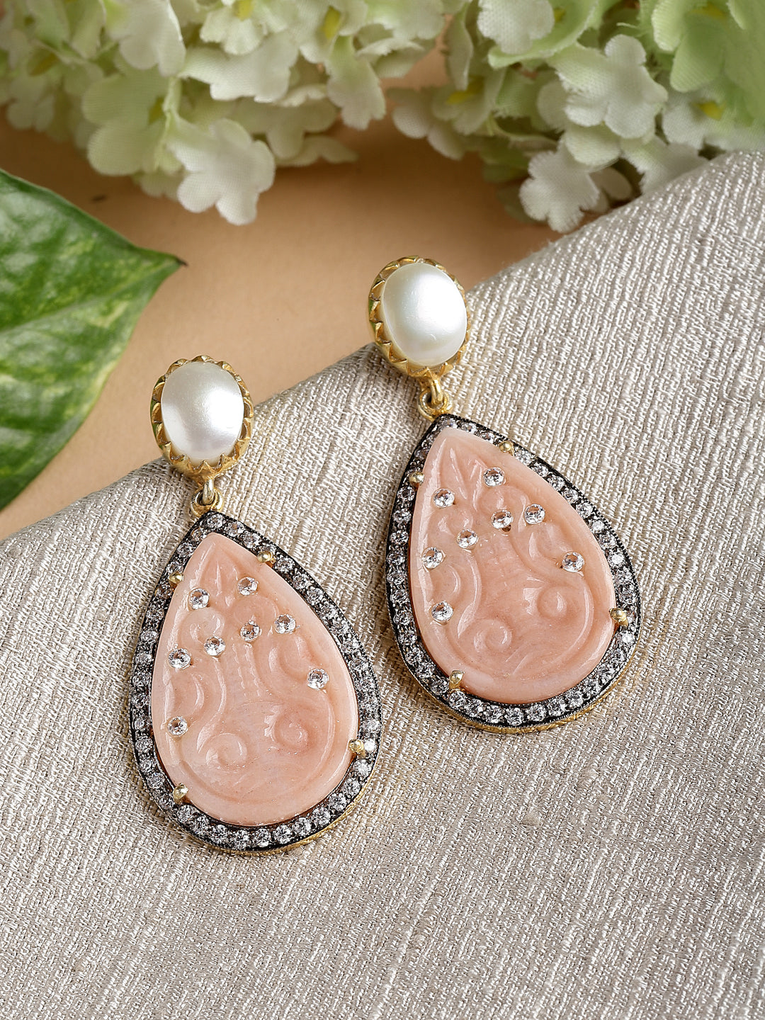 Carved pink opal with paired with natural pearl and cubic zirconia, set in gold-plated silver