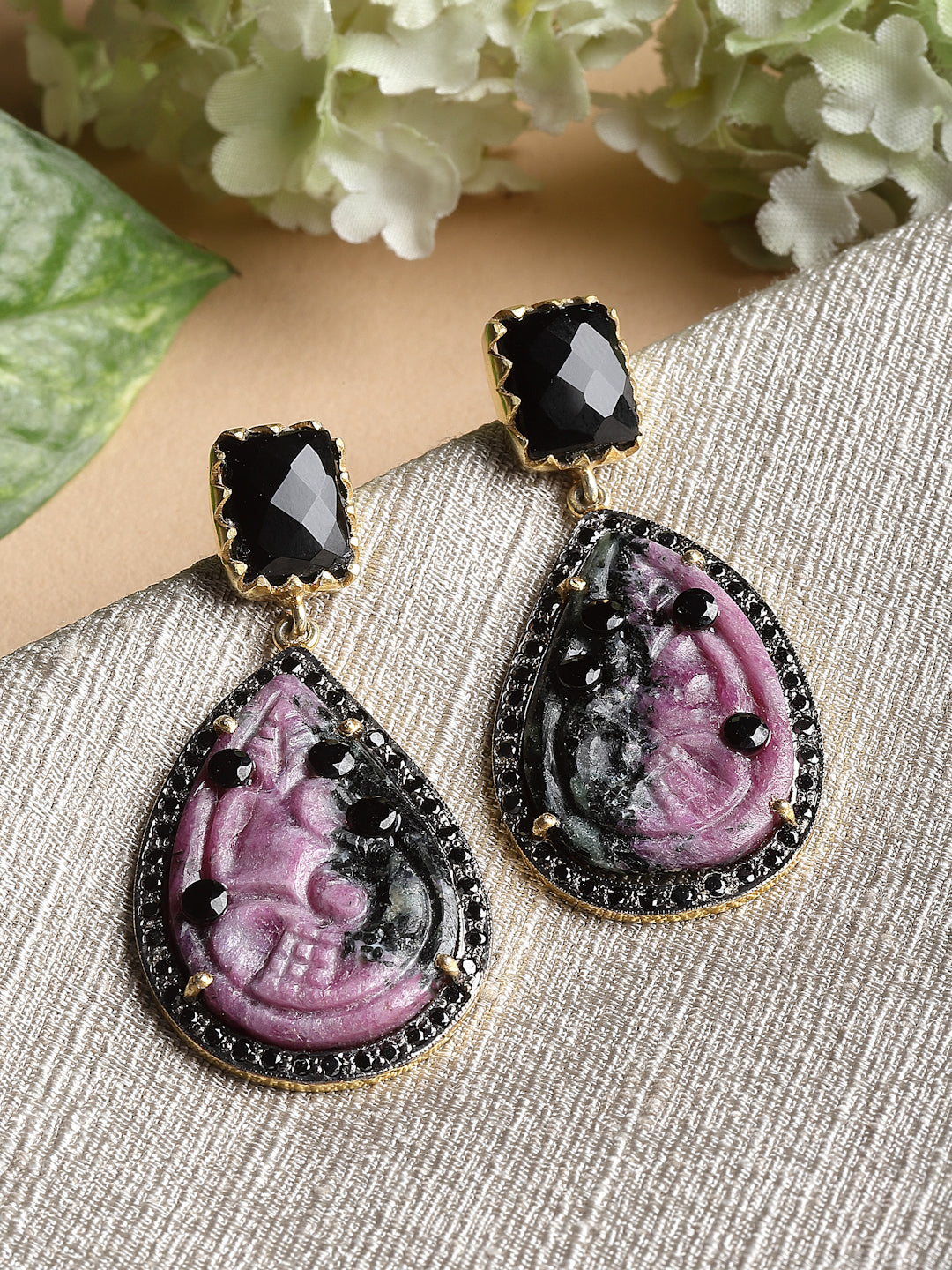 Carved ruby zoisite paired with facetted black onyx and cubic zirconia,set in gold plated silver.