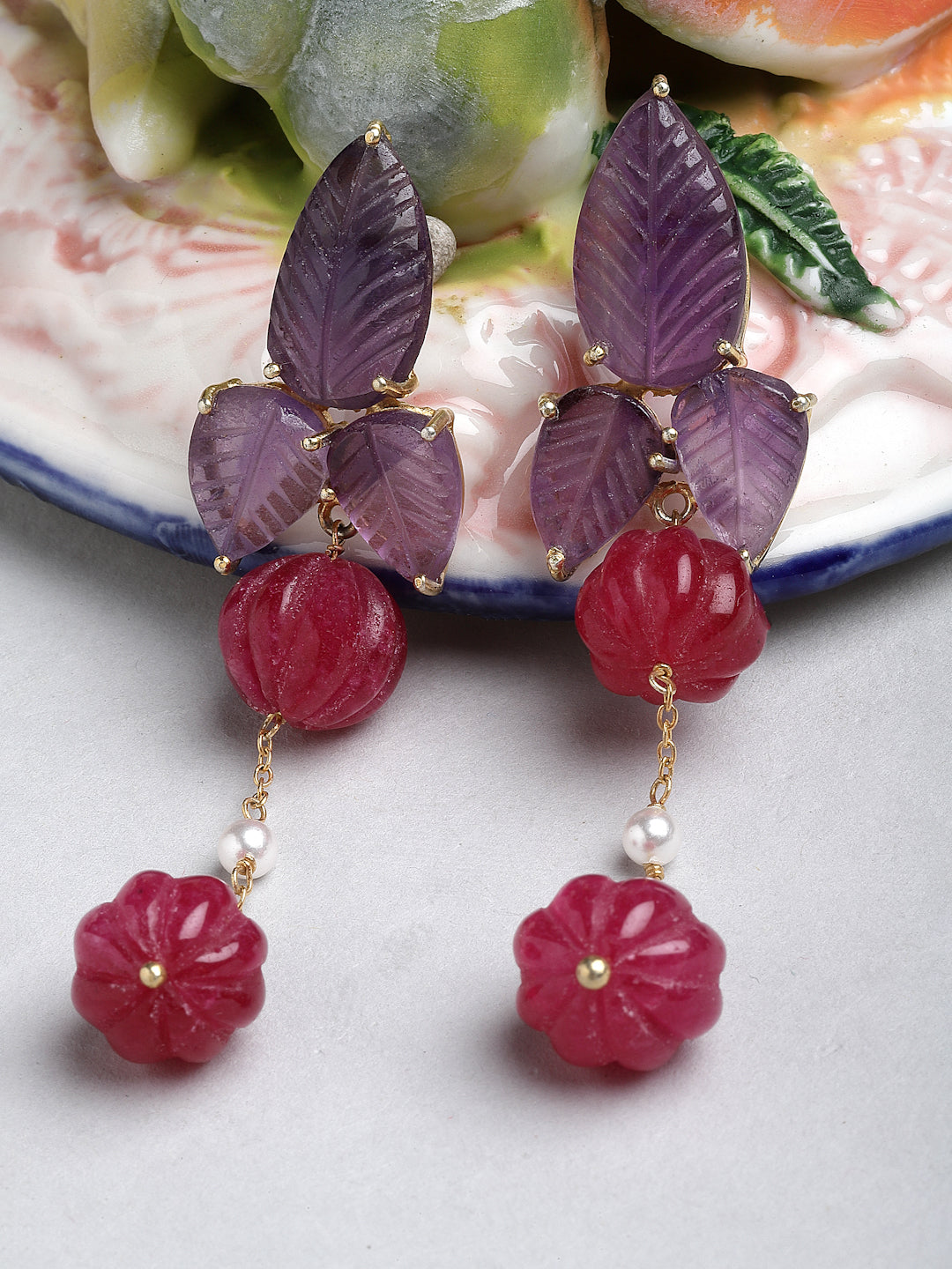 Carved amethyst, natural pearl and red aventurine melon balls set In gold plated silver.