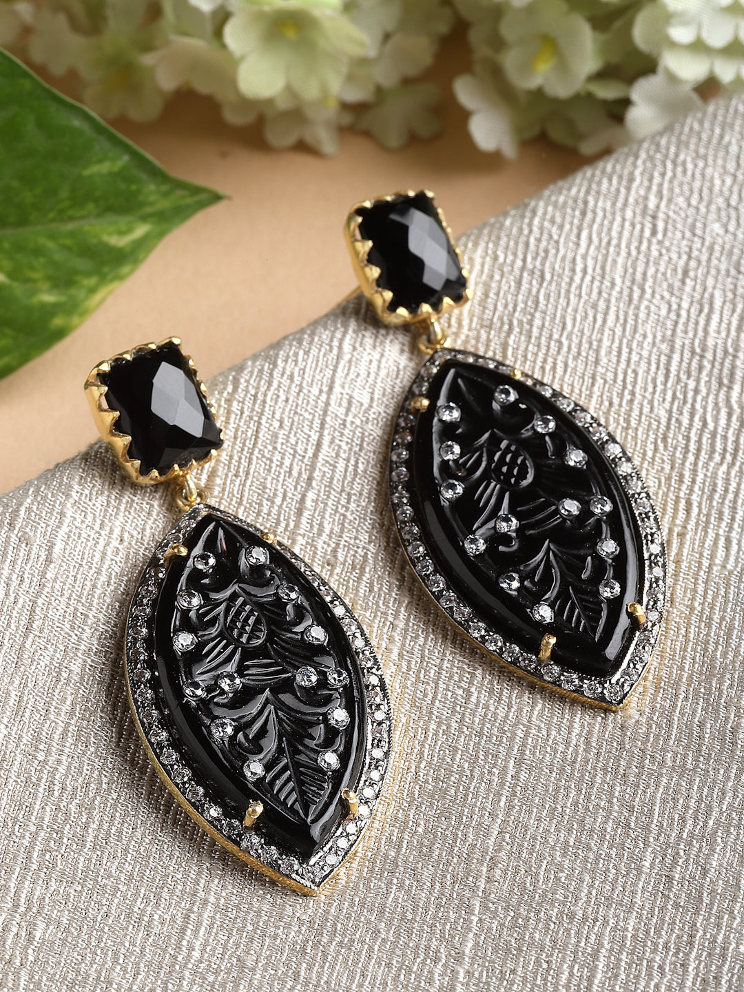 Carved black onyx paired with facetted black onyx and cubic zirconia set in gold plated silver.