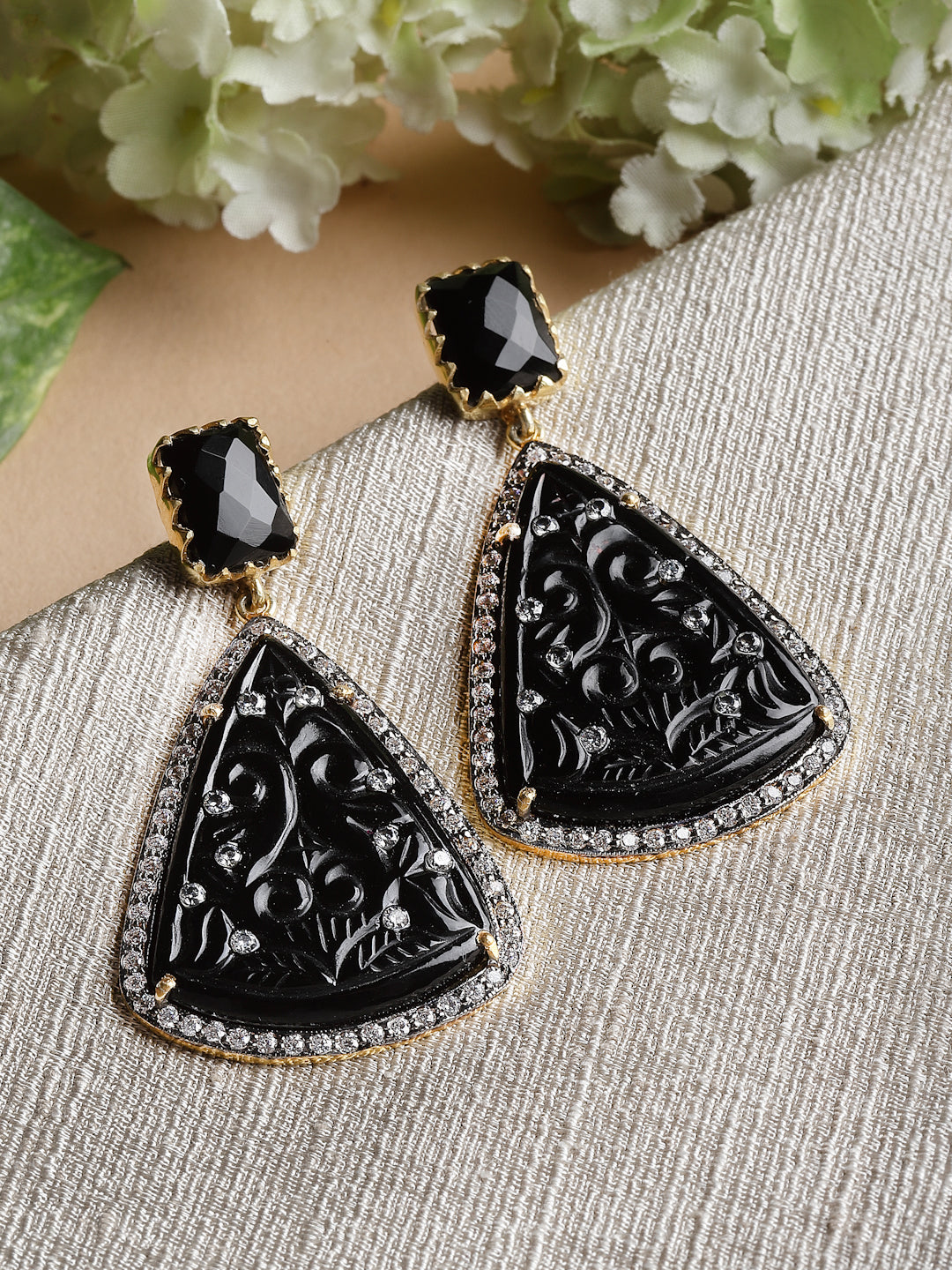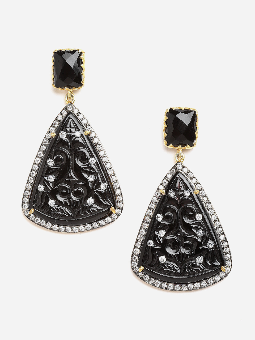 Carved black onyx paired with facetted black onyx and cubic zirconia set in gold -plated silver