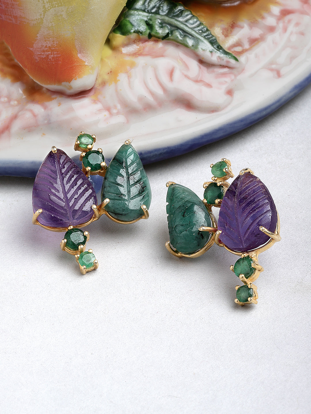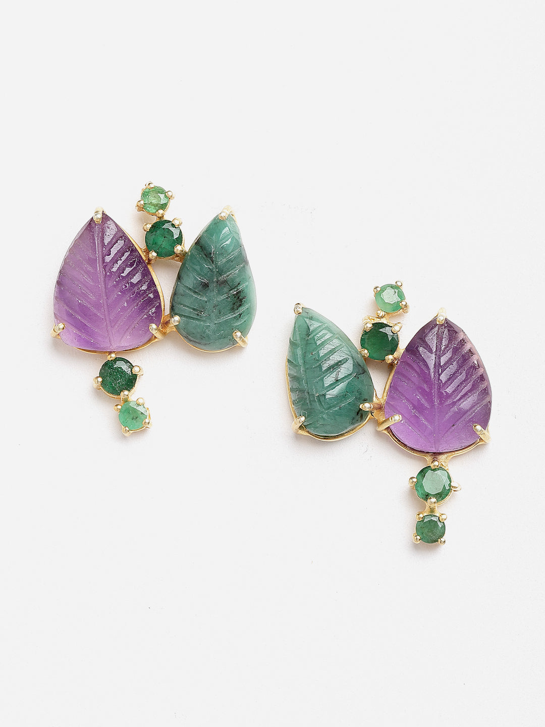 Carved and facetted emerald and amethyst set In gold-plated sterling silver.