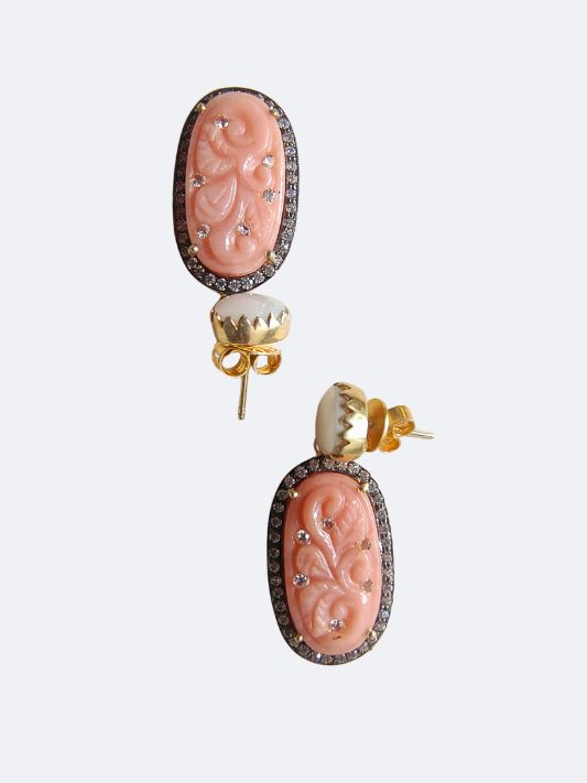 Feminine and ethereal, these gold-plated sterling silver earrings feature delicately carved pink opals, framed with a halo of shimmering cubic zirconia for a touch of sparkle. The drops dangle elegantly from luminous moonstone tops, adding a soft glow and graceful movement.