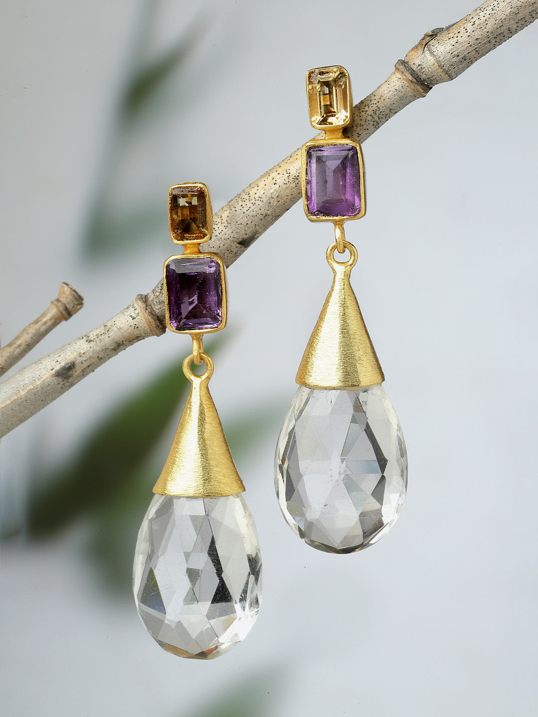Pure hand cut crystal danglers with accents of amethyst finished in gold plated burnished silver.