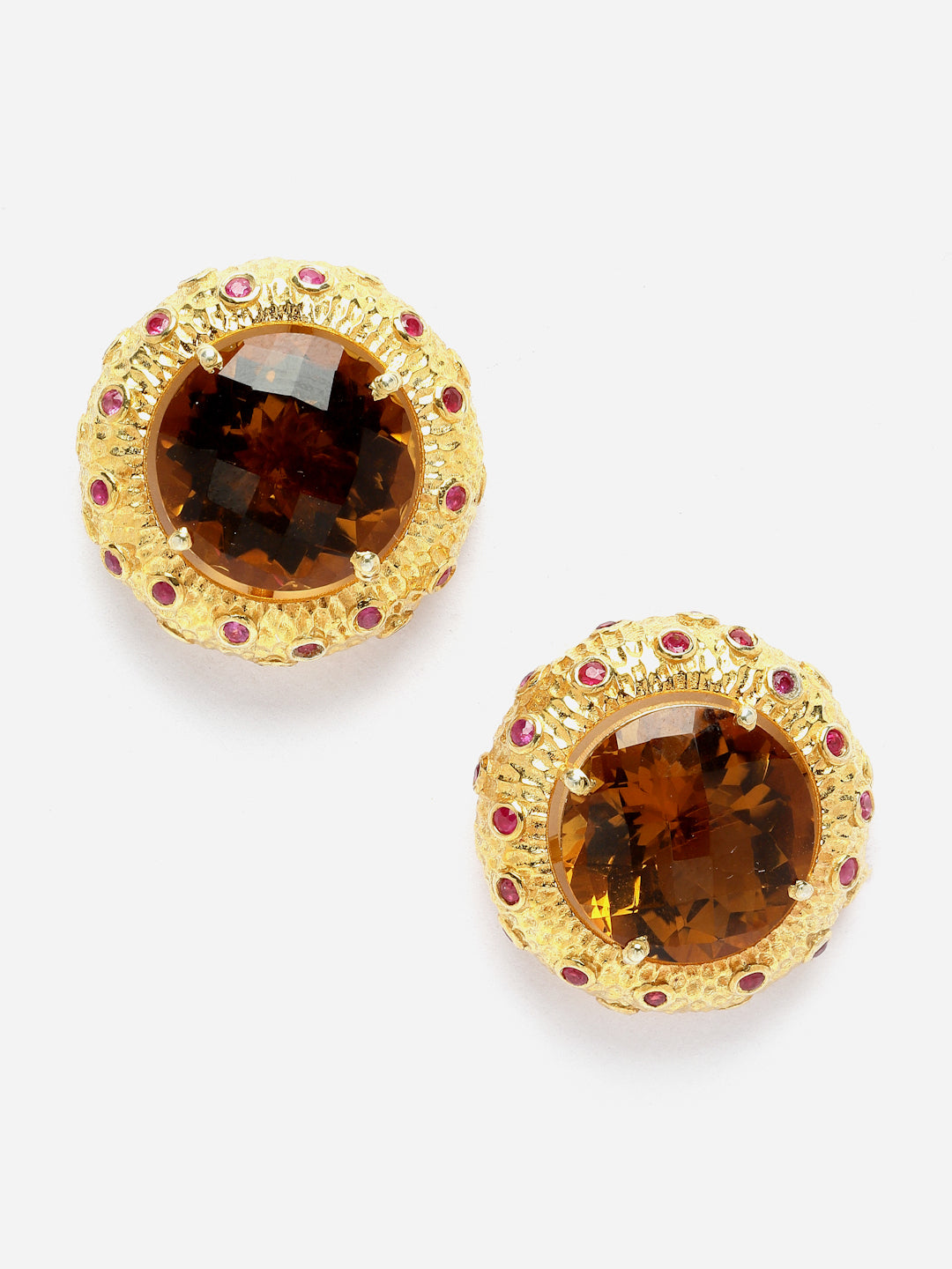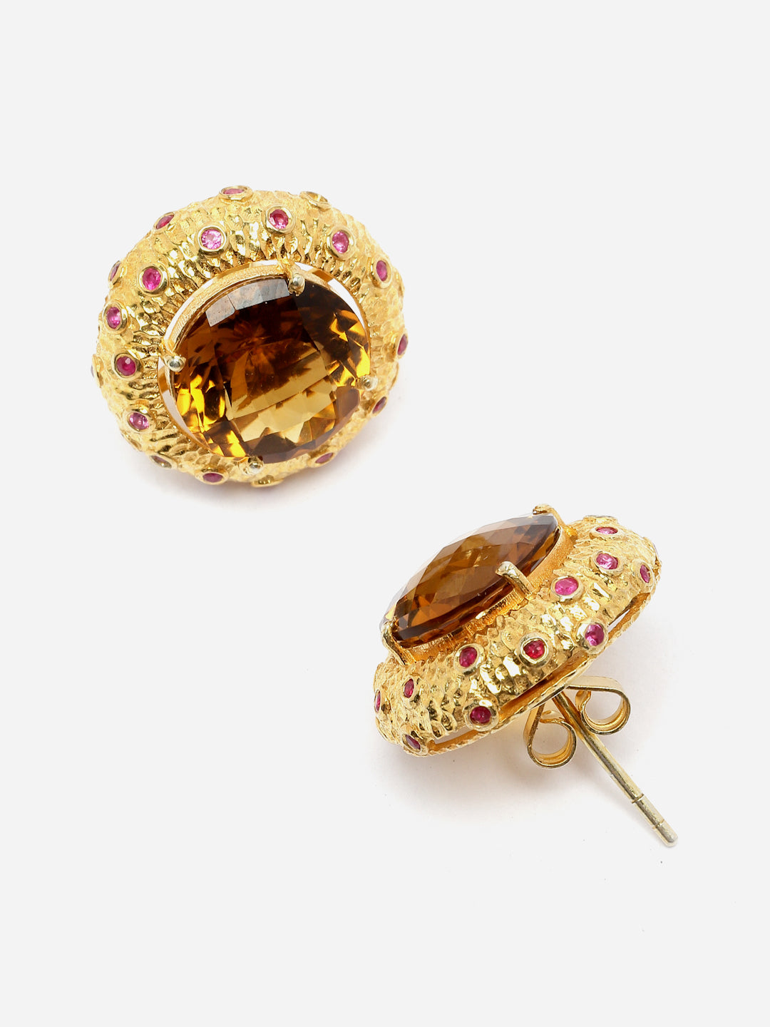 Beautifully cut beer quartz set in hammered silver, studded with rubies.