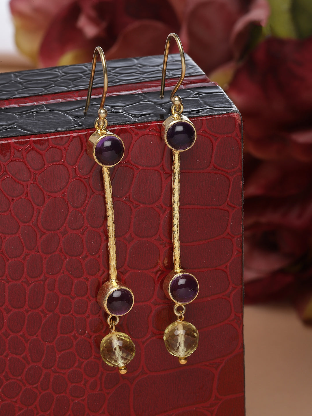 Long drop earrings with cabochon amethyst and lemon quartz drops.Gold plated silver.