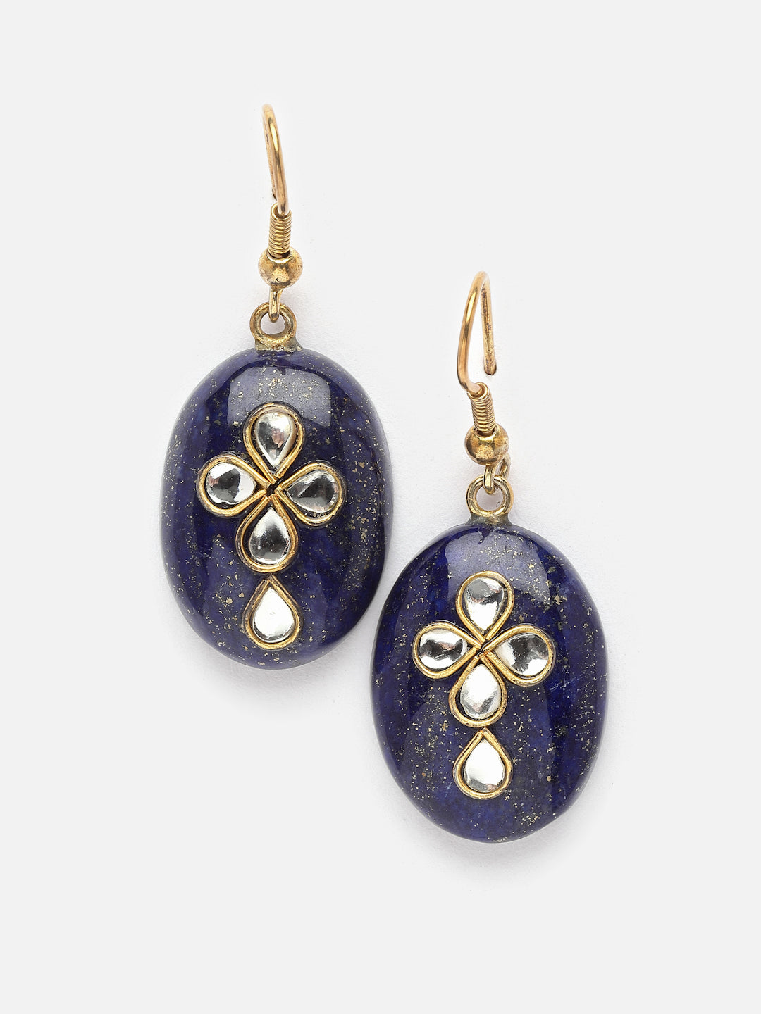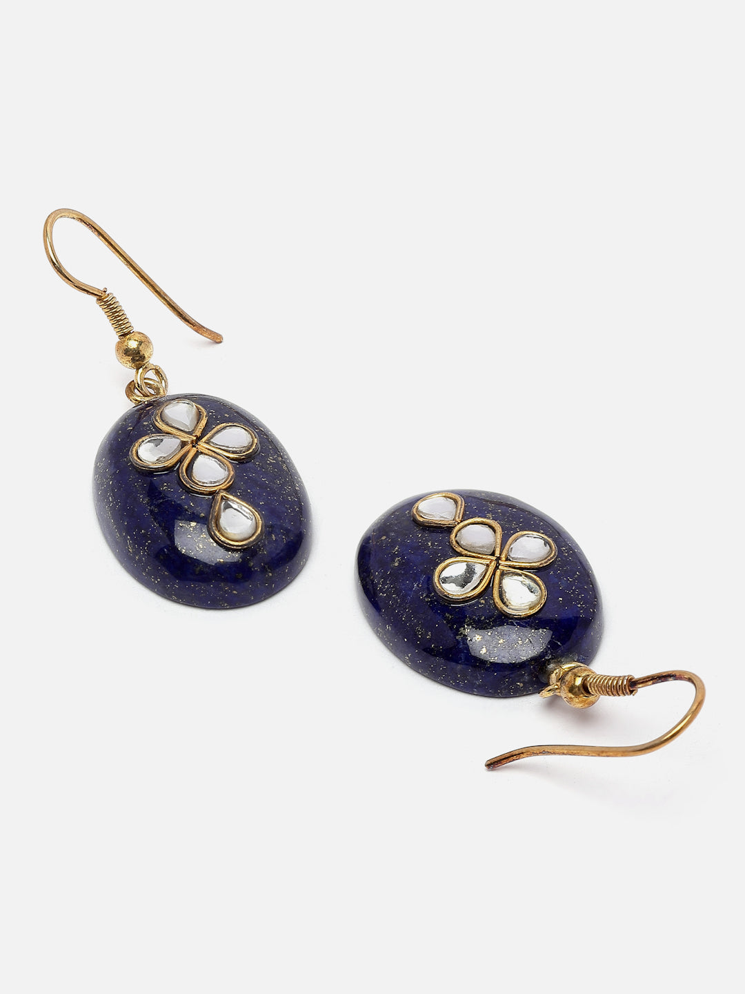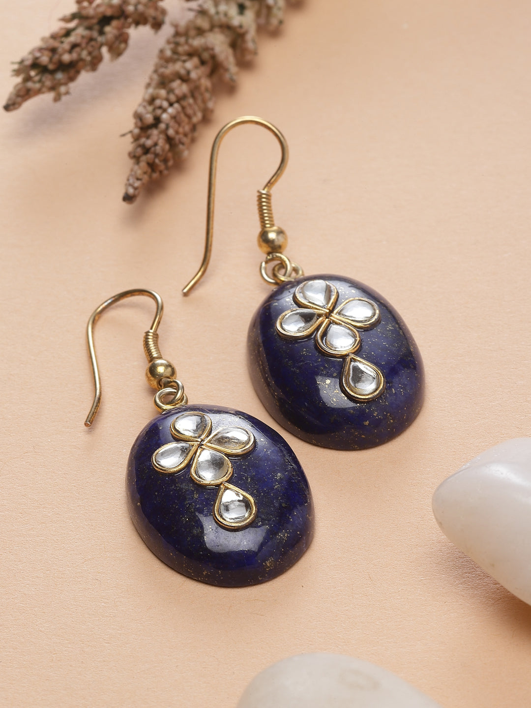 A beautiful pair of traditional silver earrings kundan work on gold speckled lapis lazuli.
