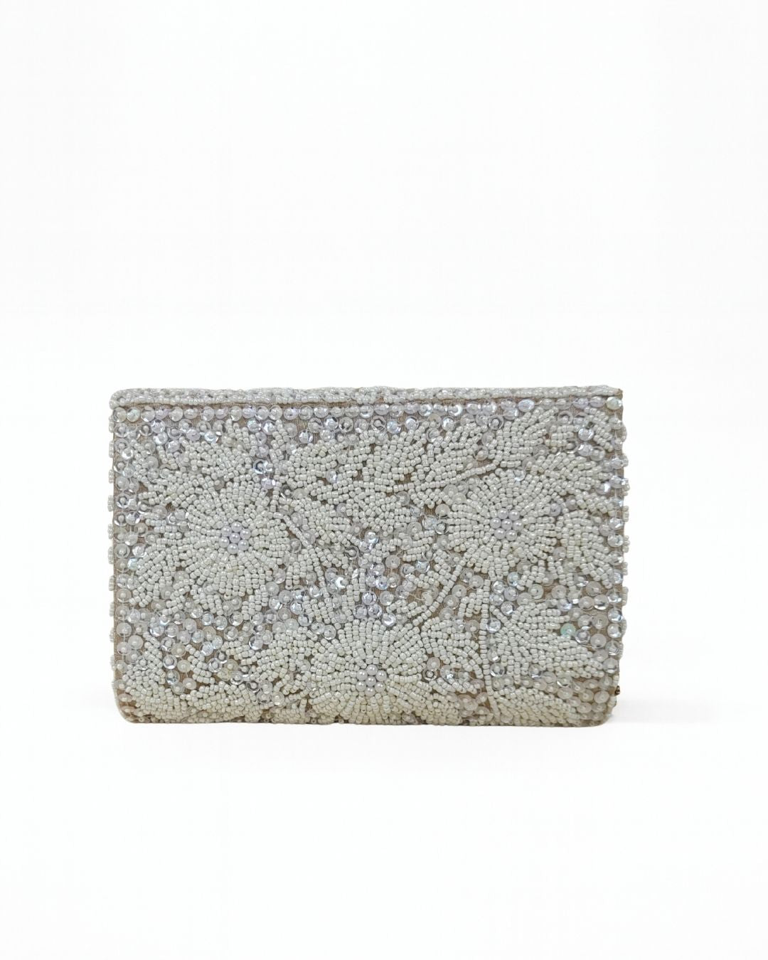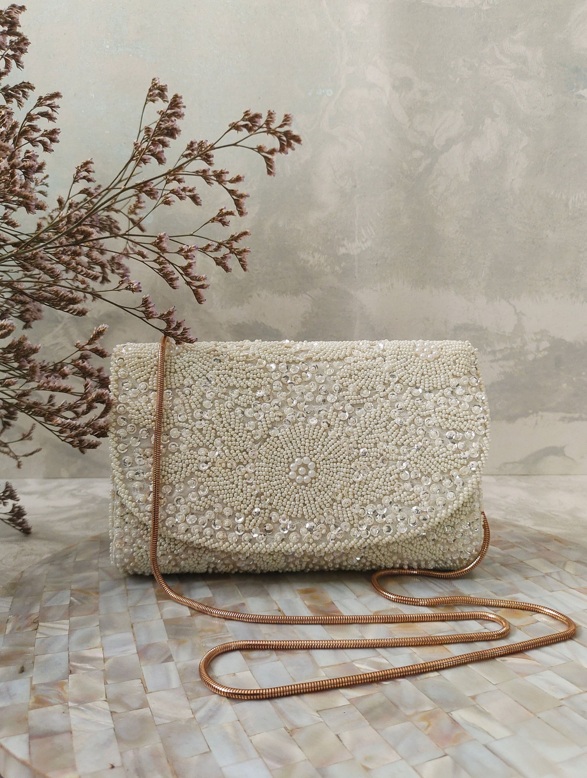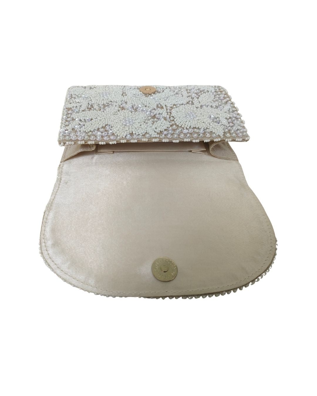 Elegant ivory-white beaded clutch embellished with intricate hand embroidery and shimmering sequins in floral patterns. Its refined and graceful design makes it a perfect accessory to pair with bridal wear, festive ensembles, and evening outfits.