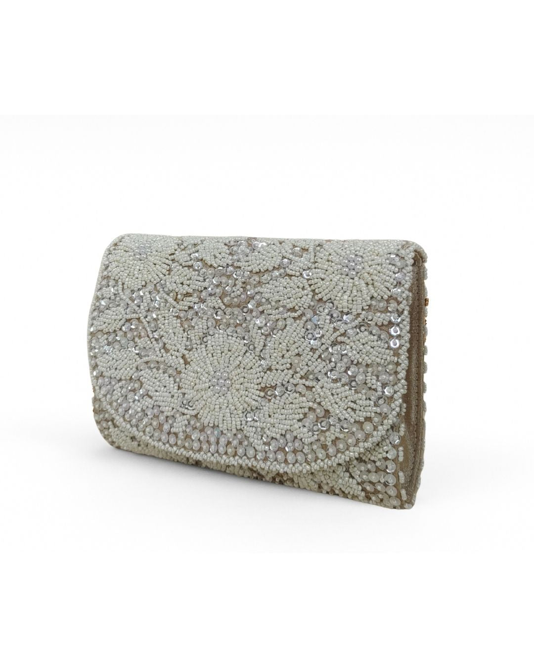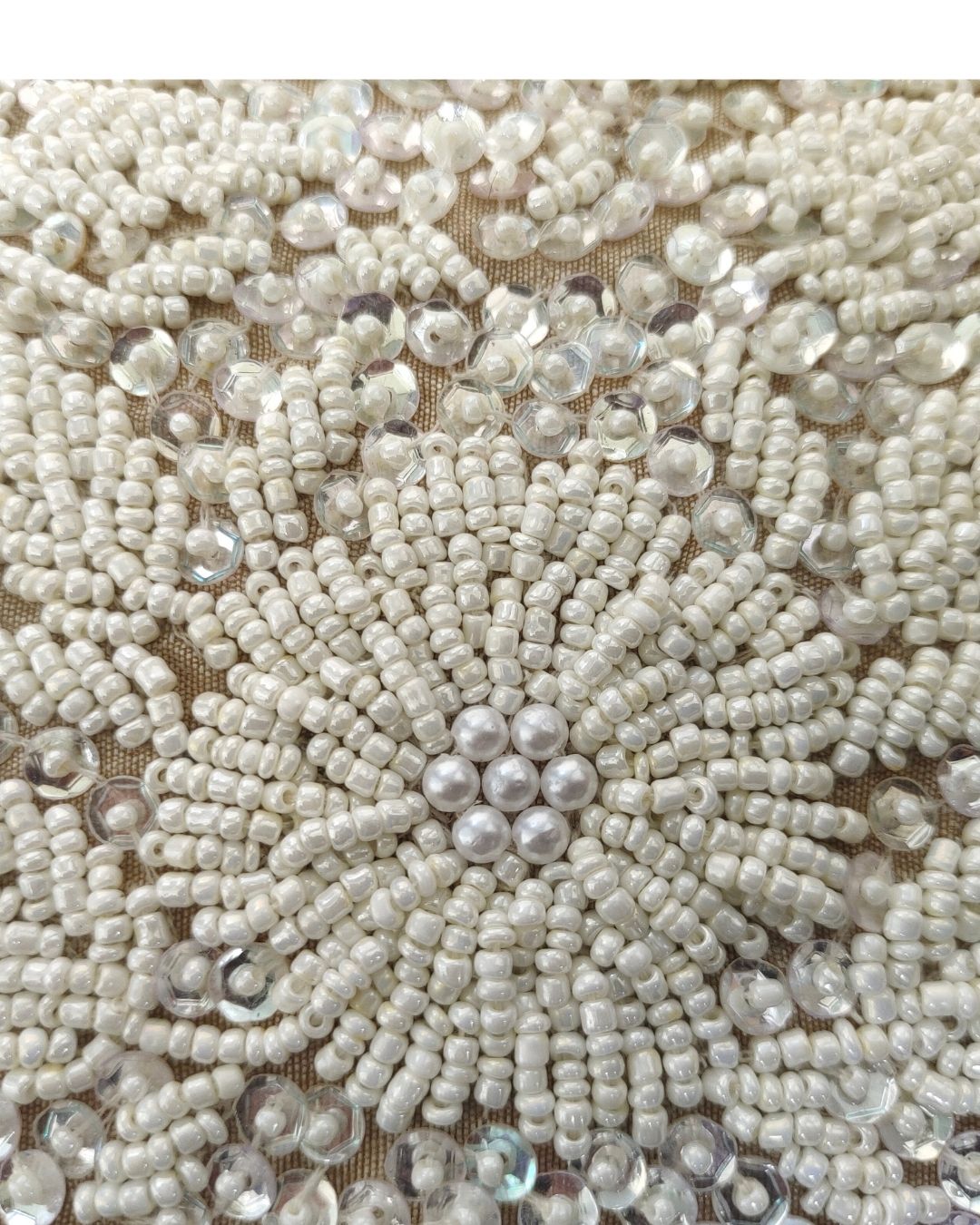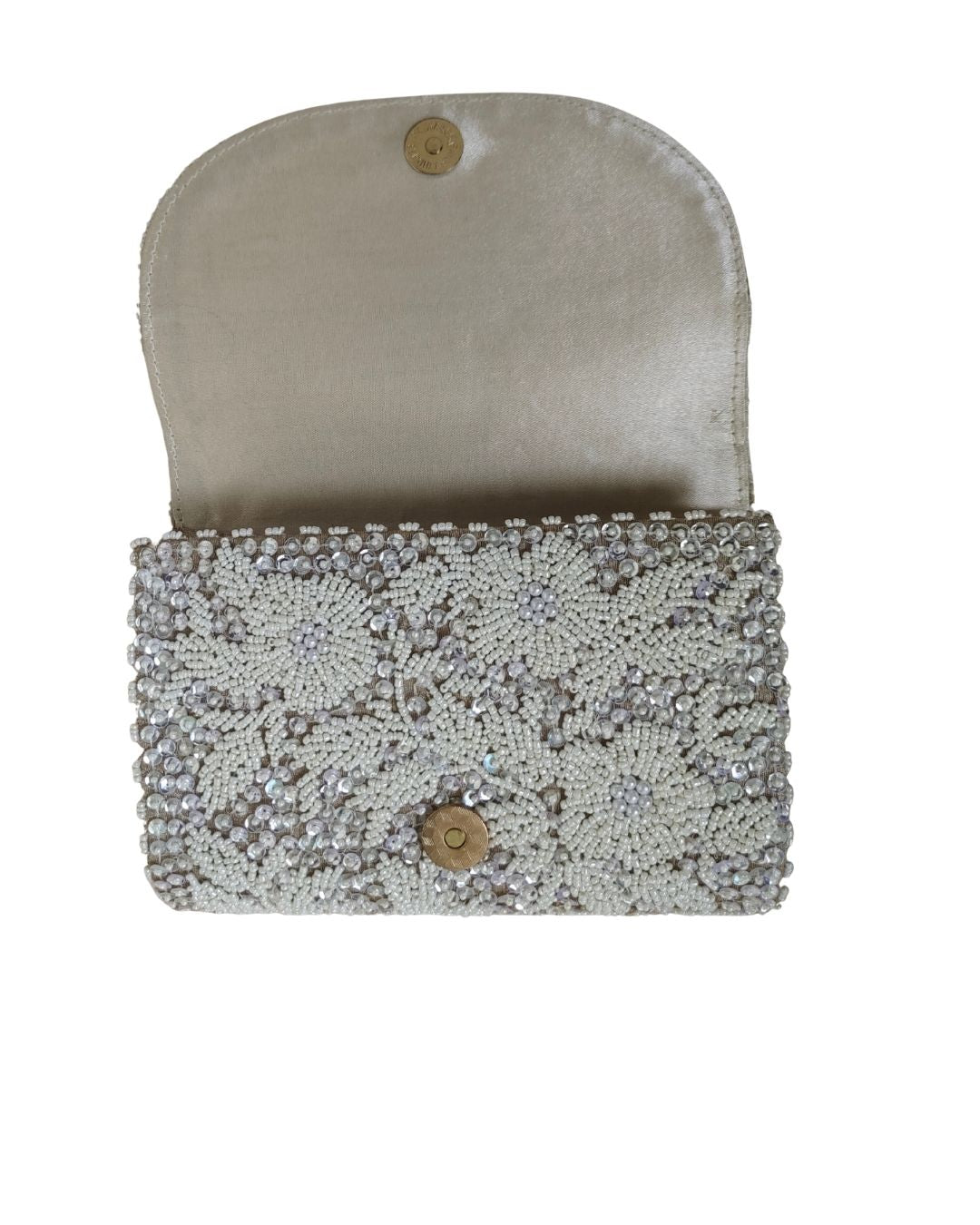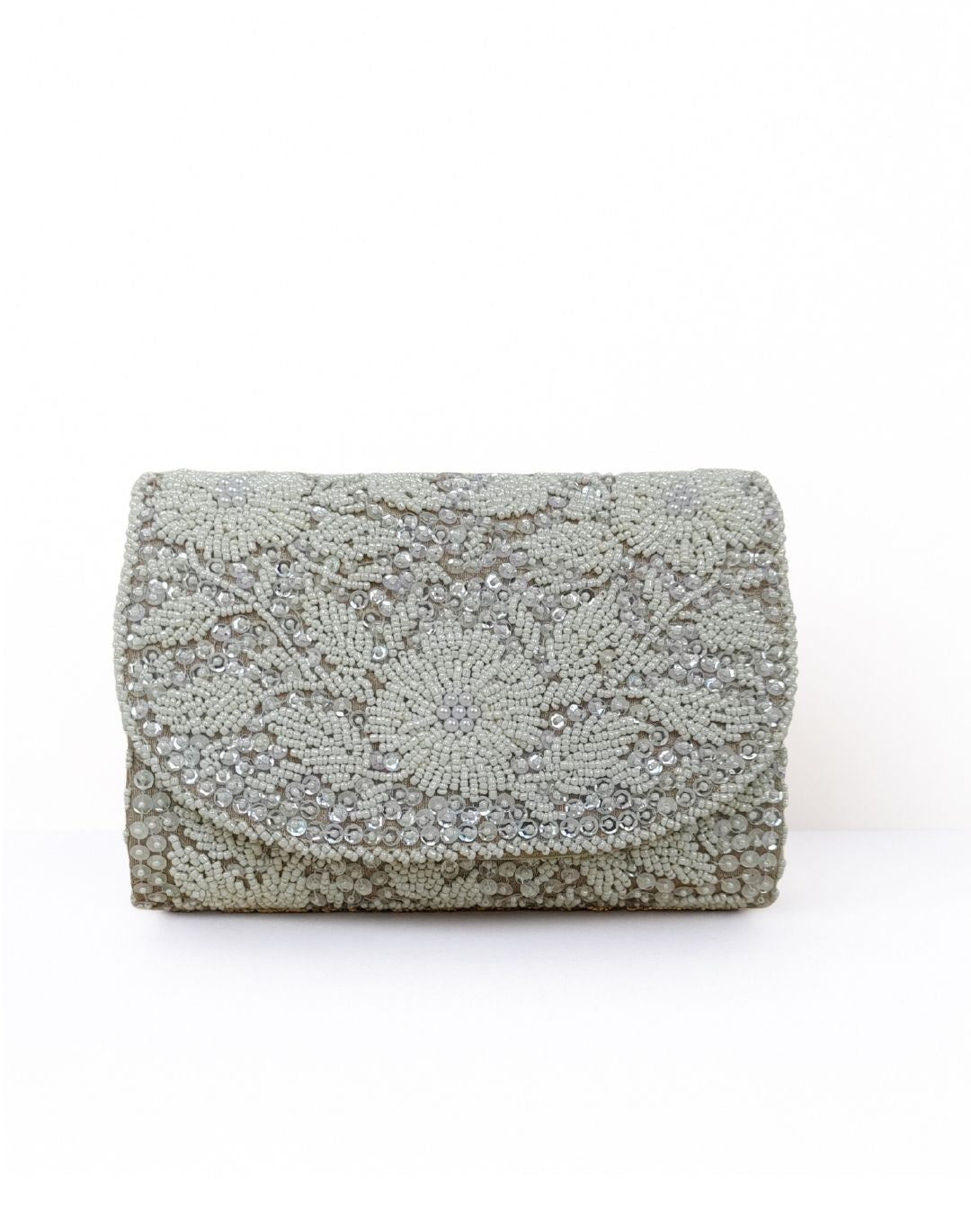 Elegant ivory-white beaded clutch embellished with intricate hand embroidery and shimmering sequins in floral patterns. Its refined and graceful design makes it a perfect accessory to pair with bridal wear, festive ensembles, and evening outfits.