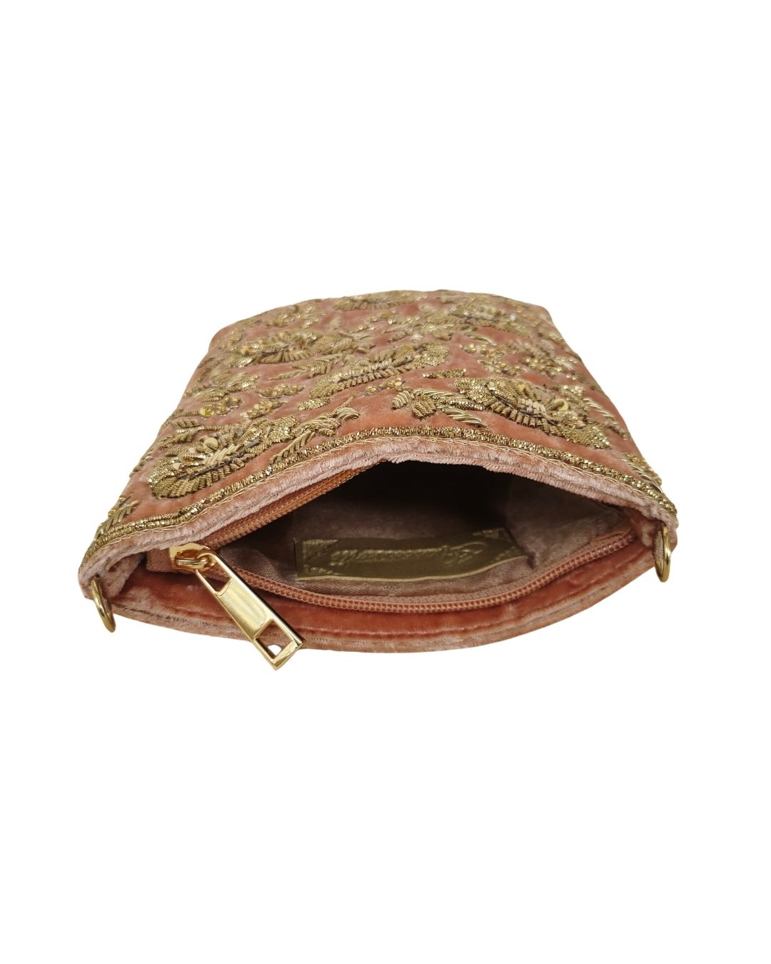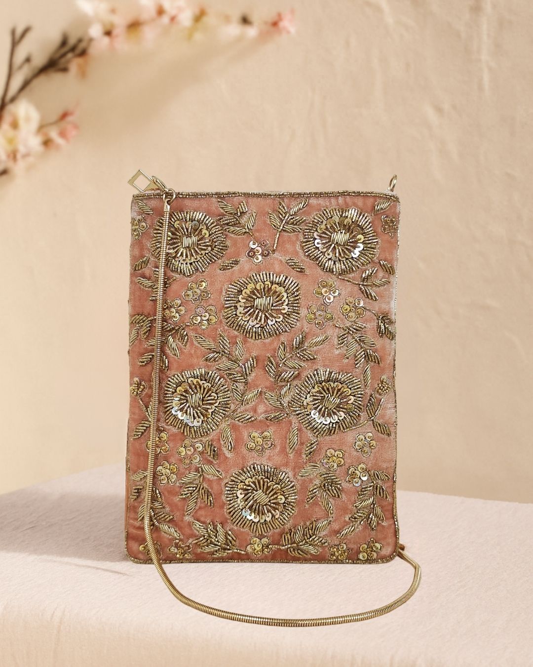 Elegant dusty pink-gold sling batuwa embellished with intricate hand bead embroidery and shimmering sequins in bold floral motifs. Designed with a soft fabric base and ornate detailing, this traditional yet stylish batuwa is perfect for carrying essentials with ease while adding a festive charm to your look.