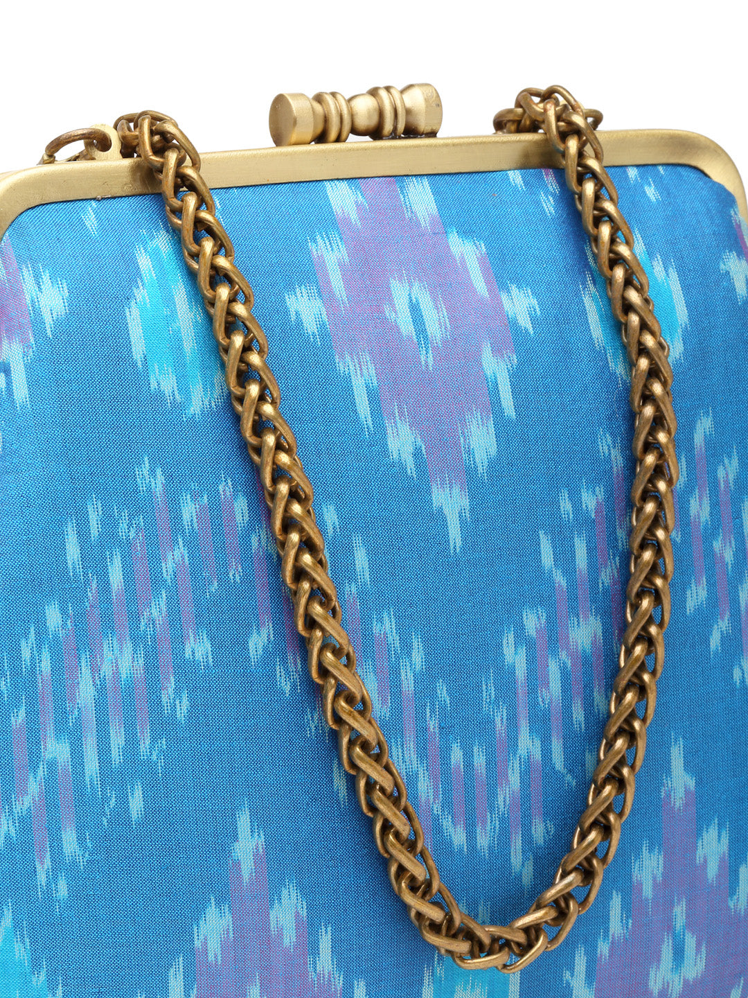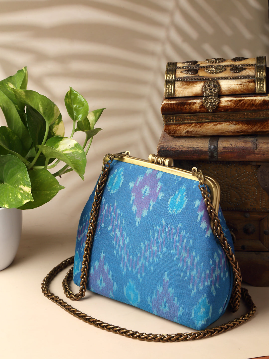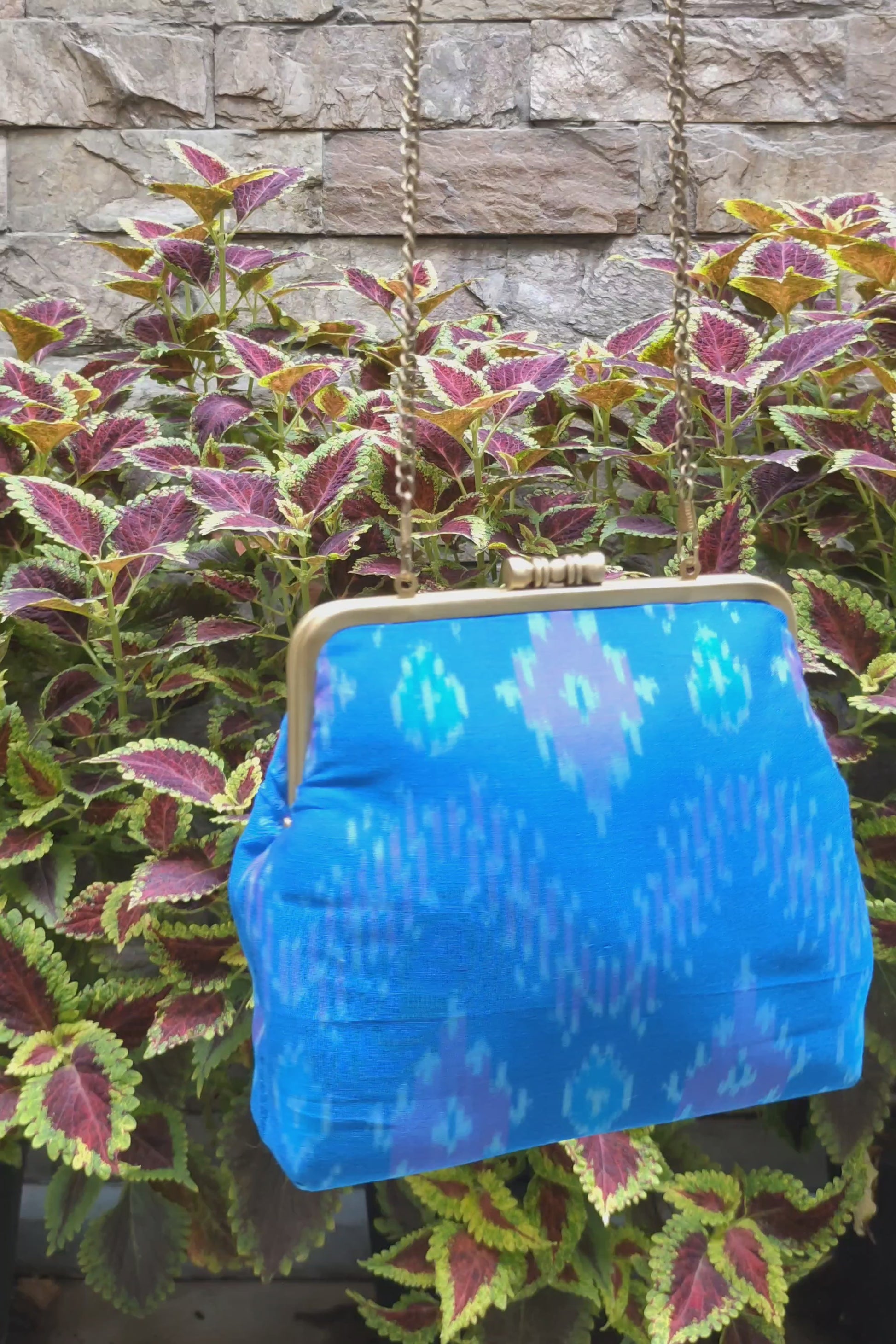 Handmade all over a Pure silk Ikat on a straight half frame. It has a detachable chain handle.