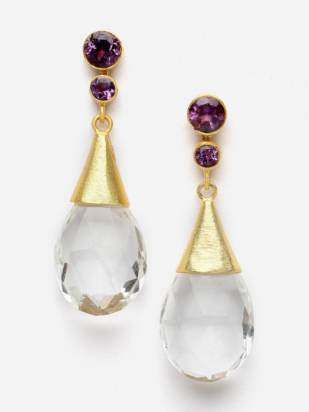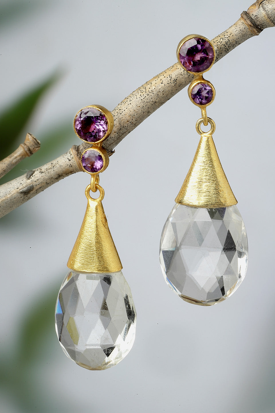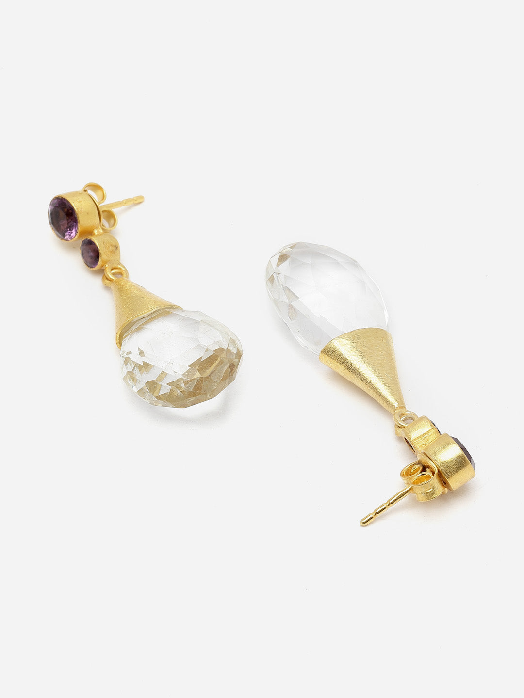 Beautifully hand cut crystal ear drops paired with facetted amethyst, set in satin gold plated finish sterling silver.