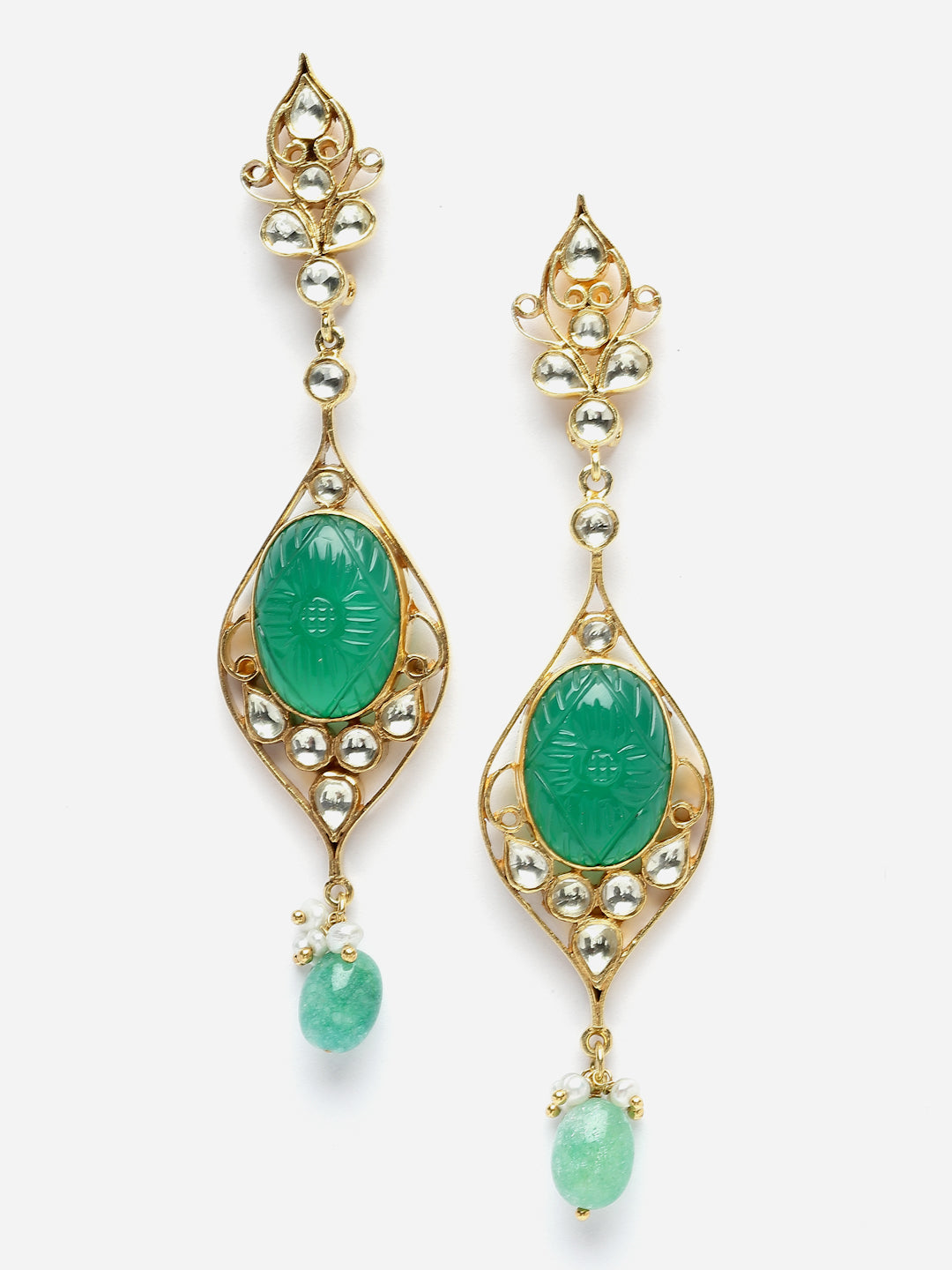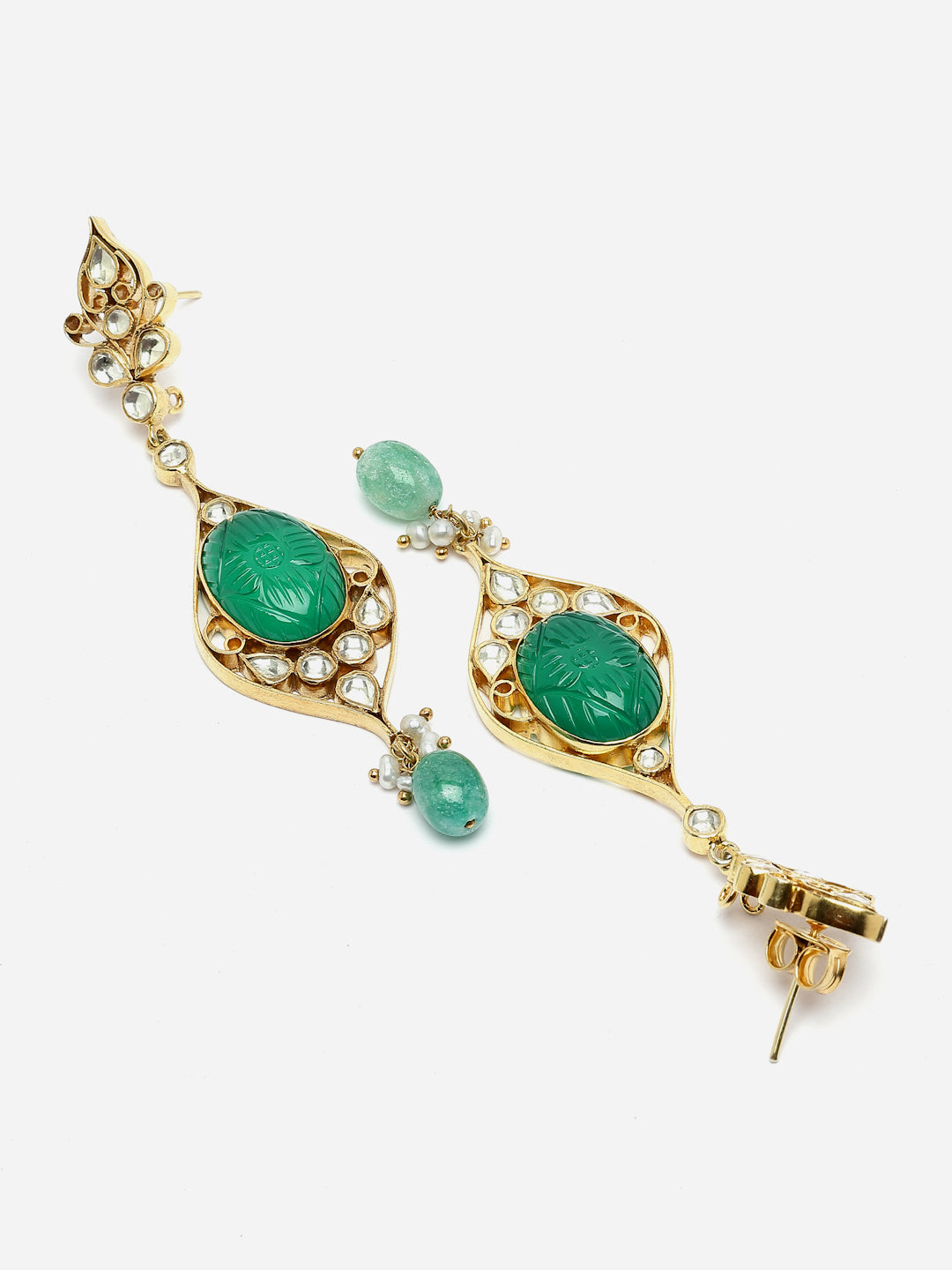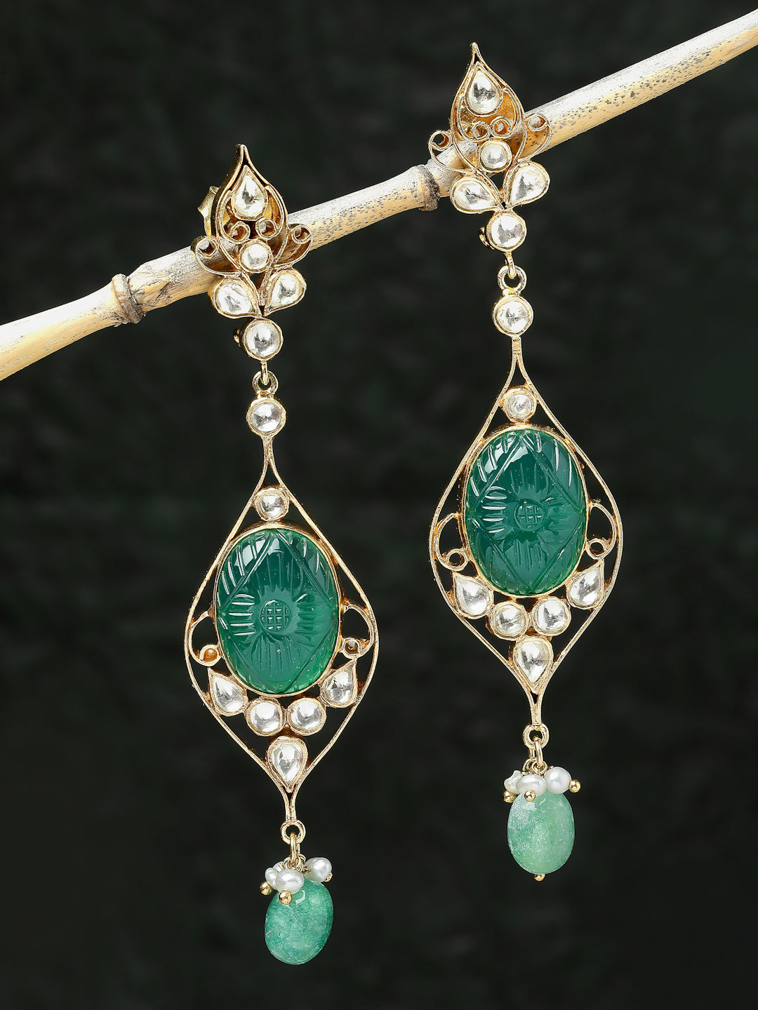 Long green onyx and kundan earrings accentuated with filigree work and pearl accents.