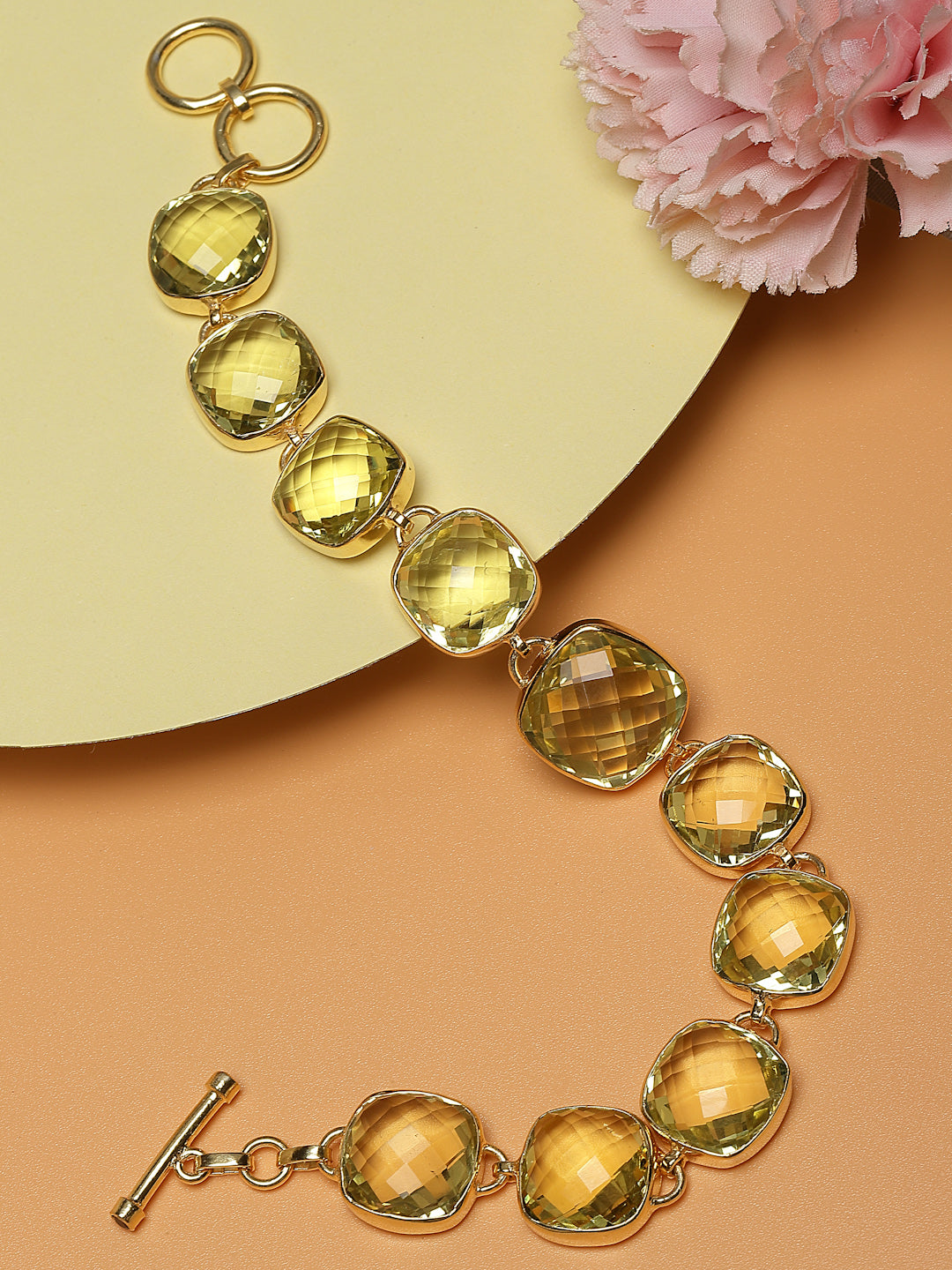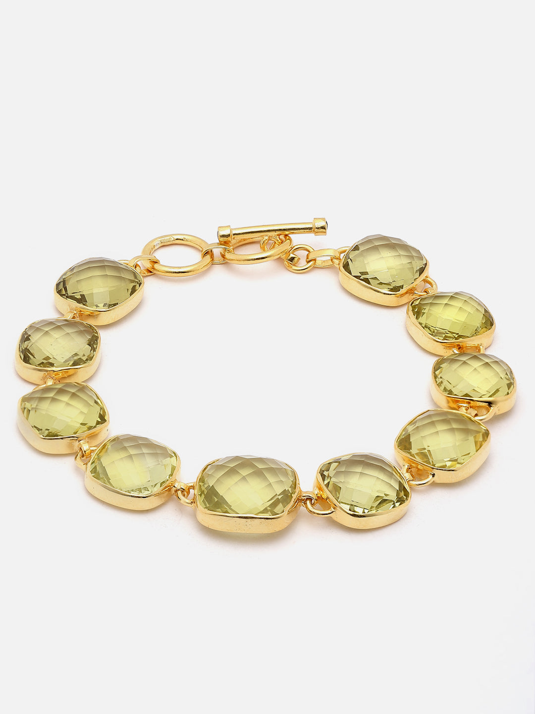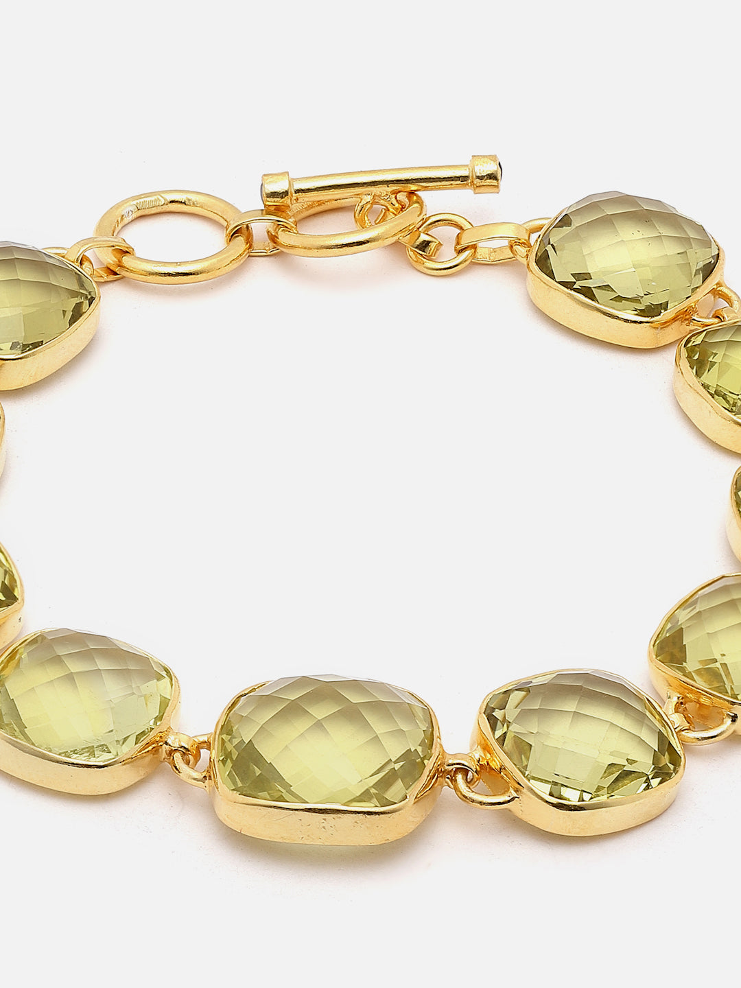Cushion cut lemon quartz bracelet set in gold plated silver.Toggle closure.
