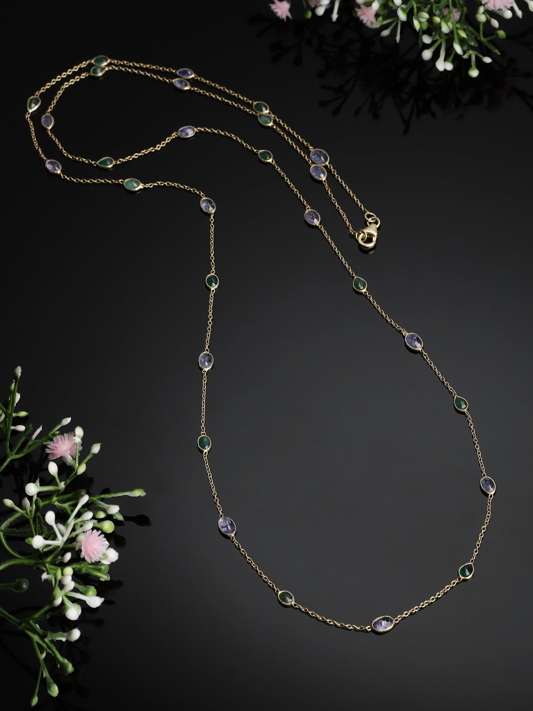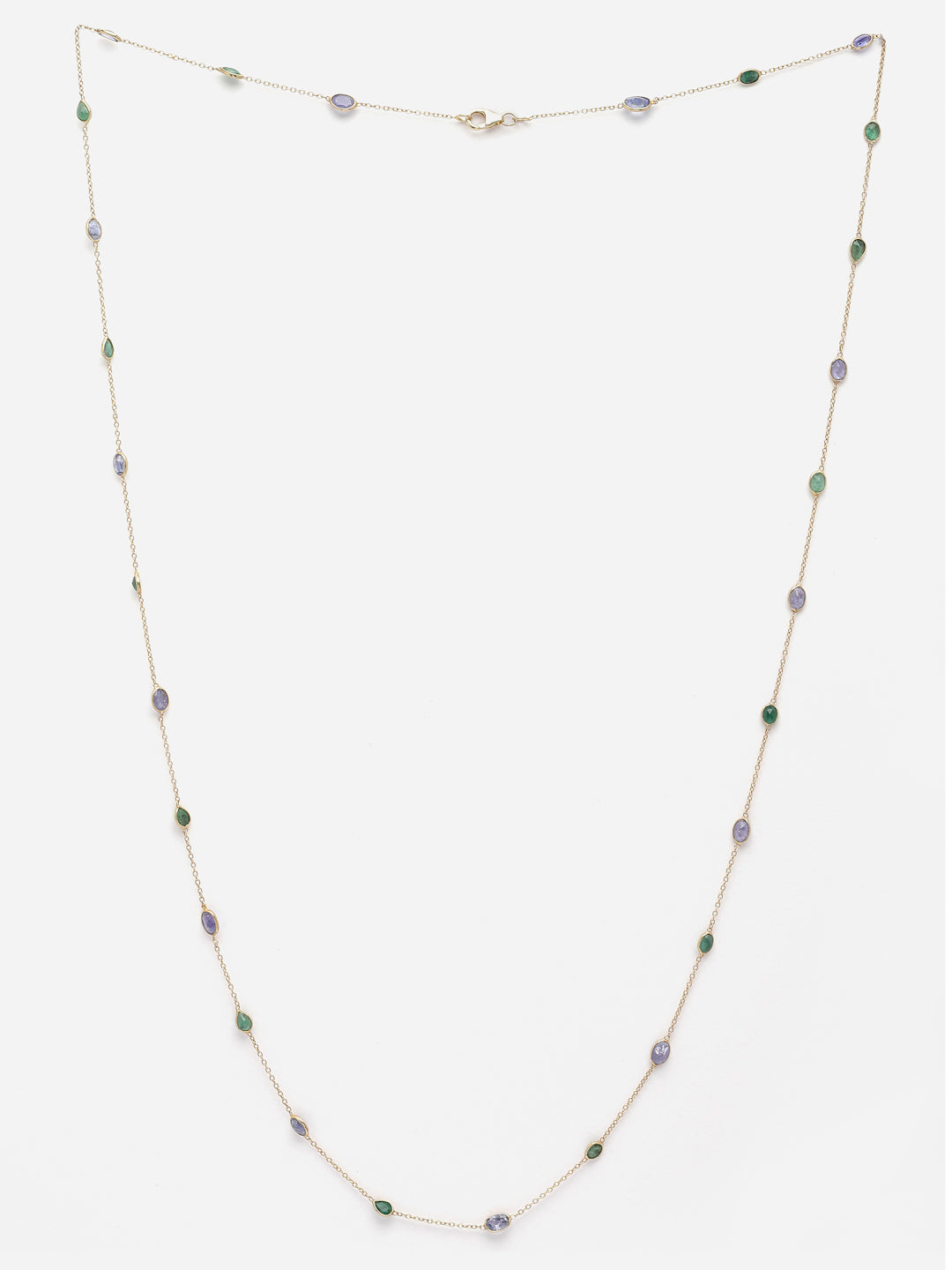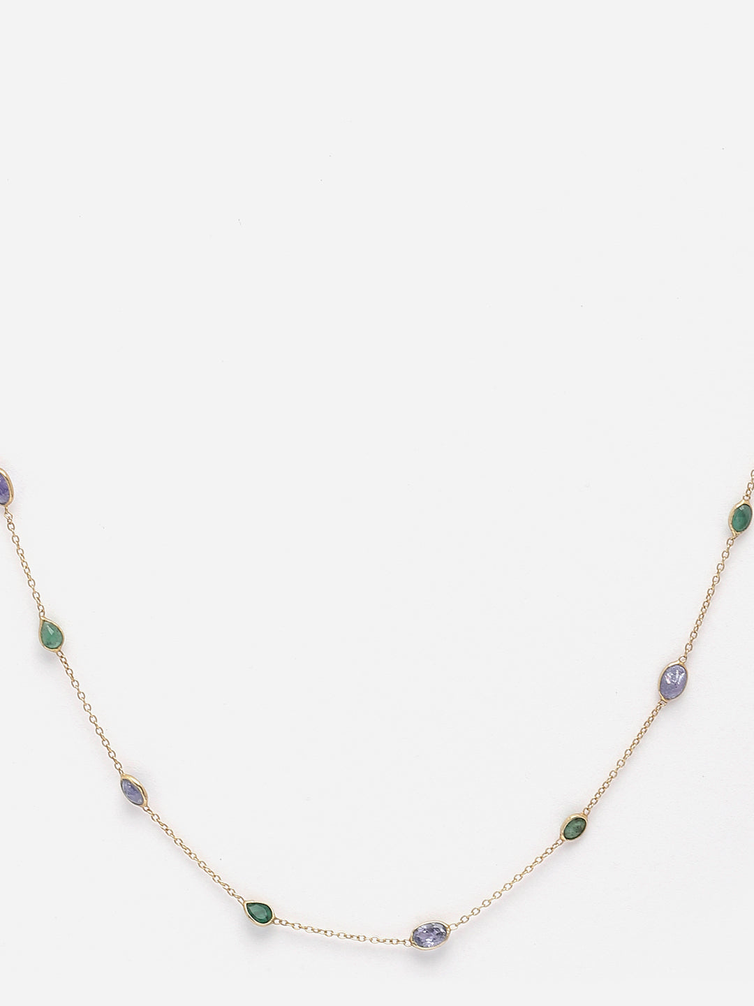 Silver station necklace with facetted tanzanite and emerald. Gold plated. Lobster hook closure.